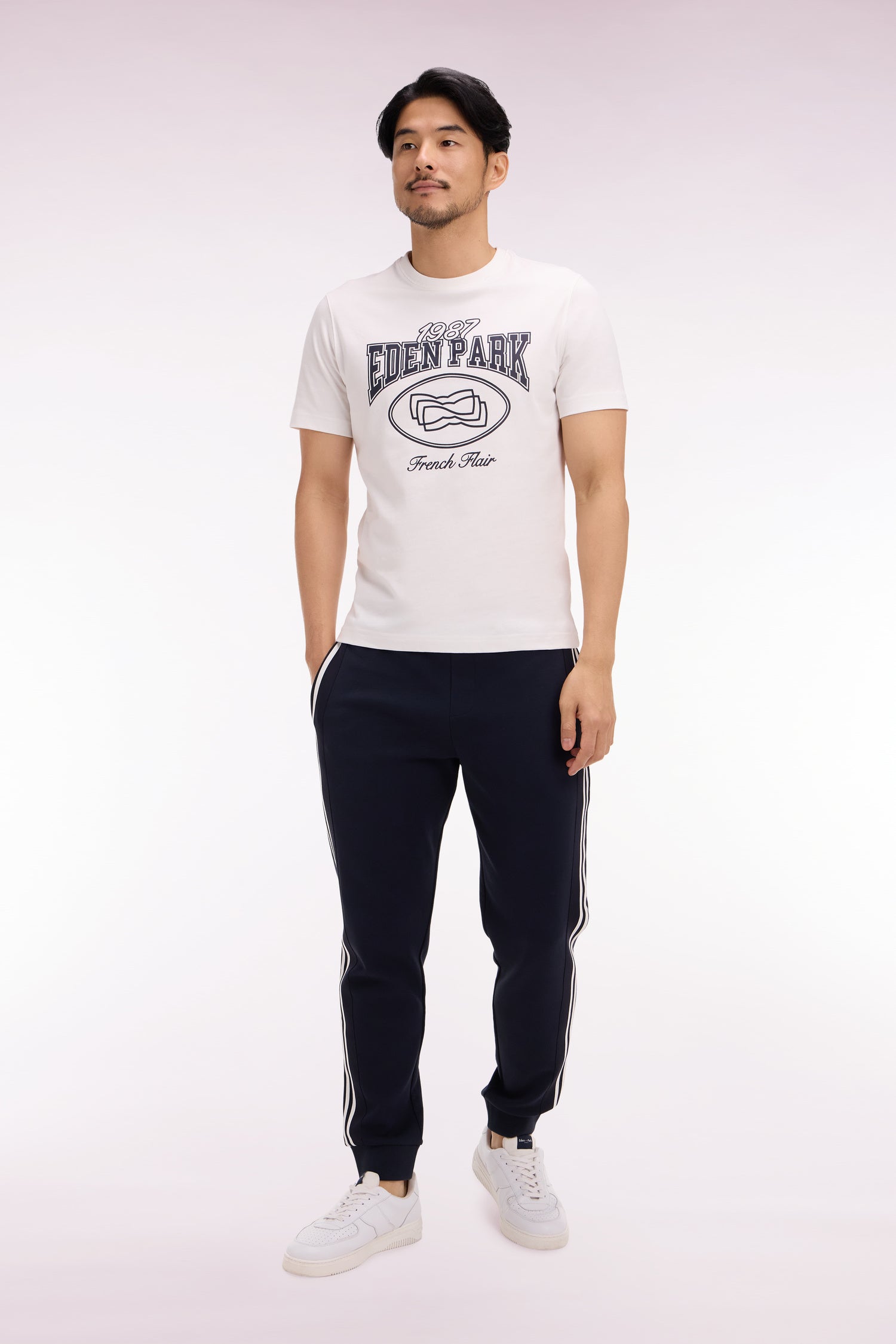 Notre jogging homme en molleton marine est rehaussé de découpes contrastées le long de la jambe. Sa coupe droite, sa taille élastique avec cordons de resserrage siglés, et son badge gomme en font une pièce sportive parfaite pour une tenue de détente travaillé, porté seul ou avec un sweatshirt.