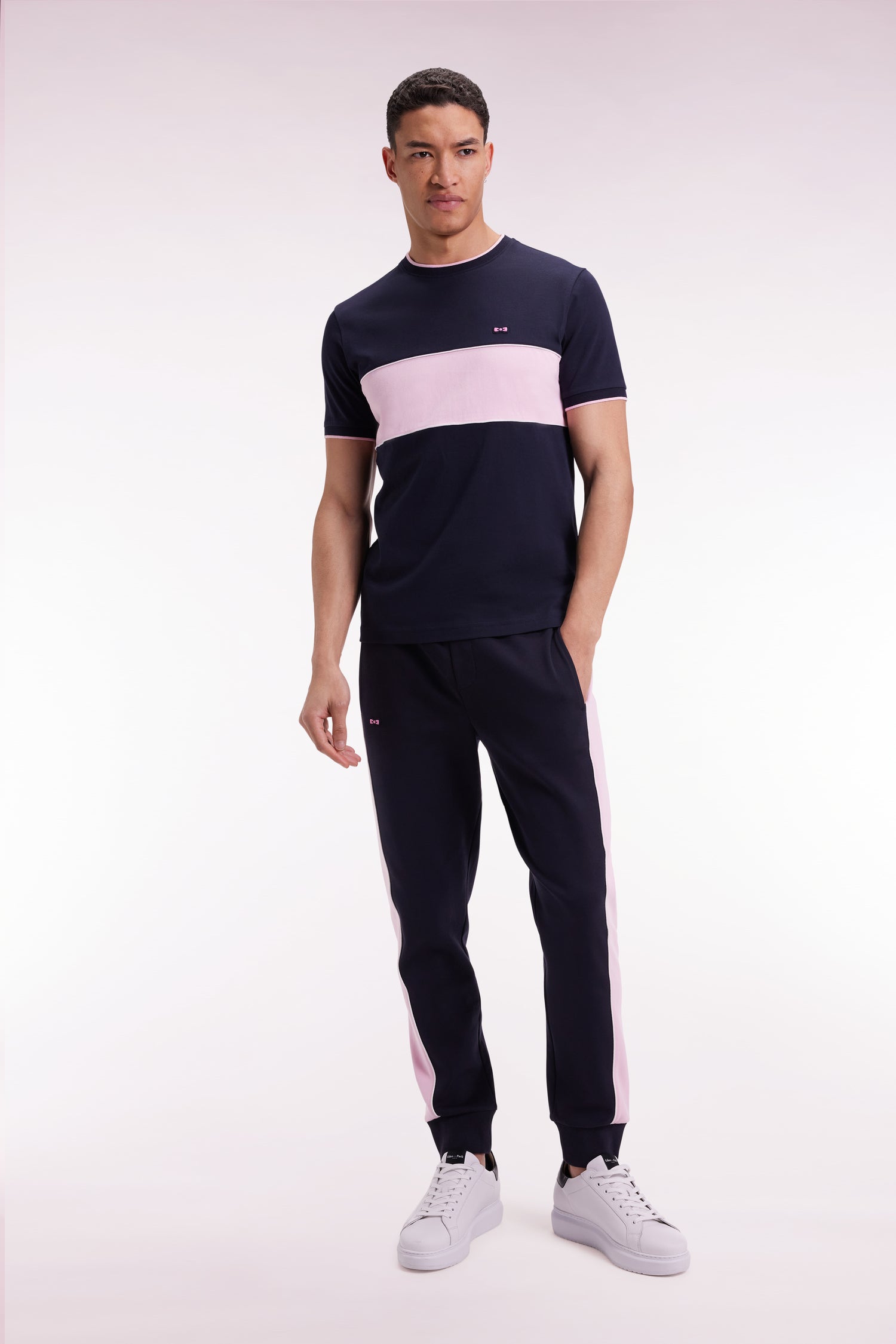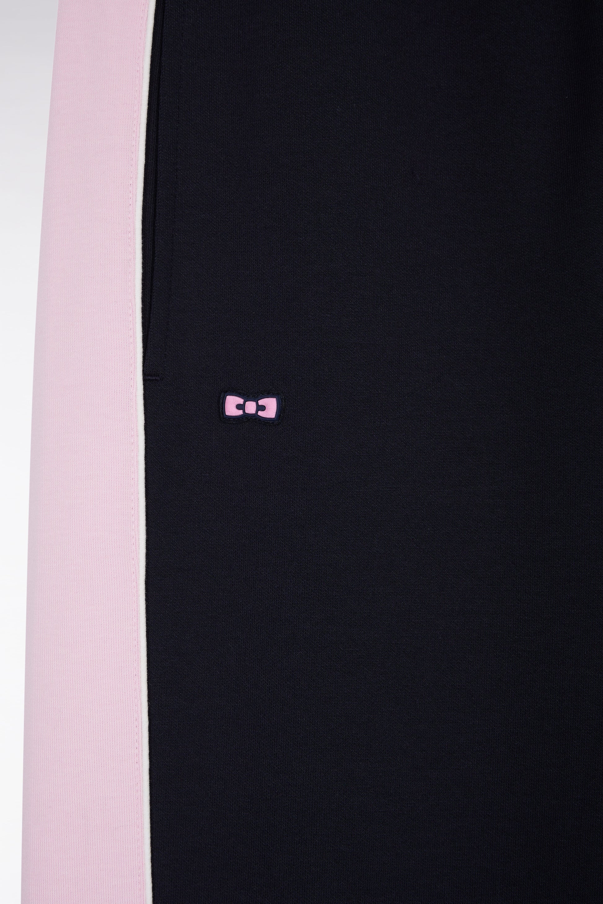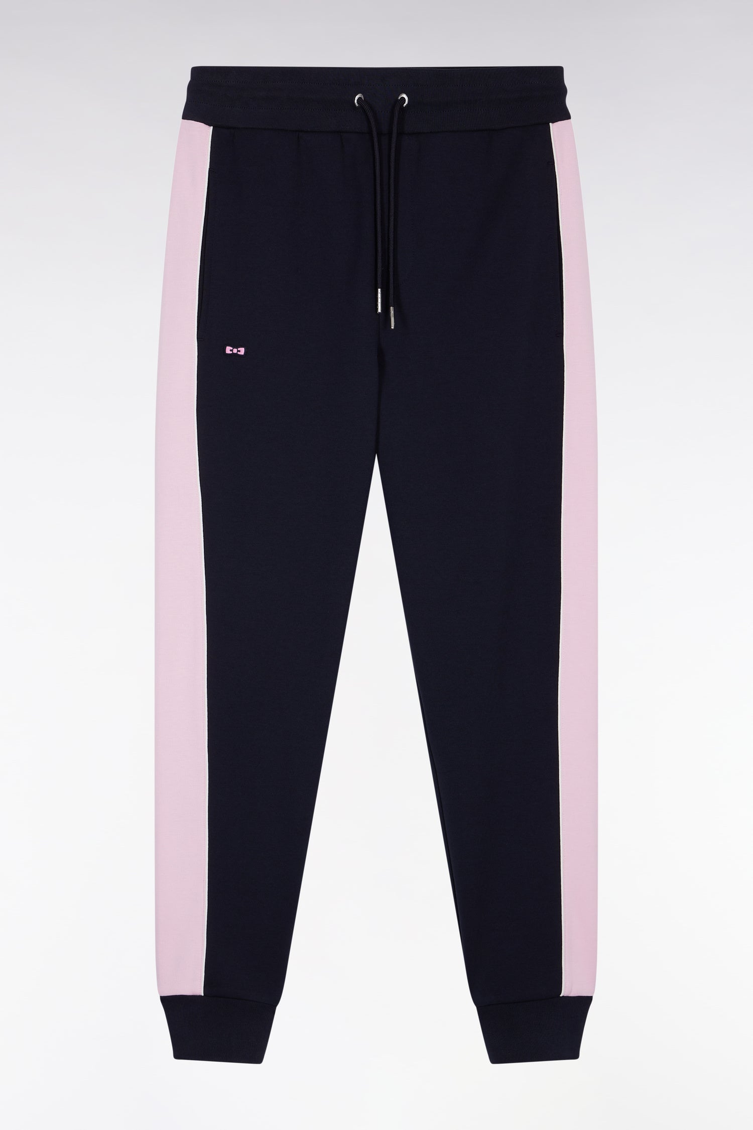 Appreciate the subtle play of colors in these brushed cotton joggers, whose pink side stripes, highlighted by white piping, contrast elegantly with the navy fleece body. A graphic, comfortable model with a perfect fit, thanks to a sliding waistband and ribbed ankles.