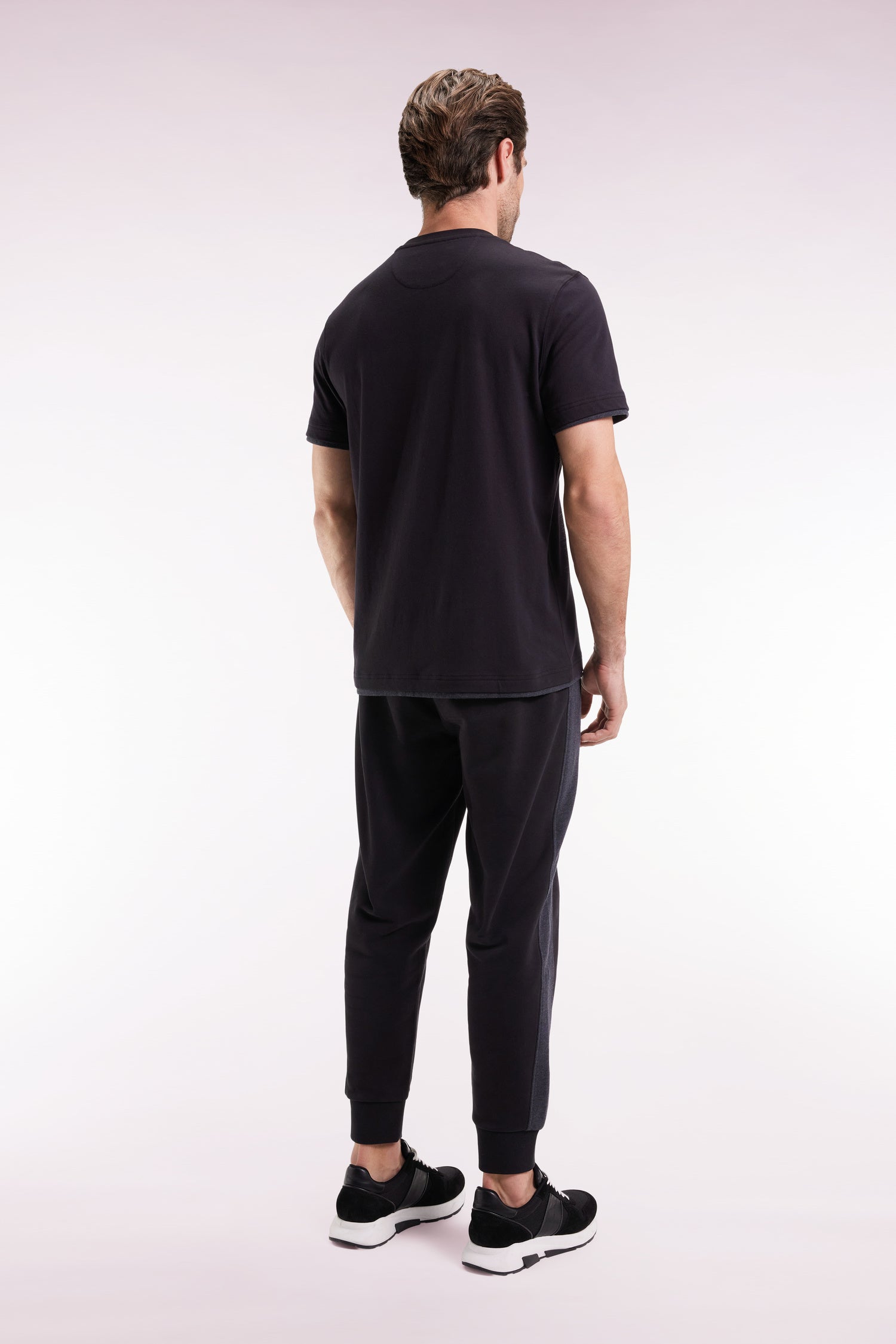 These ankle-length joggers combine comfort and style. Made from black cotton fleece, they feature grey side stripes and New Zealand crest embroidery. The injection-molded drawstring with Eden Park logo, shiny metallic trim and rib-knit trims are the hallmarks of a polished, athletic look. Pair with the matching hooded sweatshirt for a trendy urban silhouette.