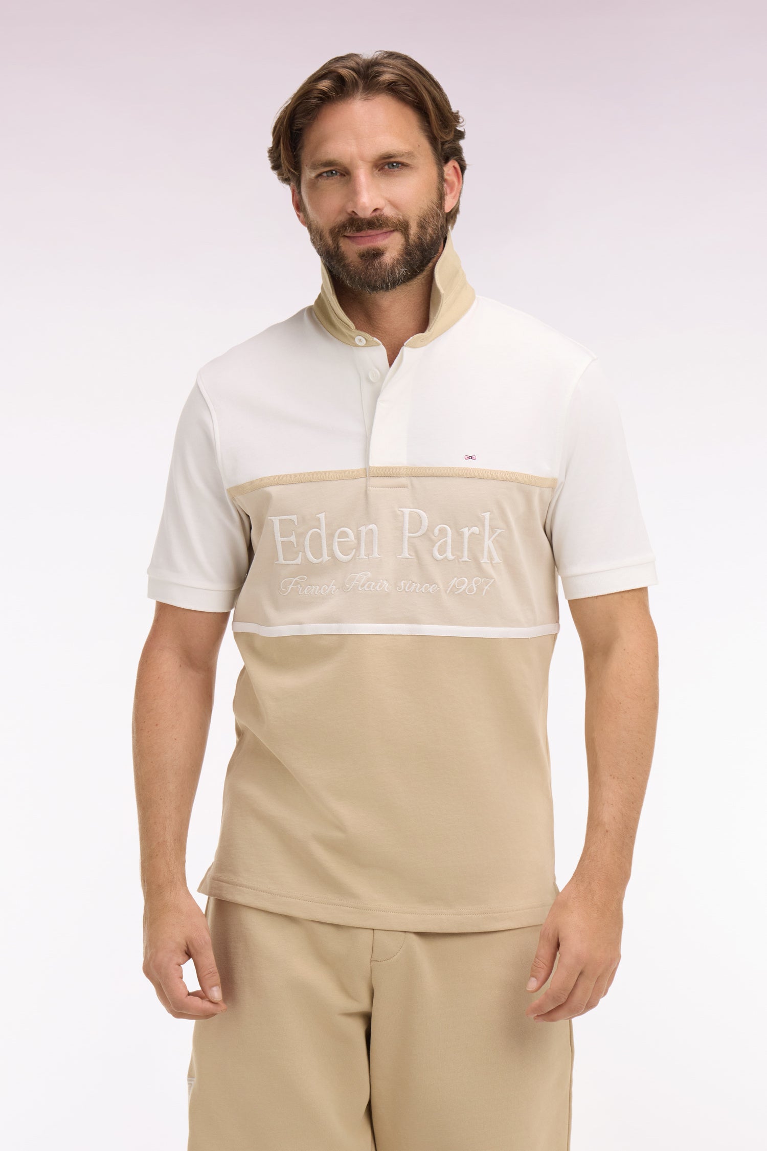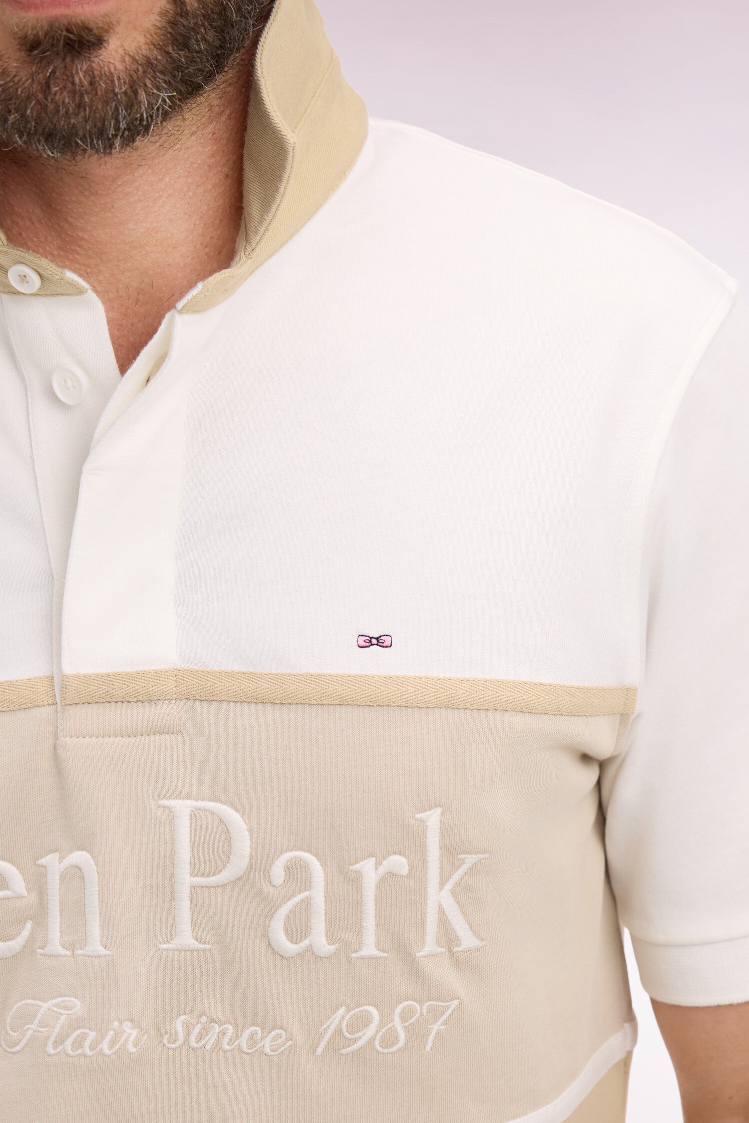 Ce maillot pastel joue sur l’harmonie beige taupe dans une construction rugby réinterprétée. Le col maillot en contraste, la broderie poitrine aux accents rétro sport-chic et les finitions soignées apportent une élégance décontractée. Une pièce lumineuse, idéale pour une silhouette contemporaine conjuguant confort et raffinement sportif.