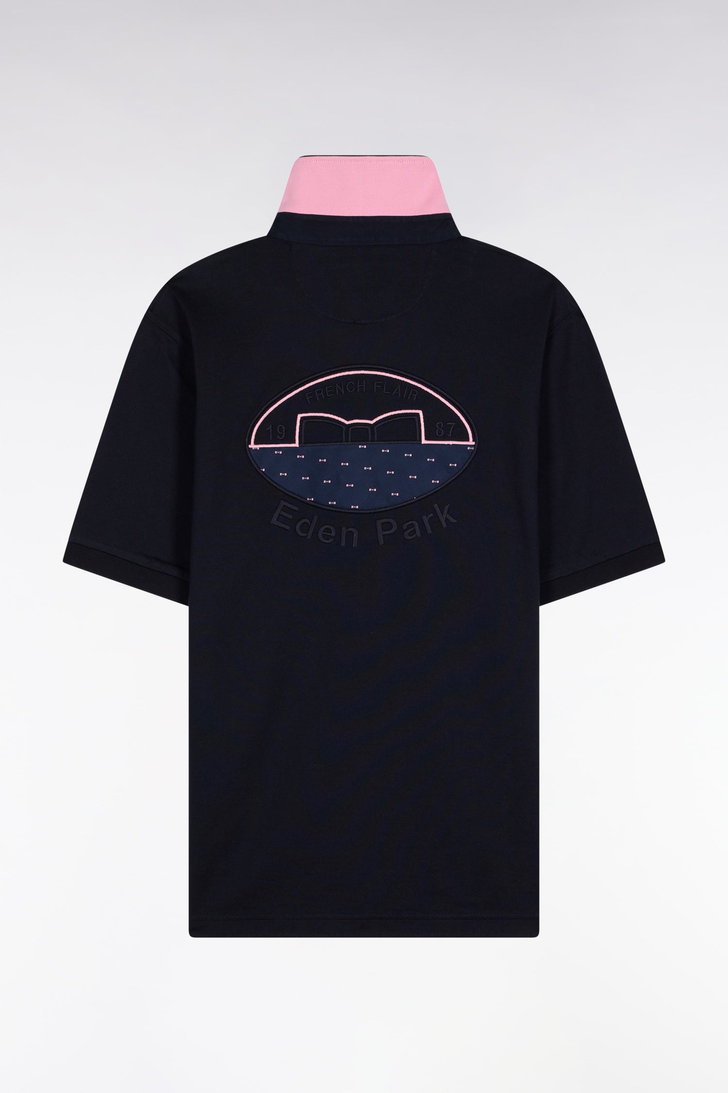 A nod to historic rugby jerseys, this men's short-sleeved model revisits the emblematic stripe of Eden Park jerseys in a combination of pink and navy, our two signature colors. Crafted in soft cotton jersey, the straight cut is enhanced by a jersey collar, embroidered bow tie emblem and hidden button placket for a sporty-chic, everyday look. A large embroidery on the back affirms the personality of this trendy swimsuit, a mainstay of our wardrobe.