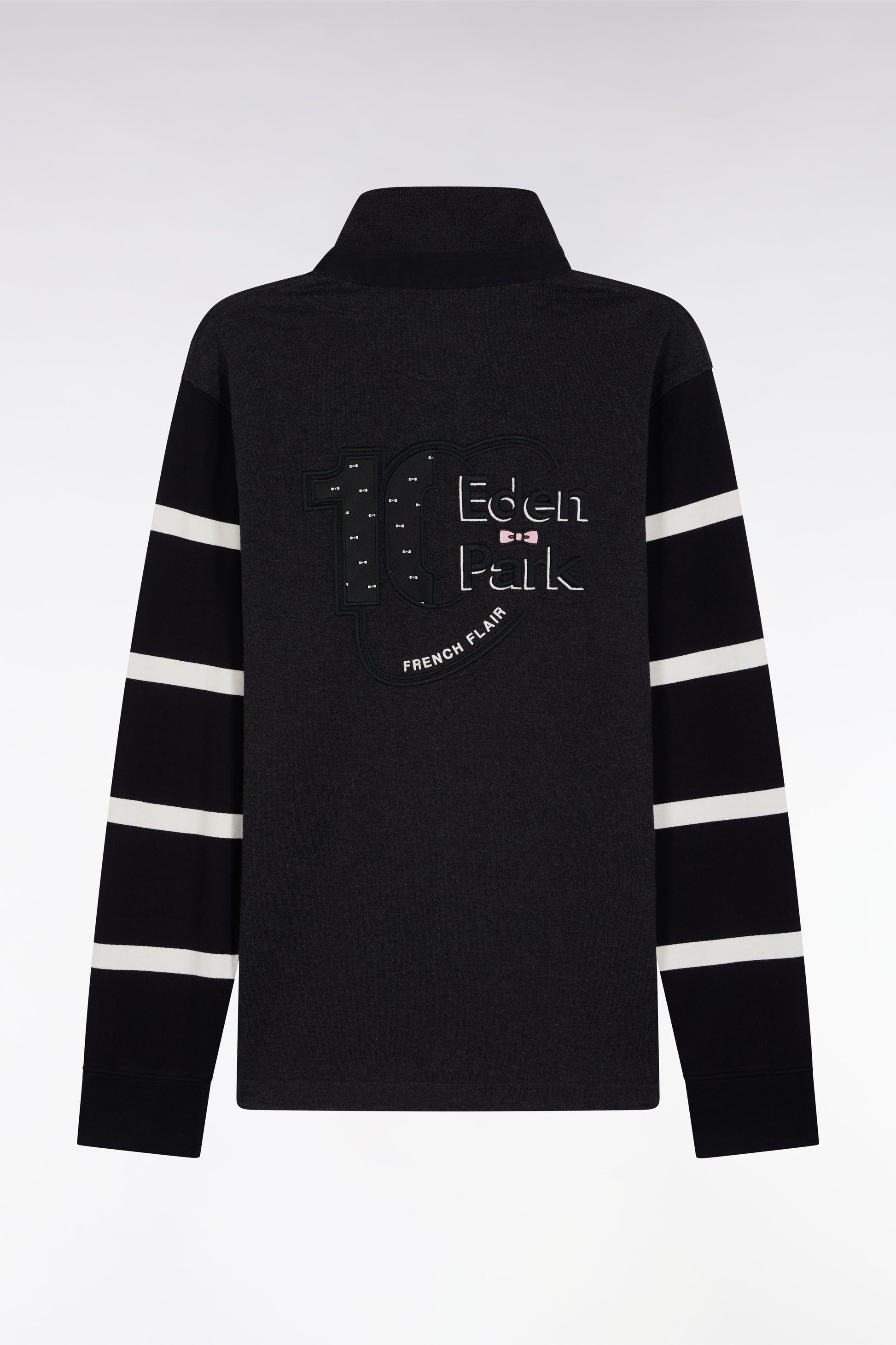Stripes have become a signature of the Eden Park house. Here, they adorn the sleeves of this thick cotton jersey, while the back is adorned with spectacular exclusive embroidery enhanced by inserts of tie fabric printed with mini bow ties. A sporty-chic essential as fashionable as it is comfortable