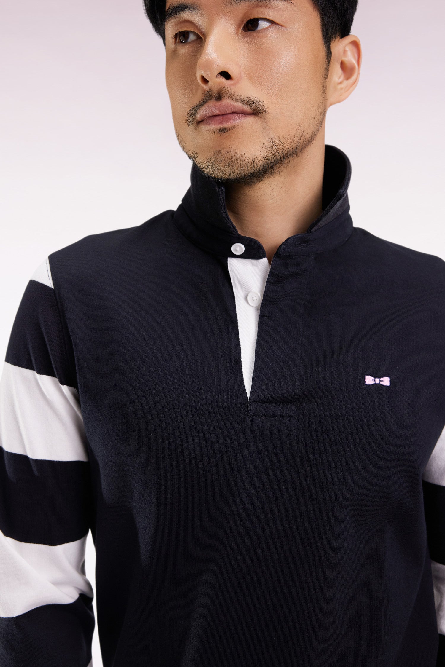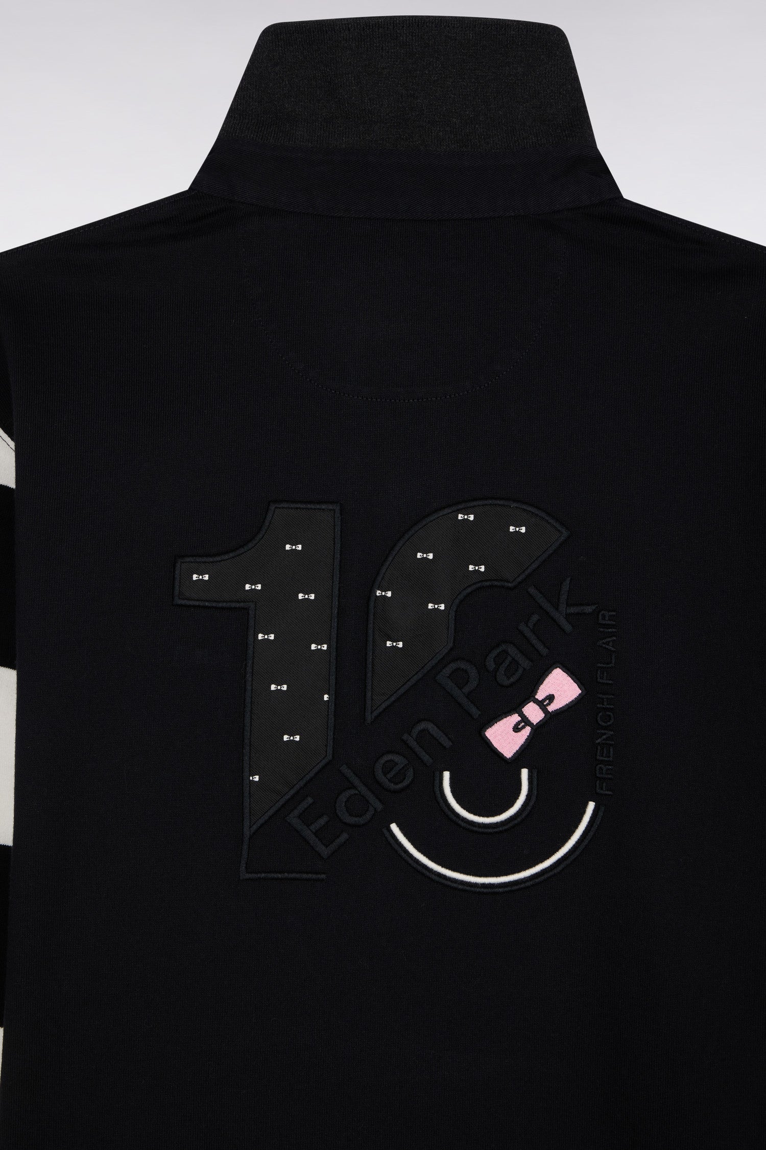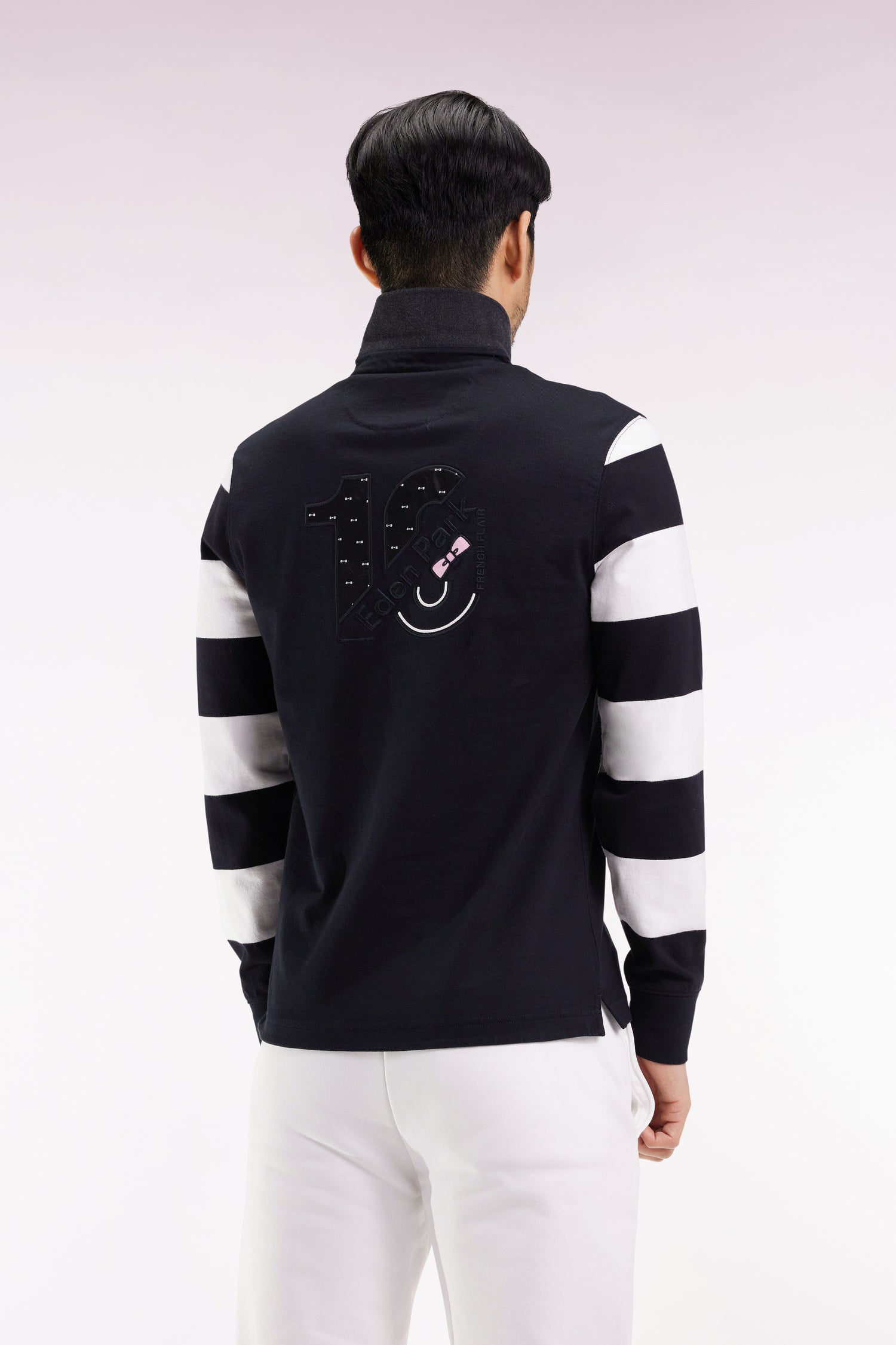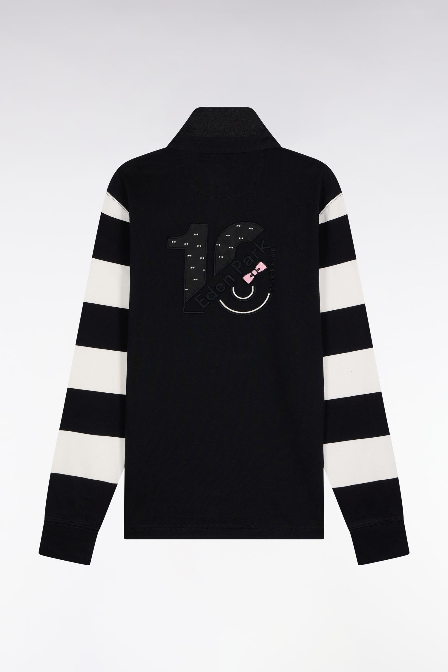 Inspired by traditional rugby jerseys, this long-sleeved urban model in brushed fleece features contrasting stripes on the sleeves and embroidery on the back with printed tie fabric inlay. A strong, comfortable piece, ideal for assertive style in your moments of relaxation.