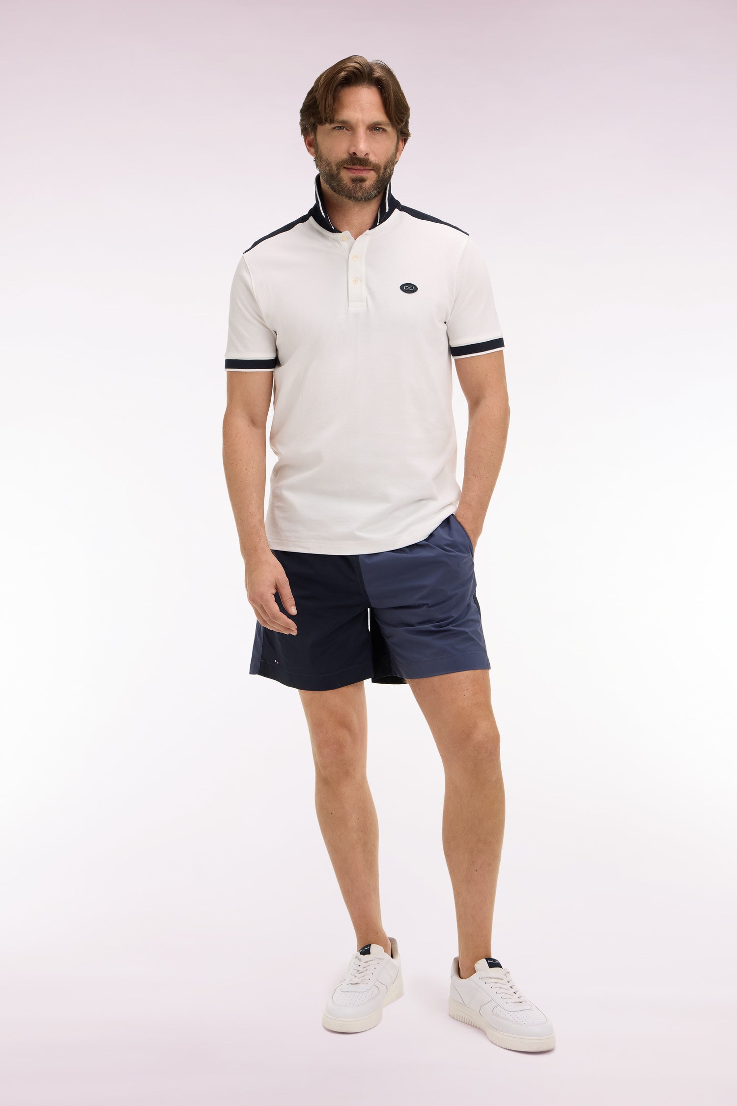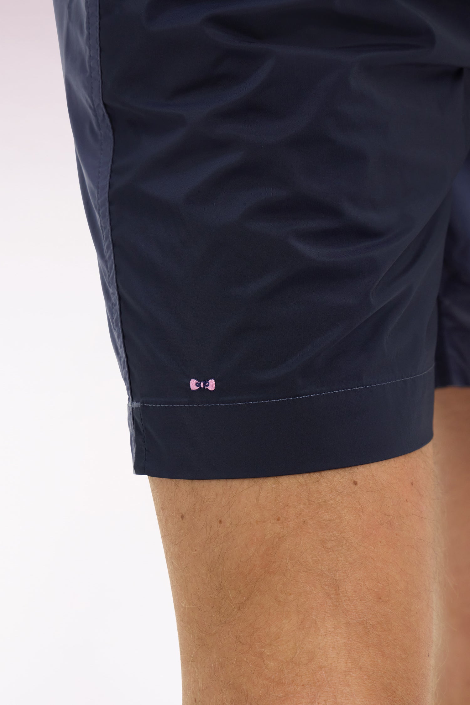Ce maillot de bain bicolore réalisé présente une jambe marine et l'autre légèrement contrastée dans les mêmes tonalités, une touche graphique inspirée à notre Maison par les maillots de rugby japonais. Il dispose d’une poche arrière passepoilée avec fermeture velcro, d'un filet ultra fin et arbore notre inimitable broderie nœud papillon rose sur la jambe.