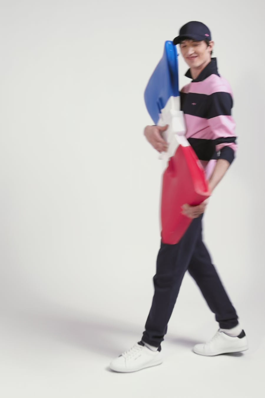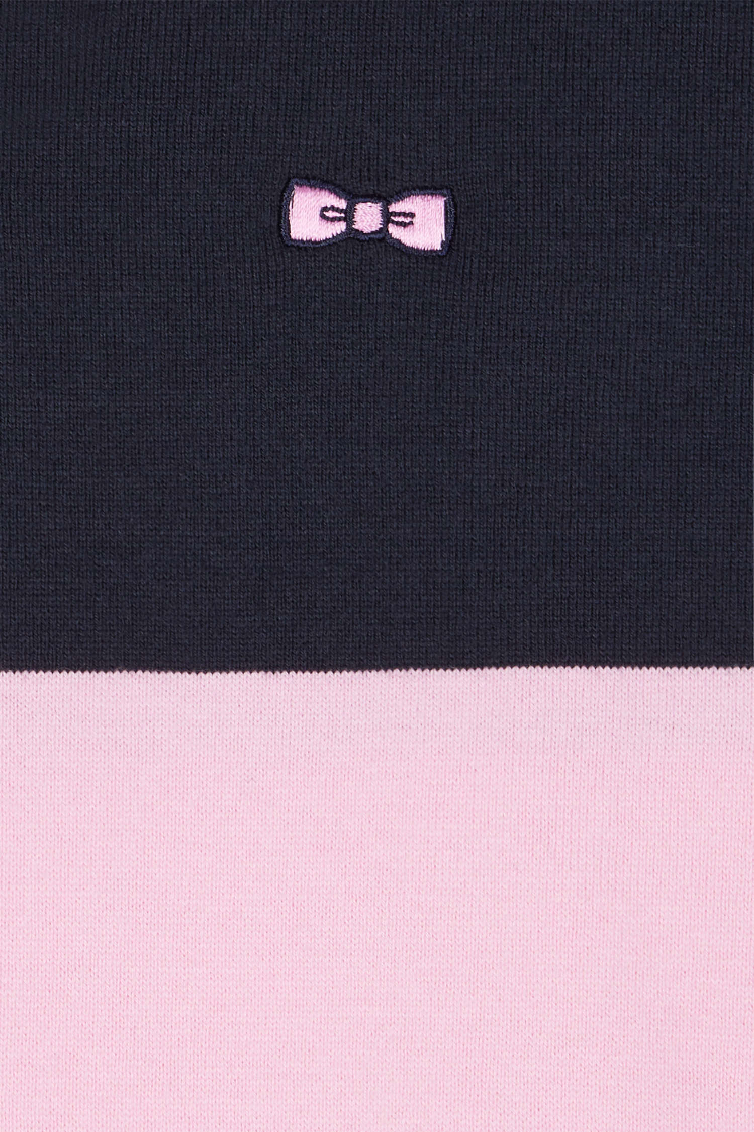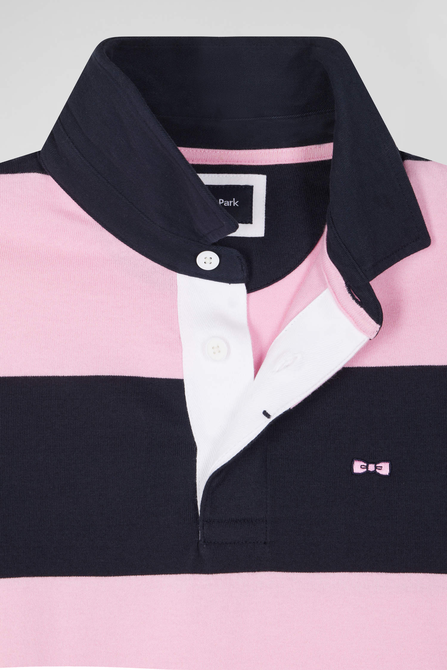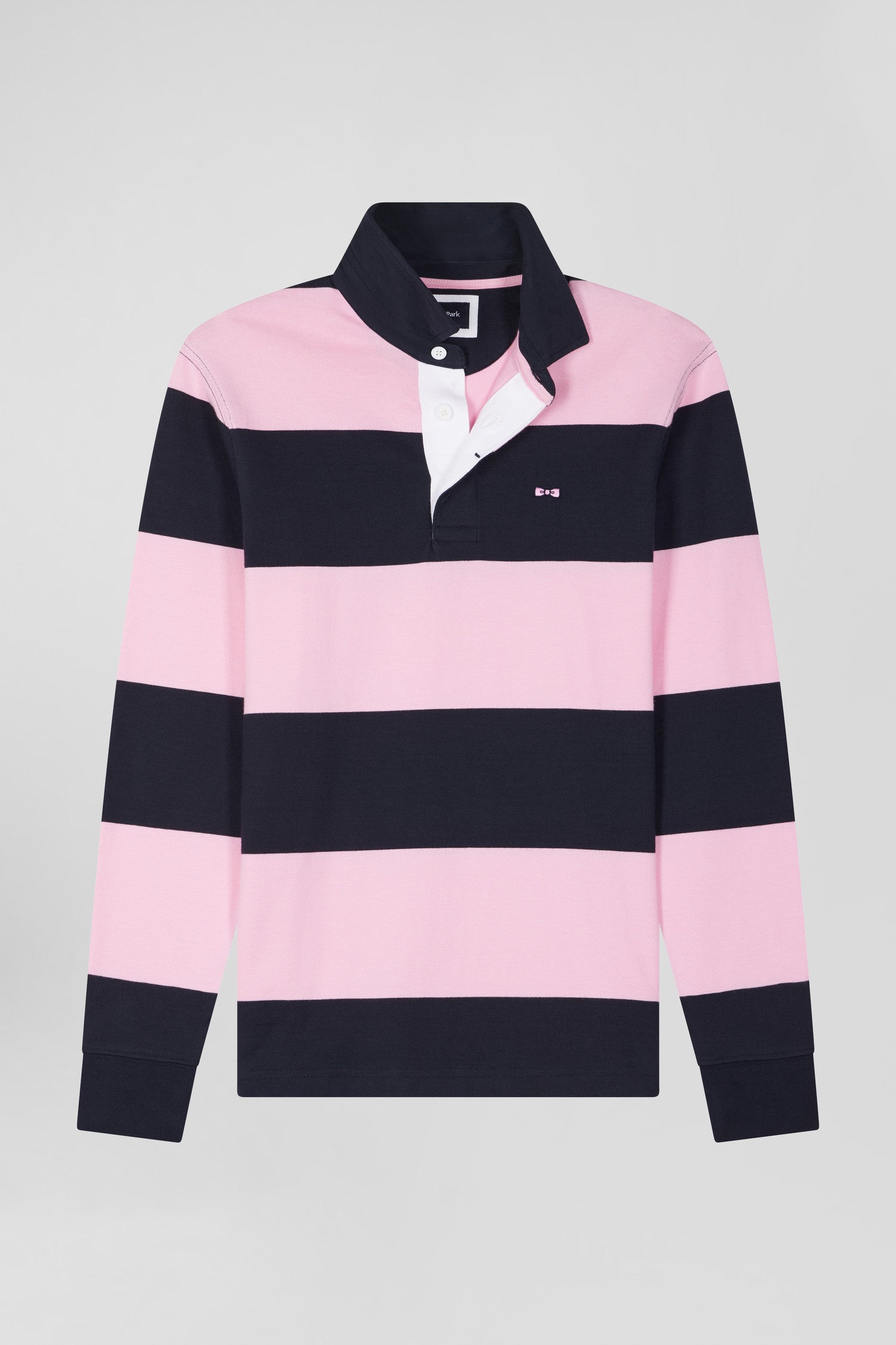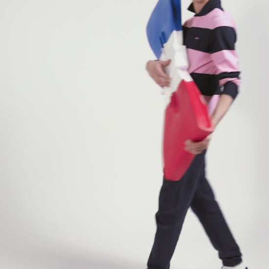 Borrowing from rugby's emblematic codes, this cotton jersey jersey features navy and pink banding, our House's colors of choice. With its oval rugby buttons and bow-tie embroidery, this soft cotton jersey is an ideal choice for days when style and comfort are a must.