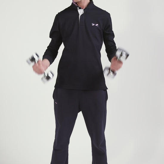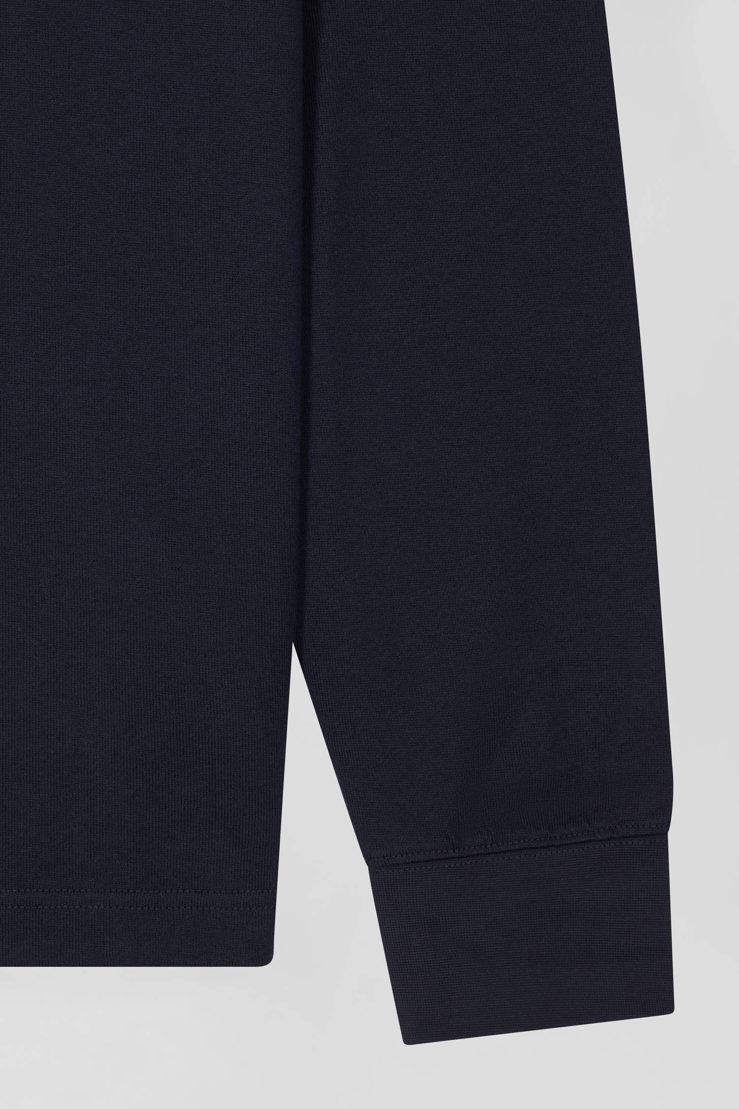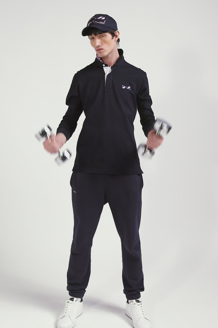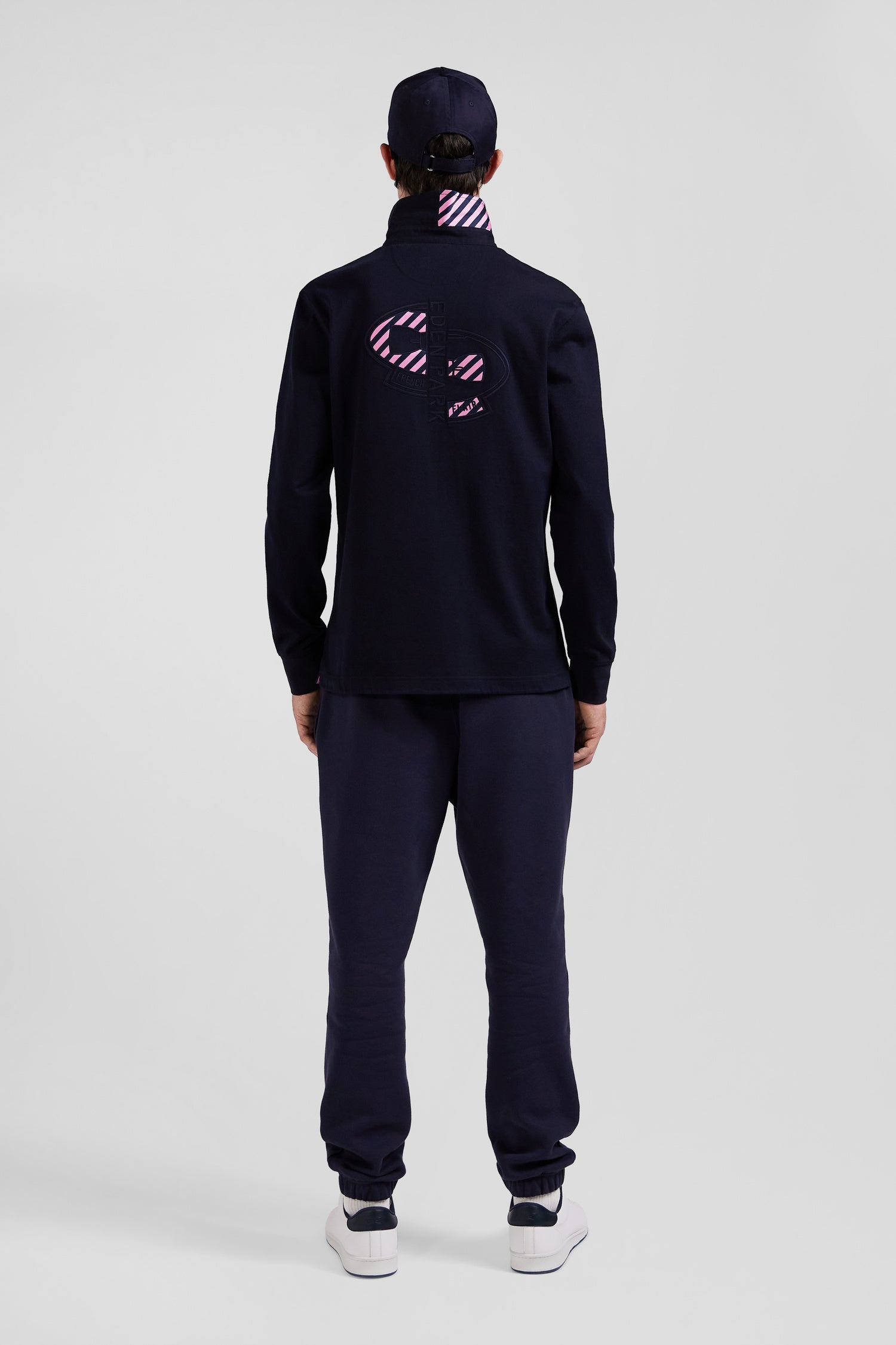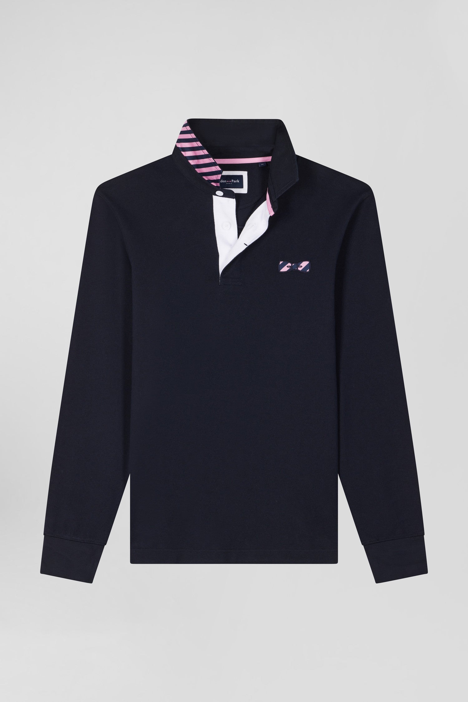 This men's jersey, with its long sleeves and straight regular fit, combines comfort and style in soft cotton jersey. The polo collar, half of which is lined with a hooped tie fabric, and its emblematic embroidery on the back embody the DNA and French Flair of the Eden Park wardrobe. A subtle reminder, the bowtie embroidery on the chest is slightly more visible and also features the navy and pink stripes so characteristic of the spirit of our collections.