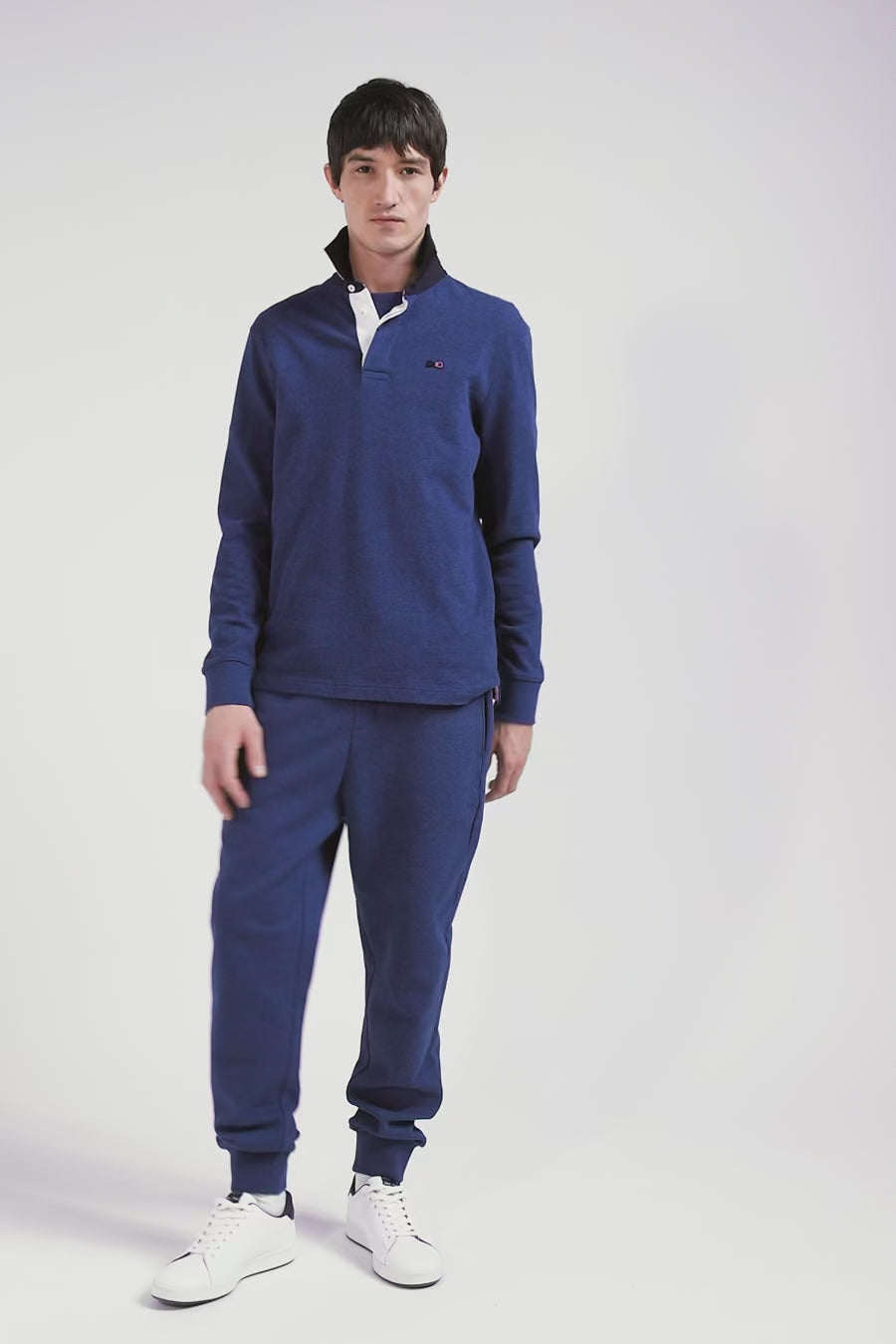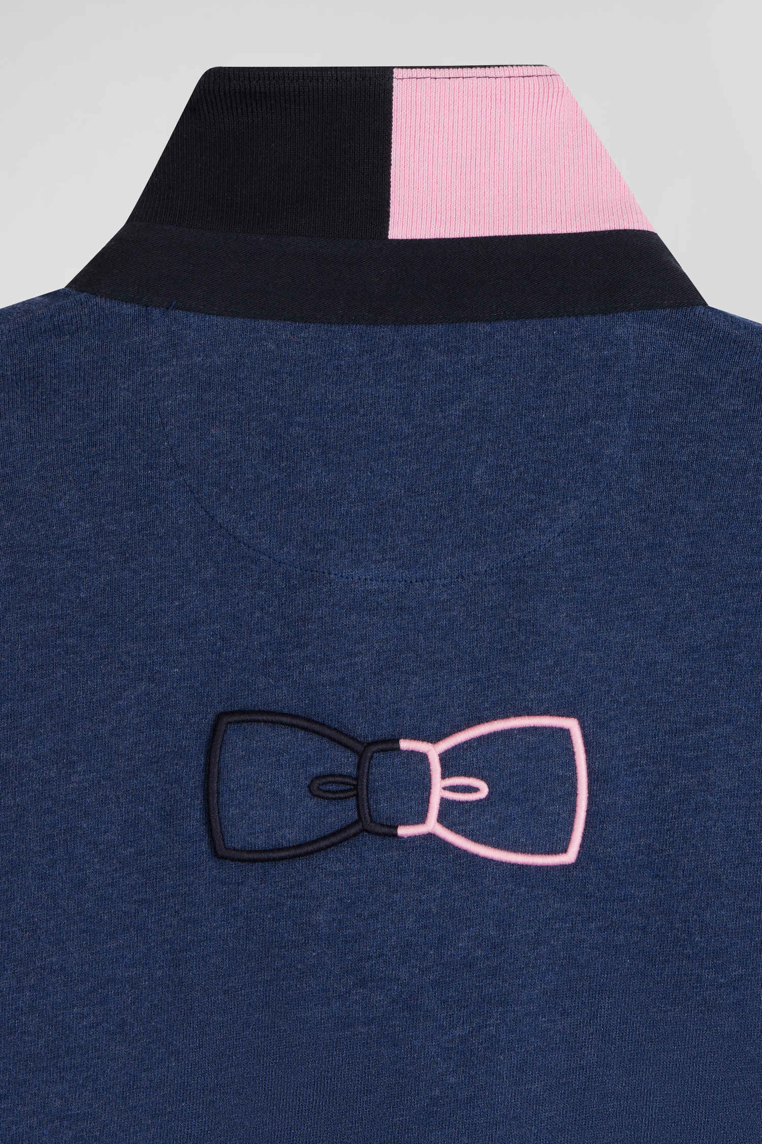 This discreetly elegant long-sleeved men's jersey, with its tricolored ribbon collar enhanced by a pink cotton twill underside, is enhanced by a large embroidery on the back featuring a tricolored bow tie, the Eden Park hallmark also used on a rubber badge on a felt base to adorn its bib. A harmonious blend of colors and high-quality materials gives this masculine piece a refined yet sporty allure.