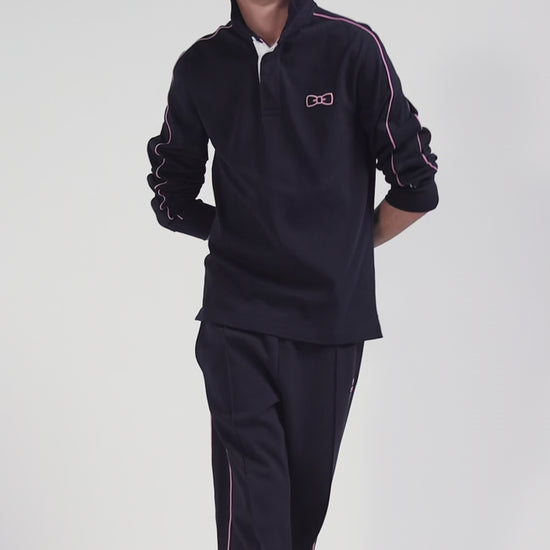 Regular navy blue long-sleeved cotton rugby shirt with pink piping