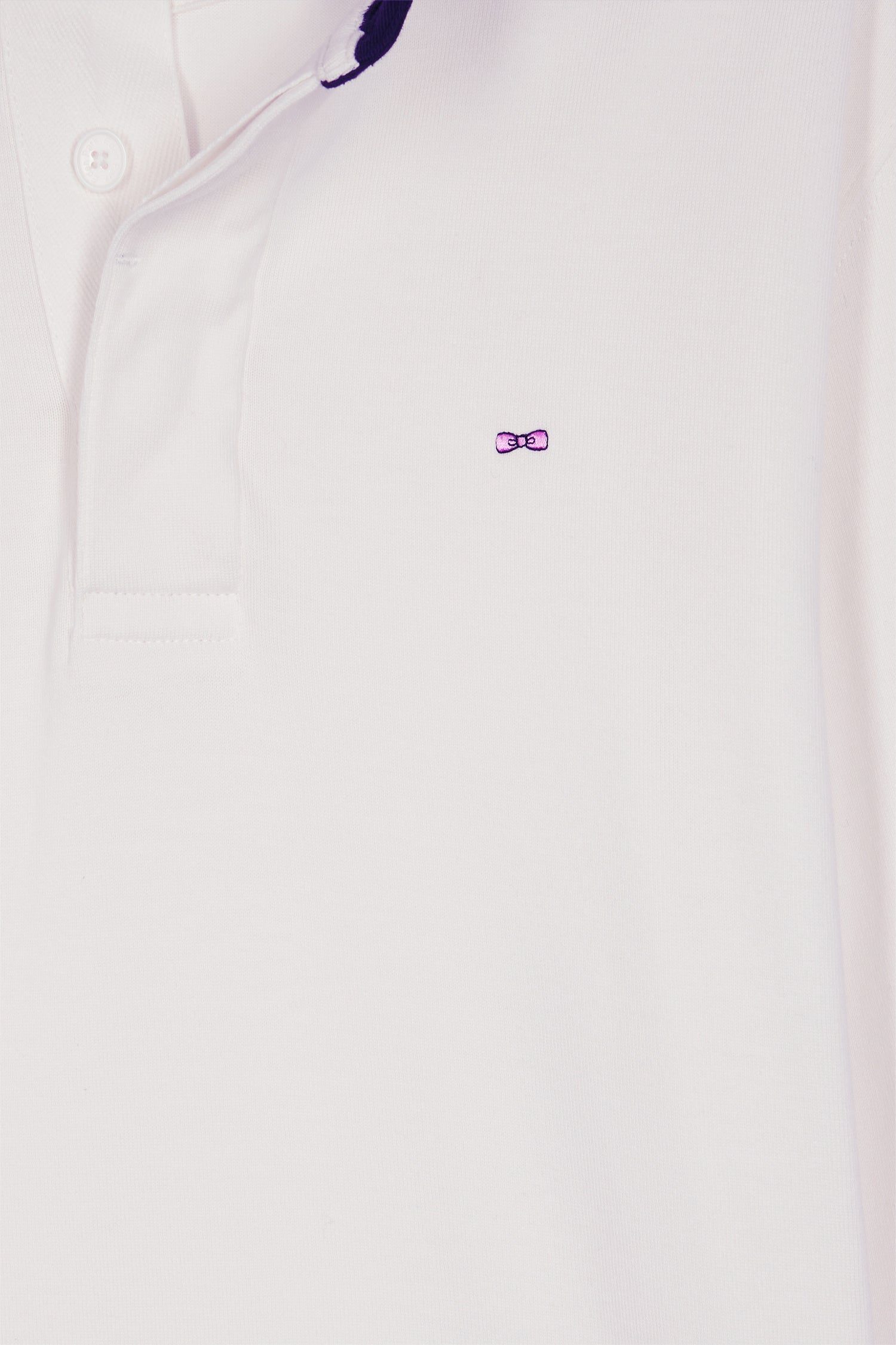 4-thread-count Pima cotton jersey and a straight cut finished with flat-knit ribbing give this long-sleeved jersey a long-lasting fit. The white-lined button placket and navy collar provide an elegant contrast, enhanced by a fine stripe under-collar. A comfortable, timeless sport-chic model designed for the modern man.