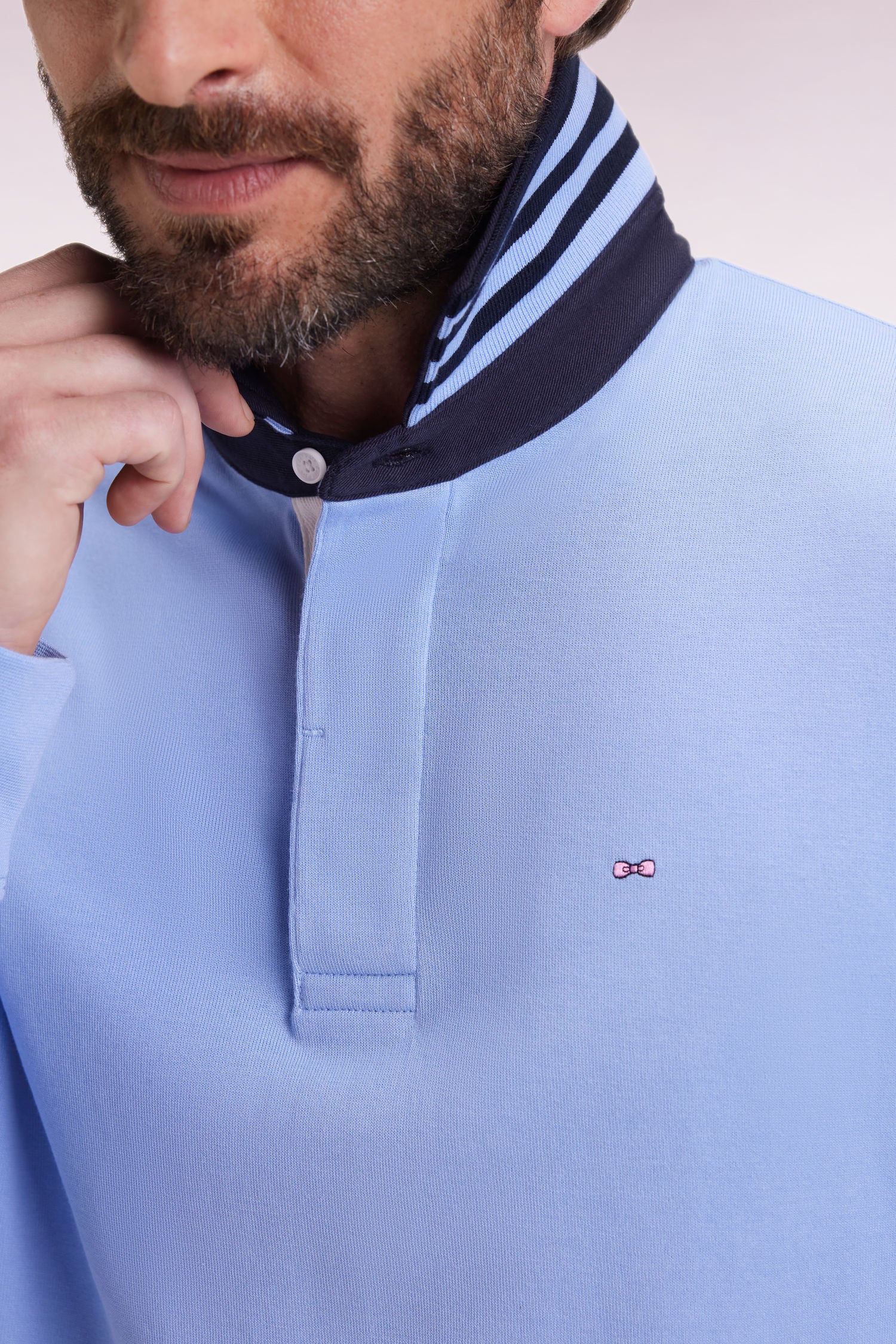 4-thread-count Pima cotton jersey and a straight cut finished with flat-knit ribbing give this long-sleeved jersey a long-lasting fit. The white-lined button placket and navy collar provide an elegant contrast, enhanced by a fine stripe under-collar. A comfortable, timeless sport-chic model designed for the modern man.
