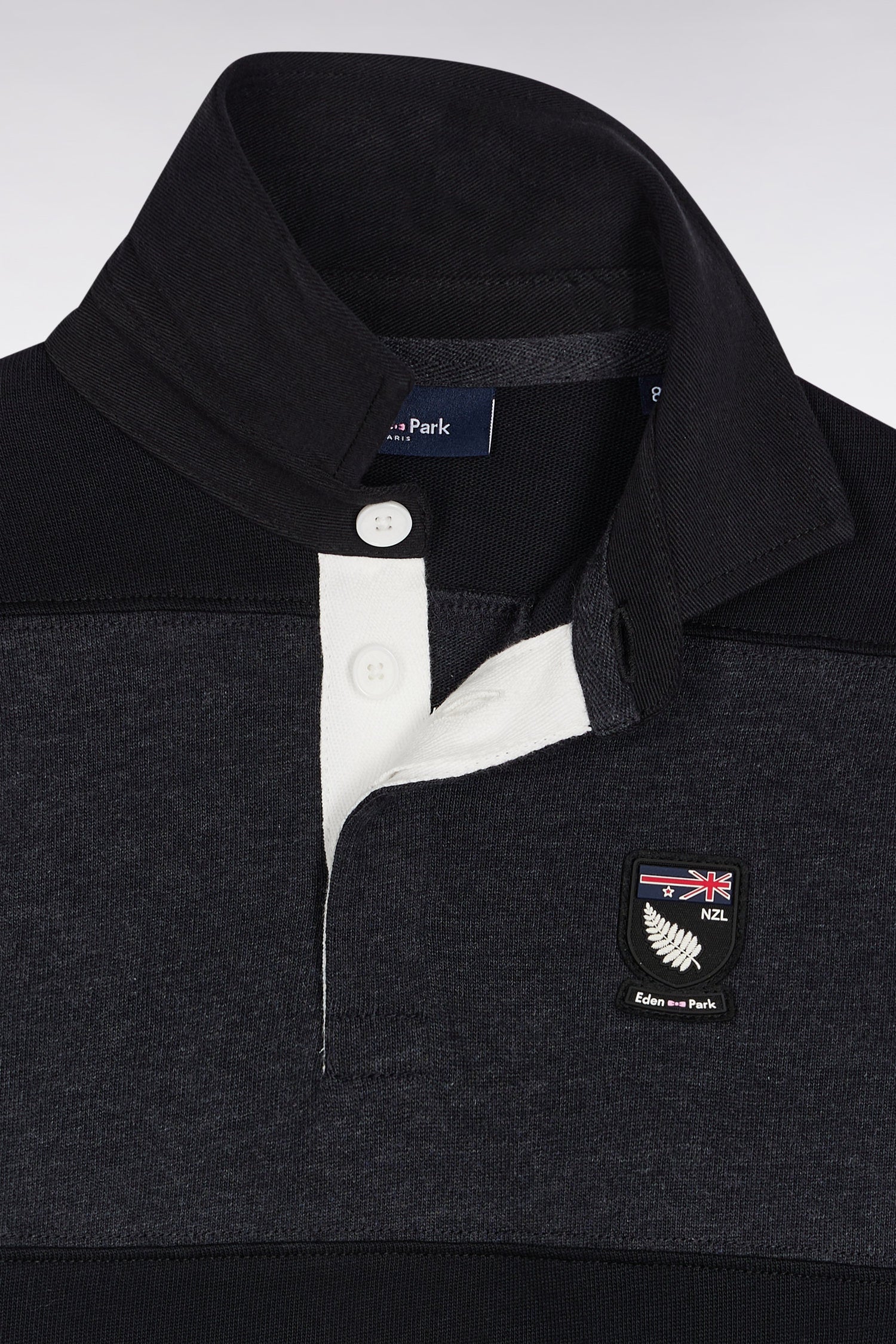 With its black and gray cut-outs reminiscent of rugby jersey stripes, this long-sleeved jersey pays tribute to our company's sporting heritage. Made from soft jersey, it proudly displays an embroidered New Zealand badge on the chest, a nod to this great rugby nation. A collector's jersey for young enthusiasts of style and sport.