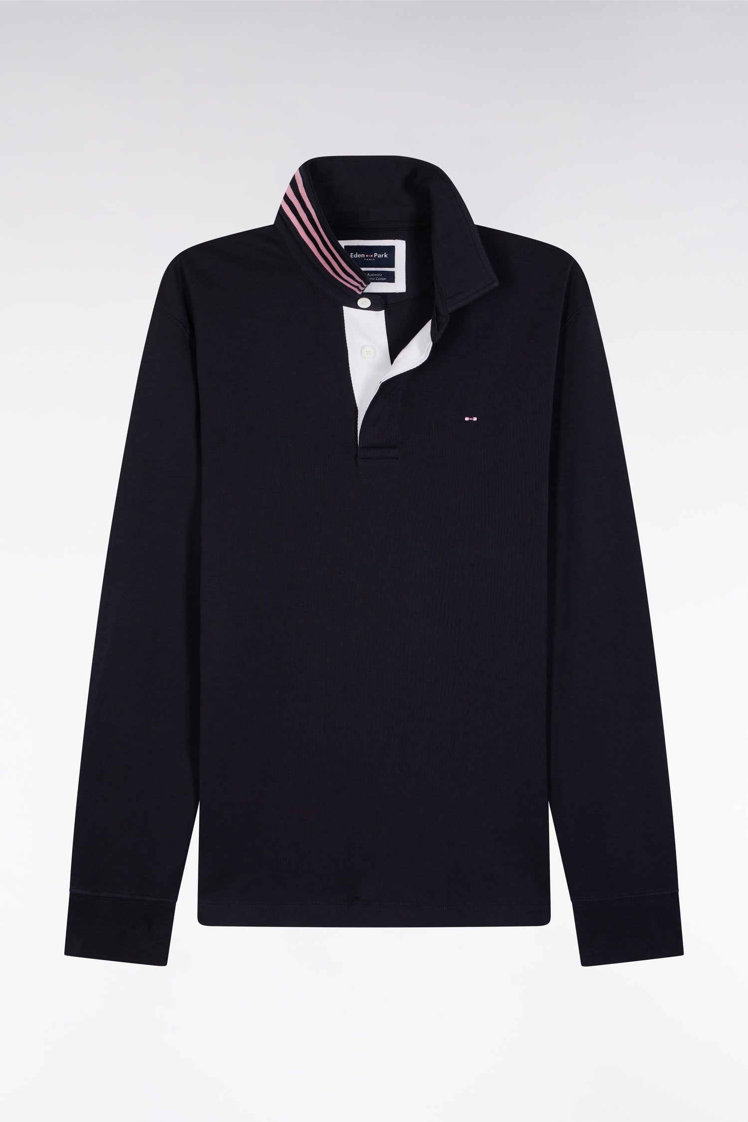 4-thread-count Pima cotton jersey and a straight cut finished with flat-knit ribbing give this long-sleeved jersey a long-lasting fit. The white-lined button placket and navy collar provide an elegant contrast, enhanced by a fine stripe under-collar. A comfortable, timeless sport-chic model designed for the modern man.