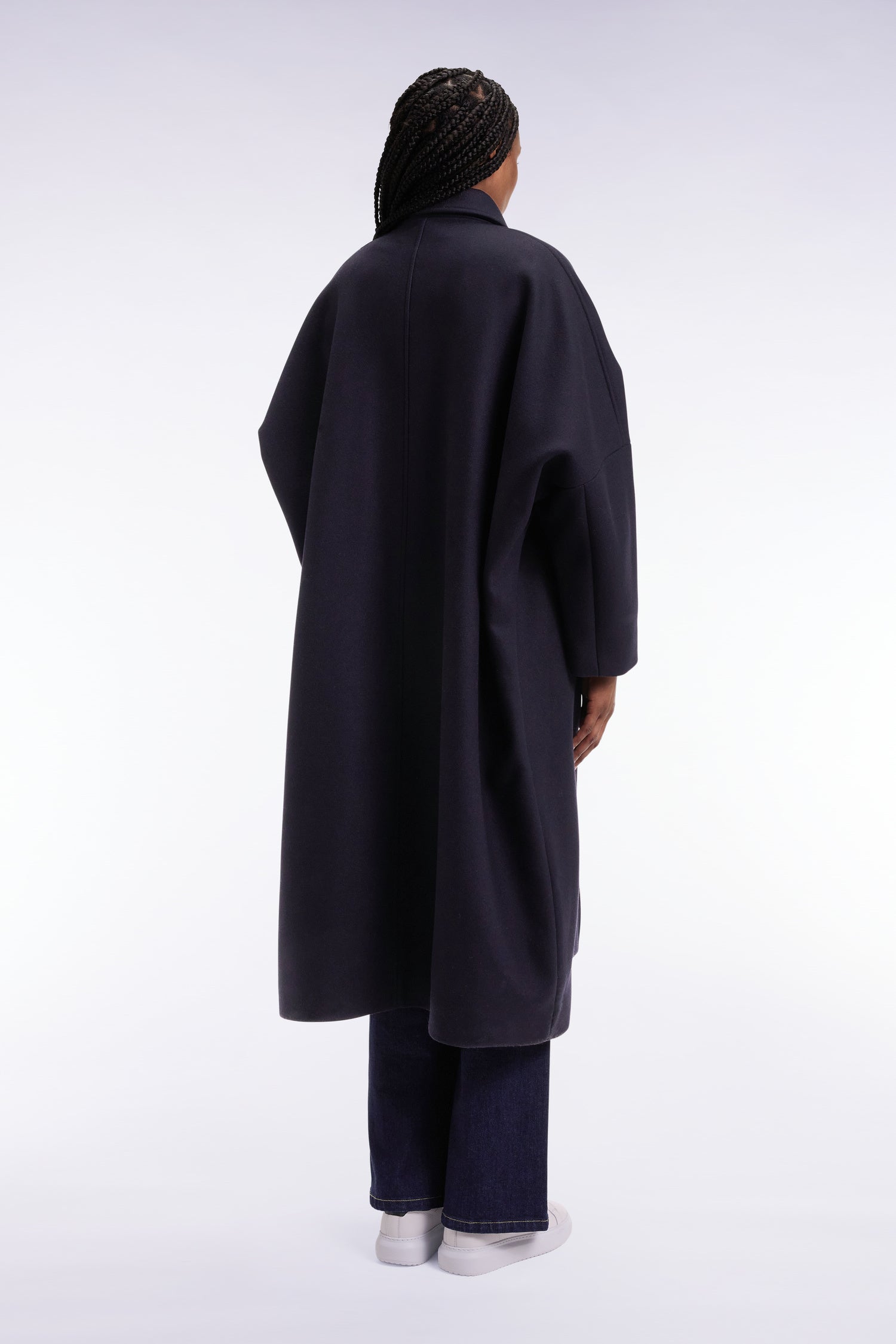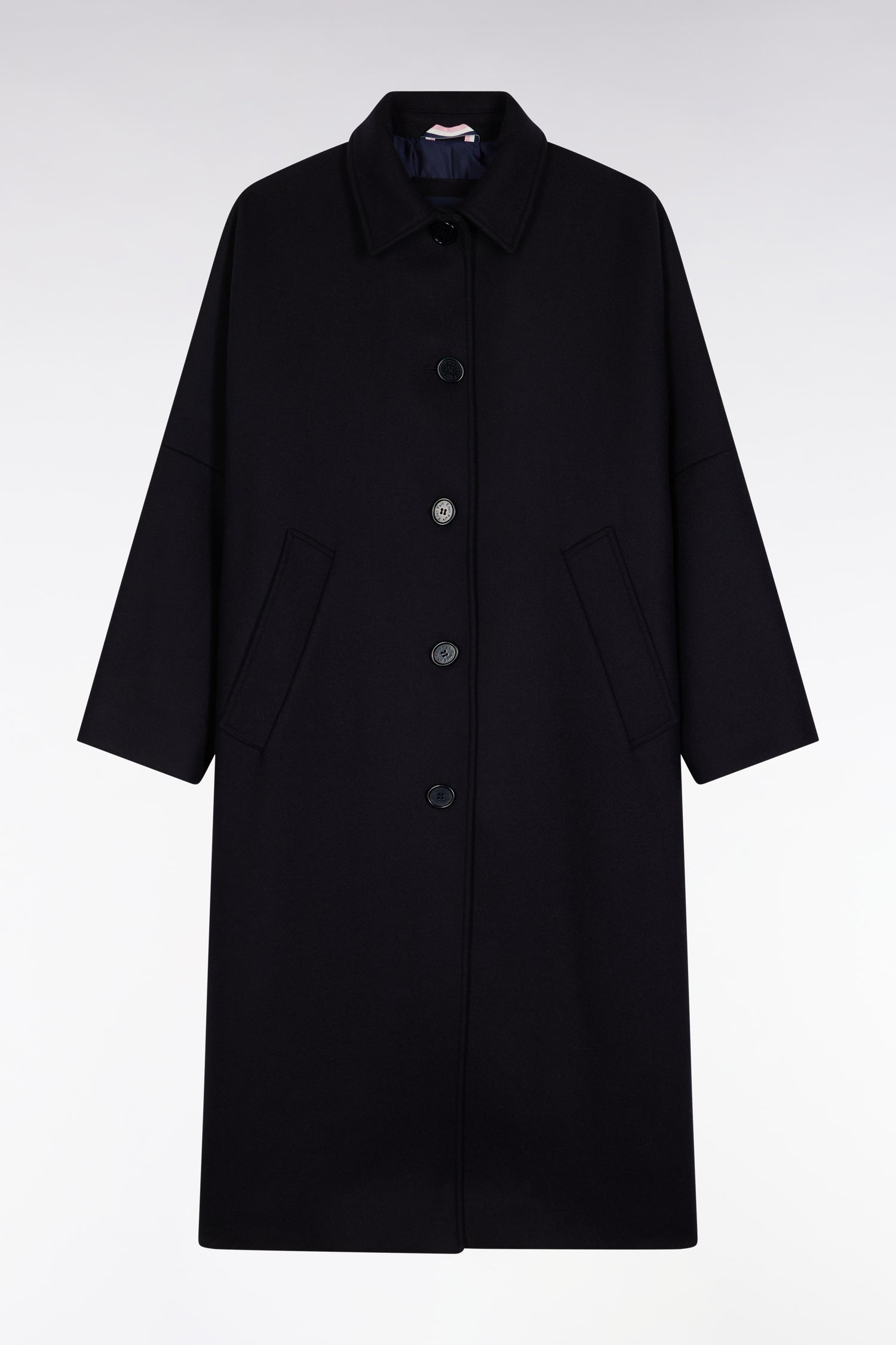 This women's coat in navy double-faced wool twill offers a minimalist, sculptural approach to femininity, thanks to its loose, uncluttered cut inspired by kimonos with batwing sleeves. This pure wool overcoat asserts a sharp, sophisticated style underscored by its low armhole and flared cut. Eden Park's oval buttons punctuate the closure, while the wide pockets underline the graphic sobriety and functionality of this timeless coat that's perfect for curling up in. A powerful piece, designed with precision and respect for Eden Park codes.