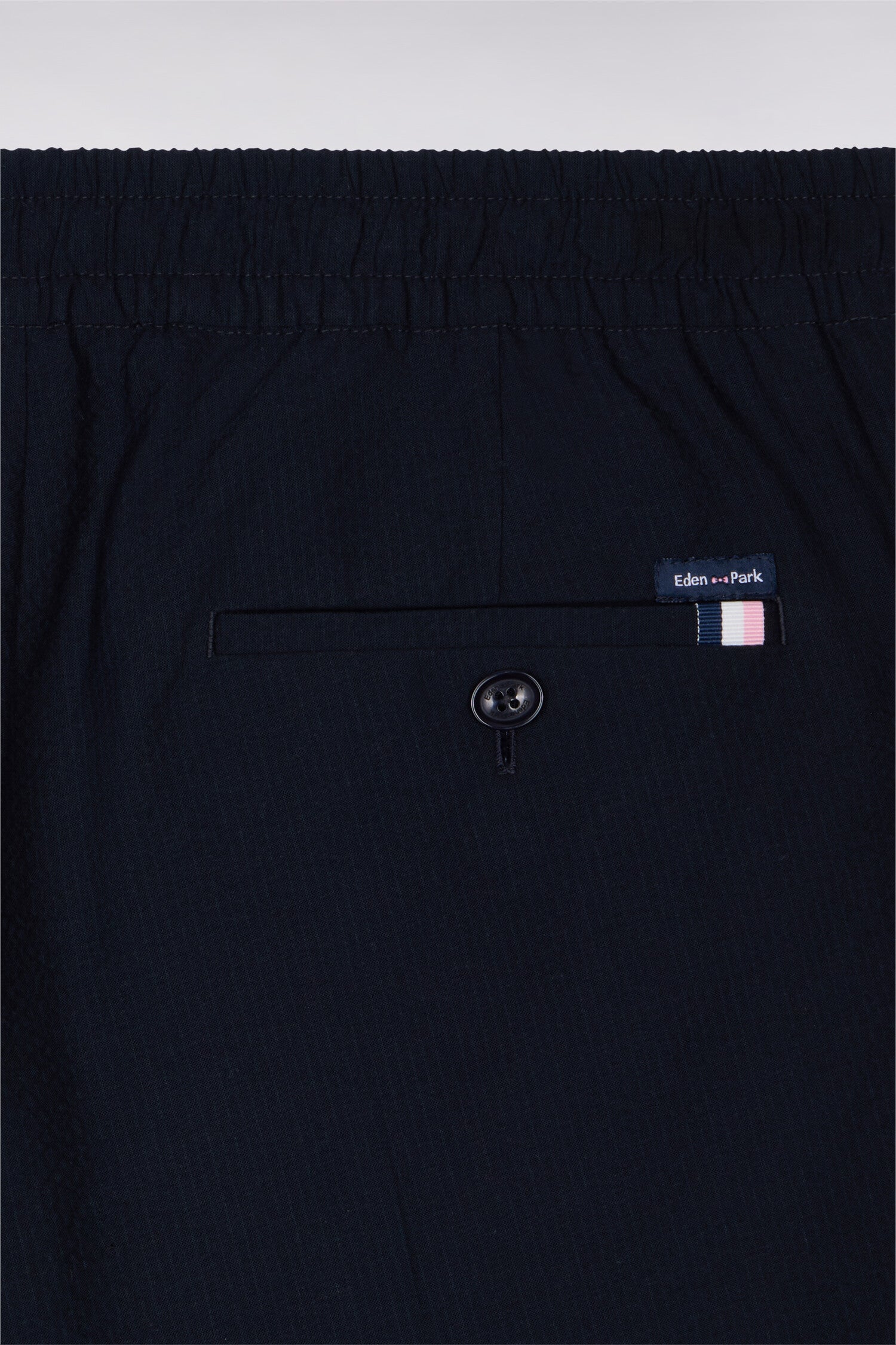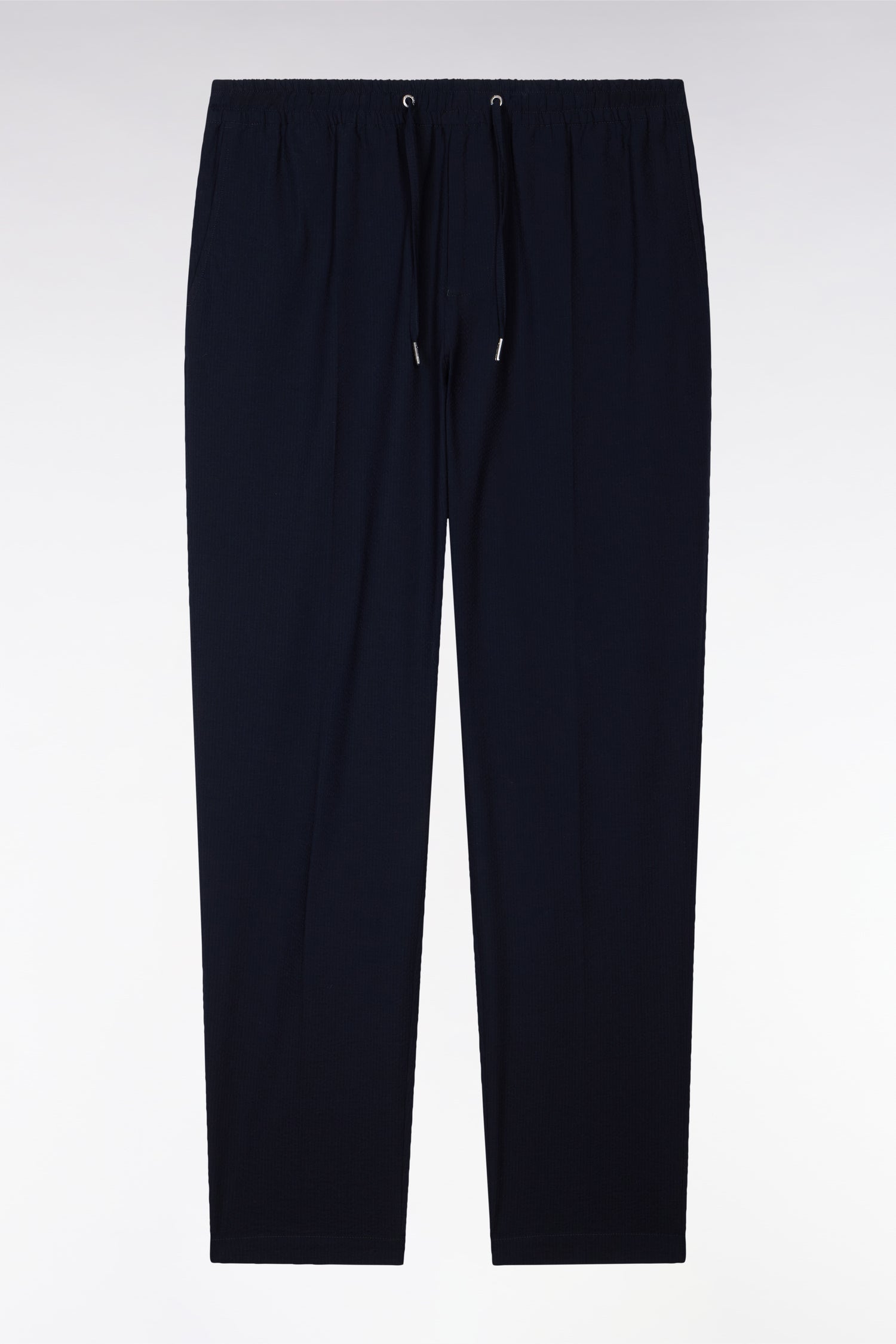 Ce pantalon masculin en coton stretch seersucker marine mise sur une matière légère, texturée et naturellement respirante, idéale pour la belle saison. Sa taille élastiquée et sa coupe légèrement carotte moderne et tendance, assurent un confort durable. Ses finitions signature, ruban ottoman tricolore, cordons en métal argenté et boutons personnalisés soulignent quant à eux son esprit sport chic.
