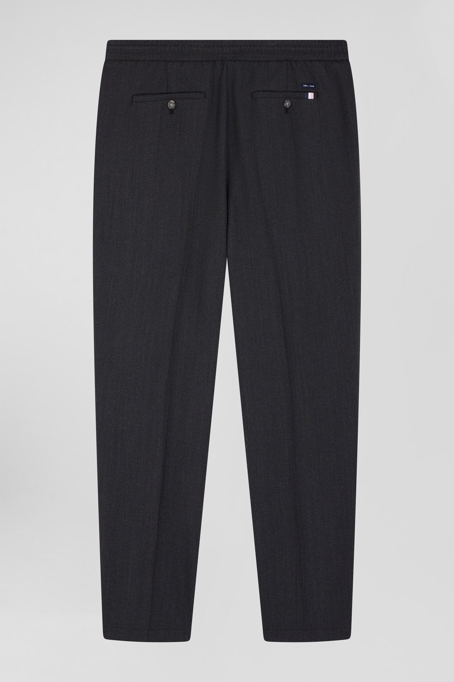 With their elasticated waistband and carrot cut, these men's pants combine elegance and comfort like no other. The wool/cotton fabric is distinguished by its slightly mottled effect, for a more authentic touch suited to the autumn-winter season. With piped back pockets, a button and Eden Park jacron with our tricolor ribbon, these men's pants promise a flattering fit. This timeless piece is available in navy or charcoal gray to match your wardrobe.