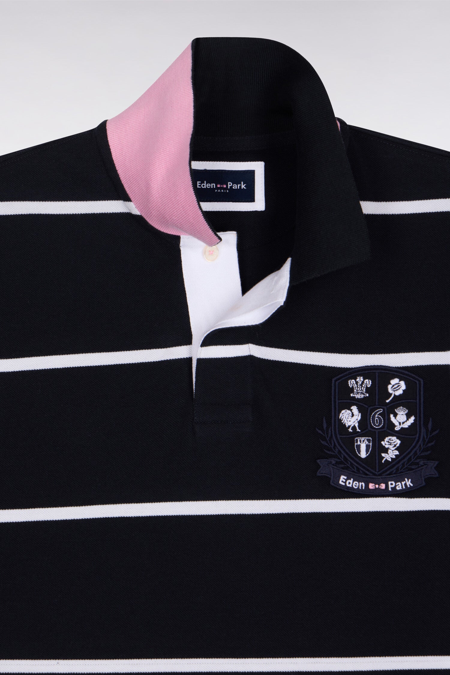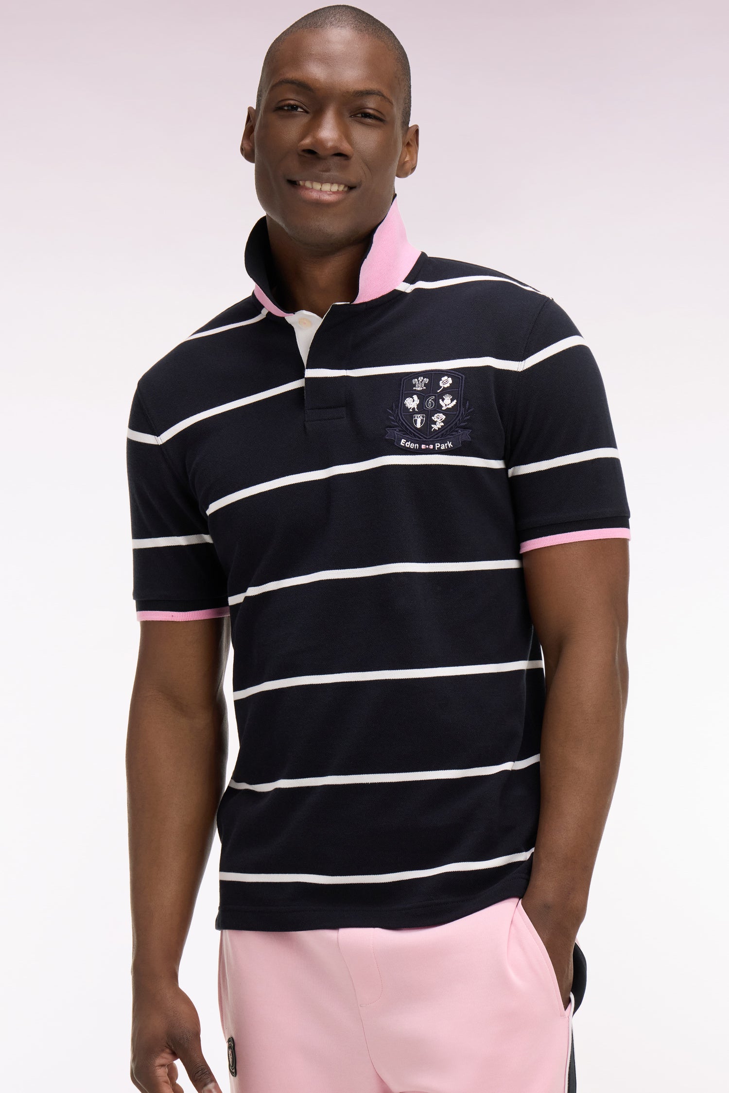 Ce polo pour homme à la coupe classique est proposé en bleu ciel à rayures marine ou en marine à rayures blanches. Ce modèle graphique en piqué de coton de haute qualité est orné d'une broderie écusson hommage au Tournoi des 6 Nations et de petites bordures de manches en bord-côtes à rayure rose pour une tenue parfaite.