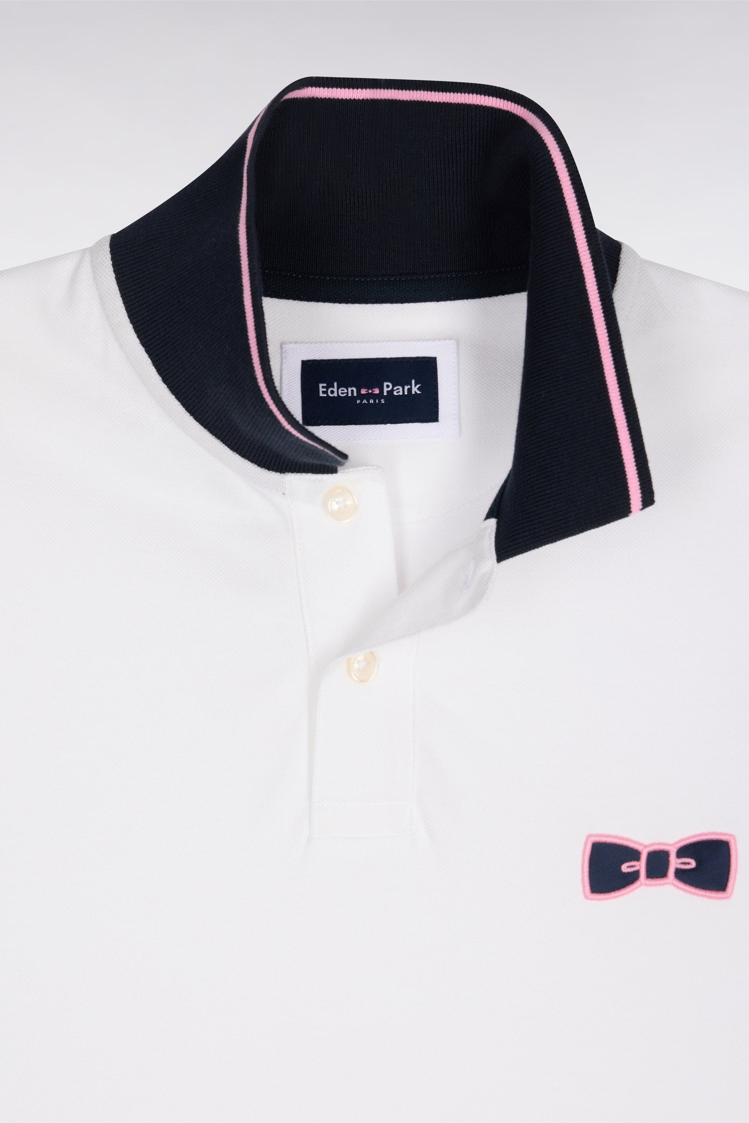 Ces 2 polos pour homme, disponibles en marine et rose ou blanc et marine, adoptent une coupe regular droite. Tous deux arborent des manches contrastées, un liseré en bordure de manches et autour de son col polo mais c'est surtout le nœud papillon brodé et patché sur la poitrine, qui signe l'appartenance de ce polo en coton au vestiaire Eden Park.