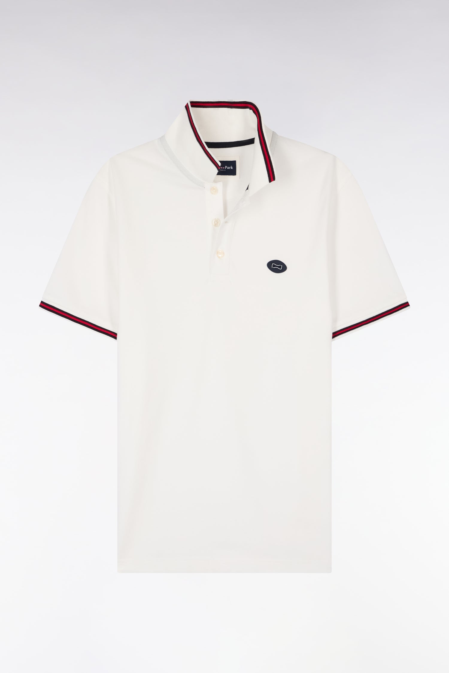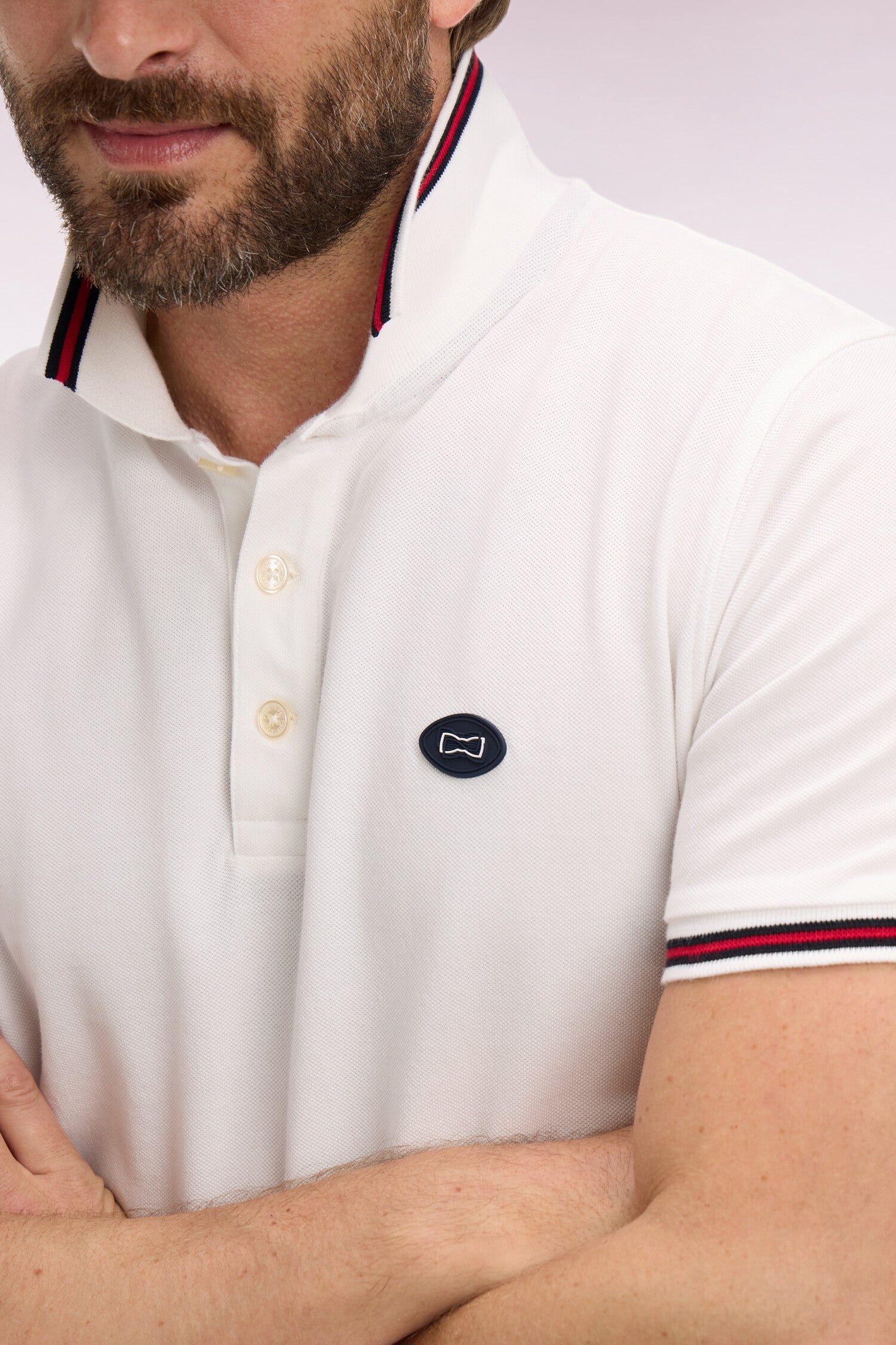 • Col polo et bas de manches à finition rayée