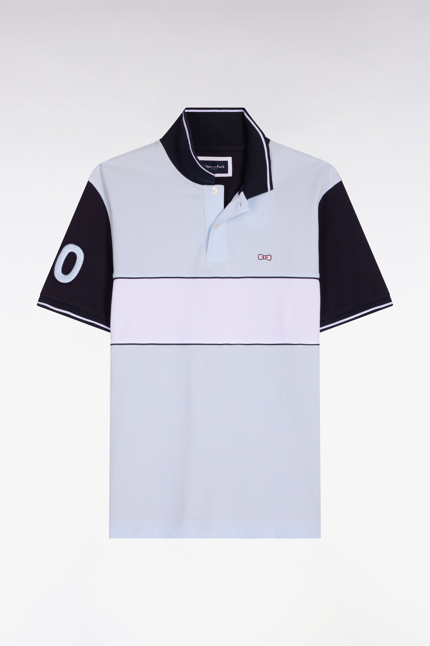 Ce polo masculin en piqué de coton coupe regular célèbre l’ADN rugby de la Maison grâce à sa large bande poitrine blanche, soulignée de passepoils marine qui structurent la silhouette. Le nœud papillon brodé et la broderie 10, enrichie d’une application en tissu cravate, renforcent son caractère identitaire. Son col et ses bas de manches en bords-côtes tricotés sont rehaussés d’un liseré contrasté, pour une touche élégante et sportive. Décliné dans les 4 coloris pastel signature de la saison, toujours associé à l'intemporel marine, ce polo à manches courtes incarne la modernité et la polyvalence du vestiaire sport chic Eden Park.