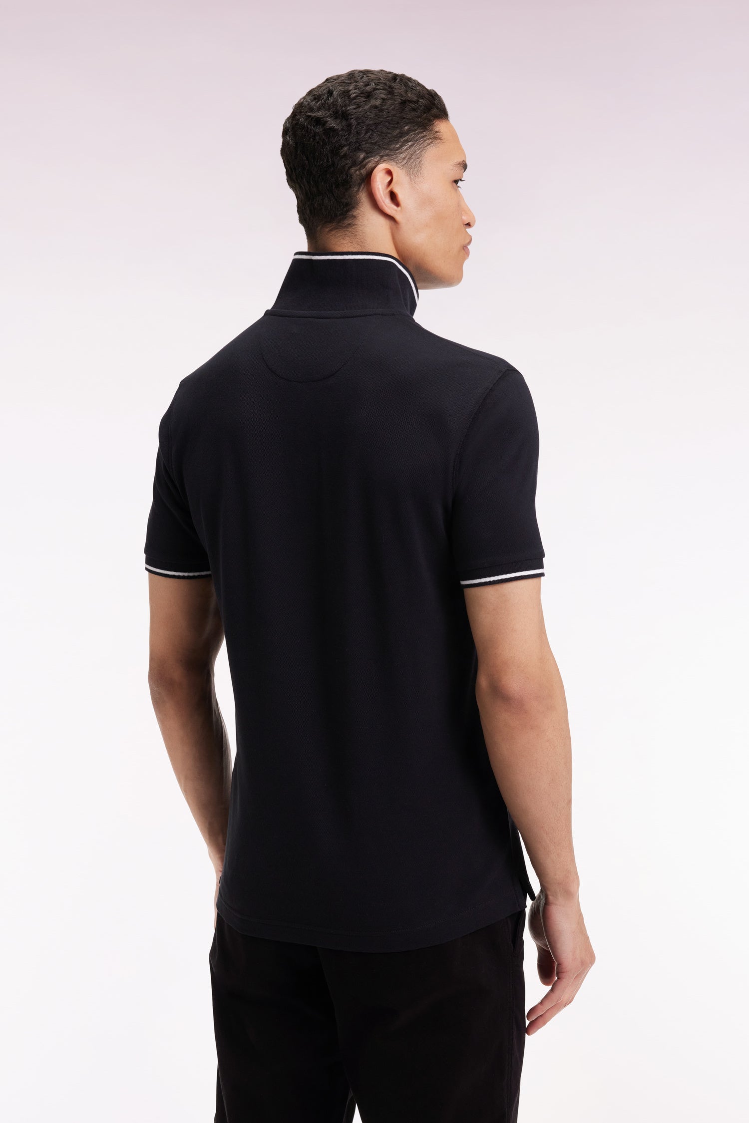 Short-sleeved polo shirt in black cotton with hooped embroidery
