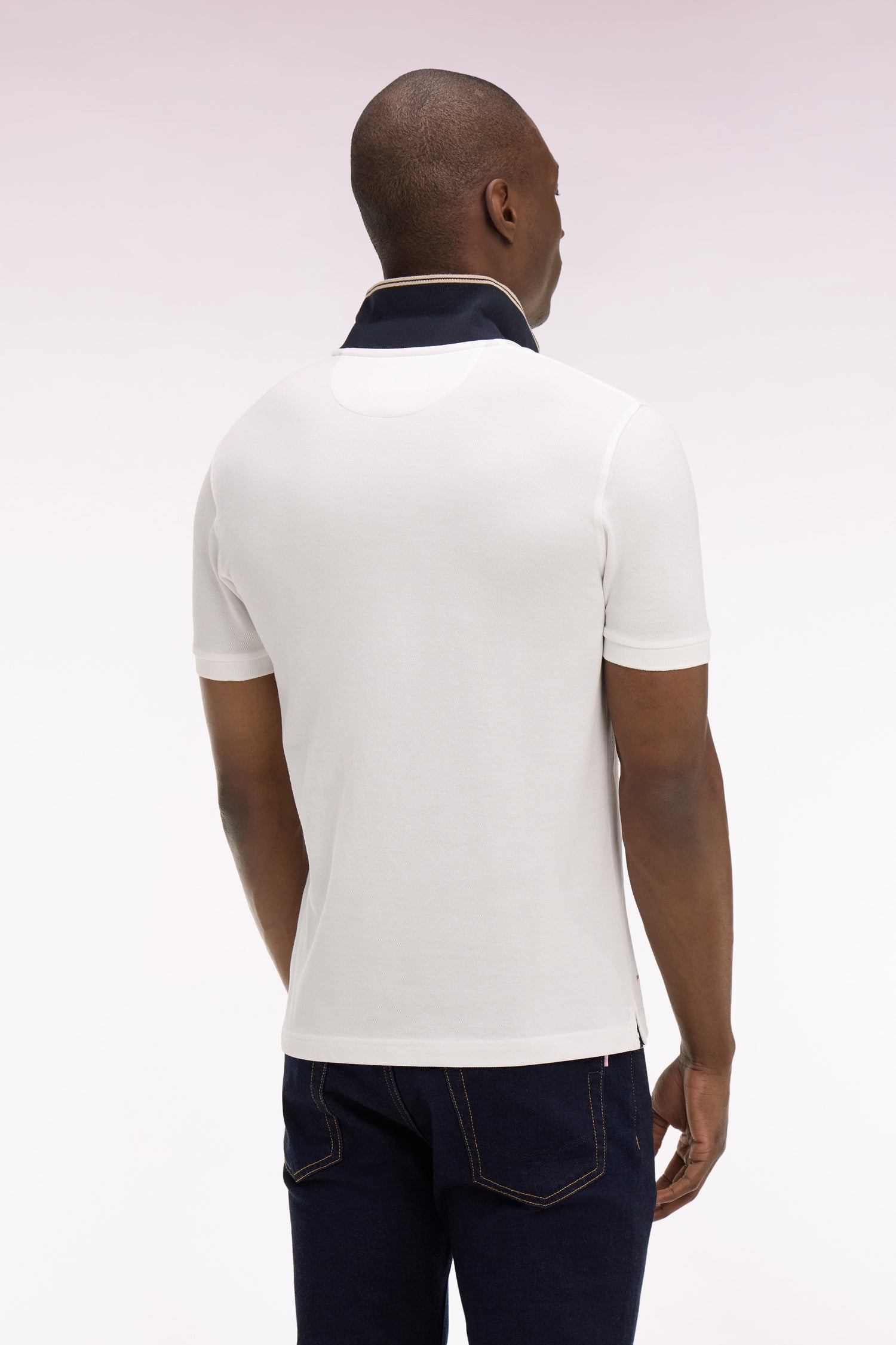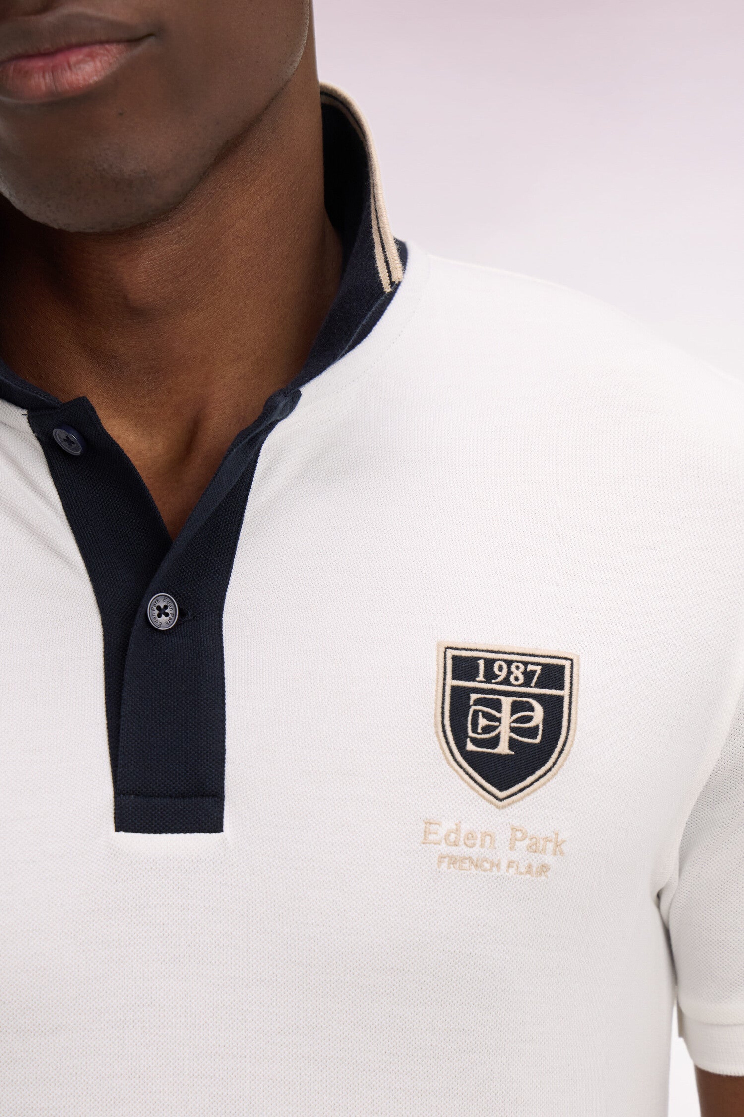 Ce polo en piqué de coton s’impose comme une pièce raffinée du vestiaire sport chic grâce à son écusson poitrine réalisé dans un esprit Ivy League, clin d’œil à une esthétique quiet luxury très actuelle. Sa coupe regular droite et son col polo marine finement rayé, prolongé par une patte de boutonnage assortie, apportent structure et élégance, tandis que les bas de manches en maille unie renforcent une allure plus habillée. Décliné dans des coloris pastel intemporels, il se porte aussi bien avec un short coordonné qu’avec un jean brut, selon l’allure recherchée.