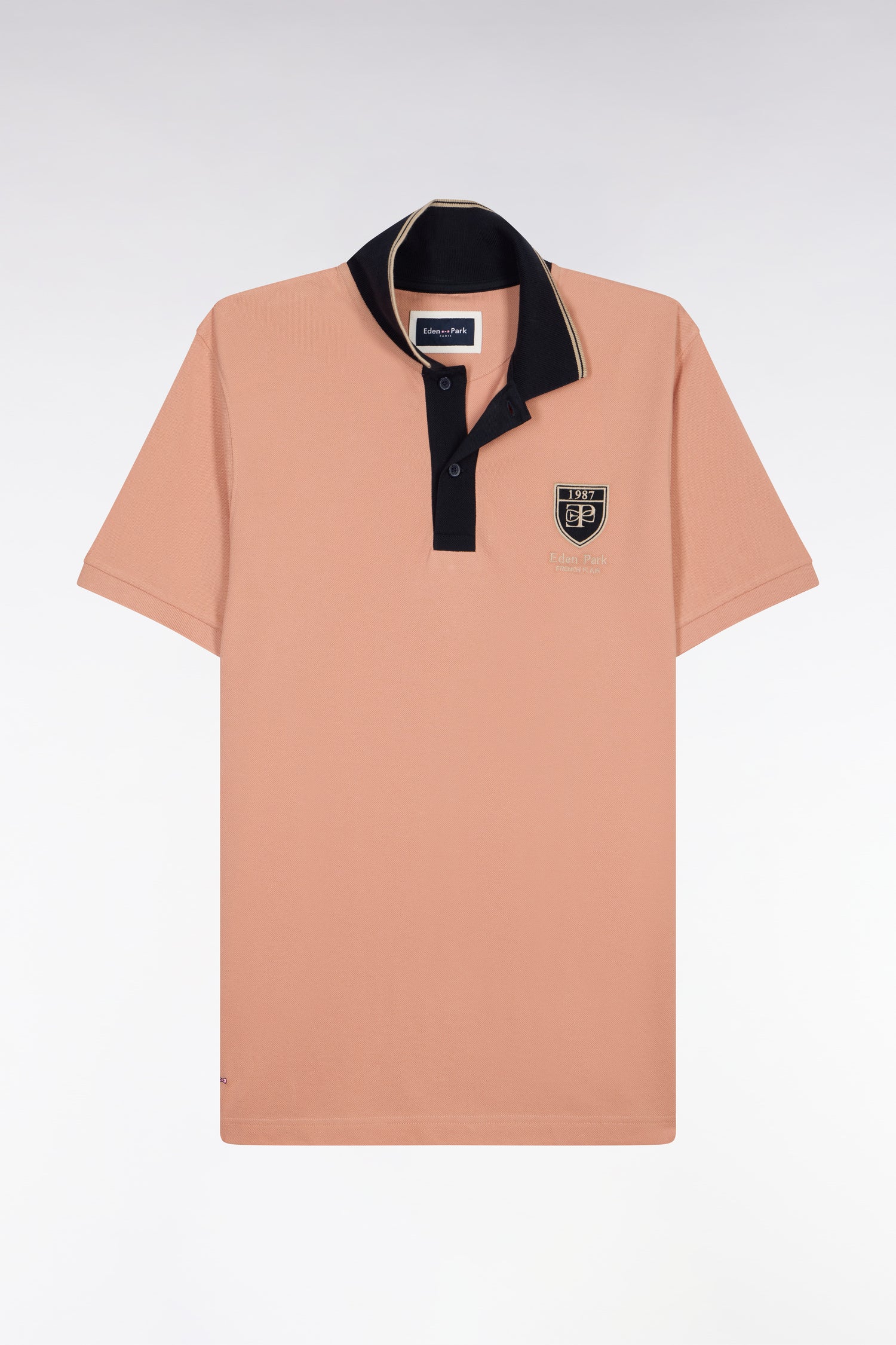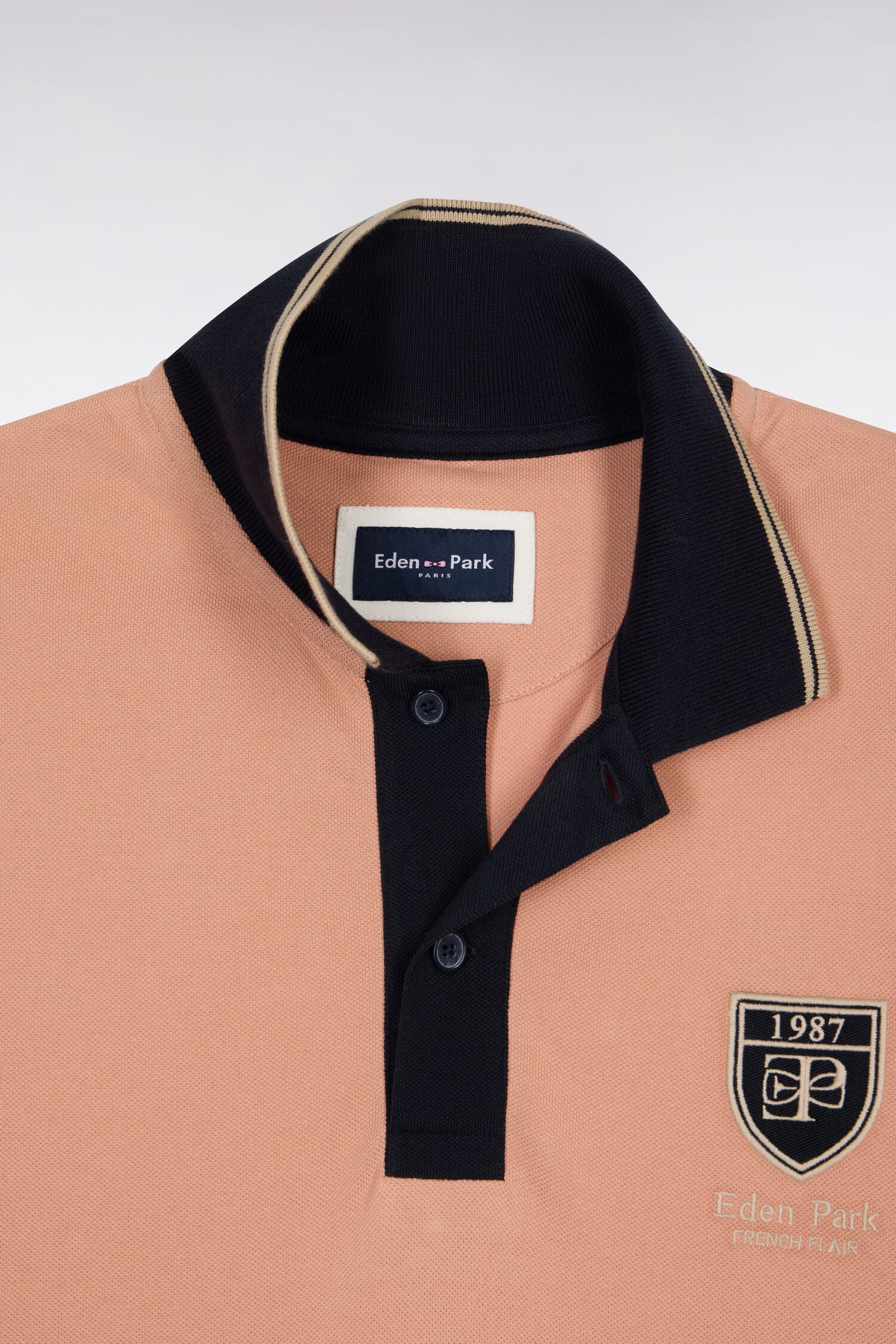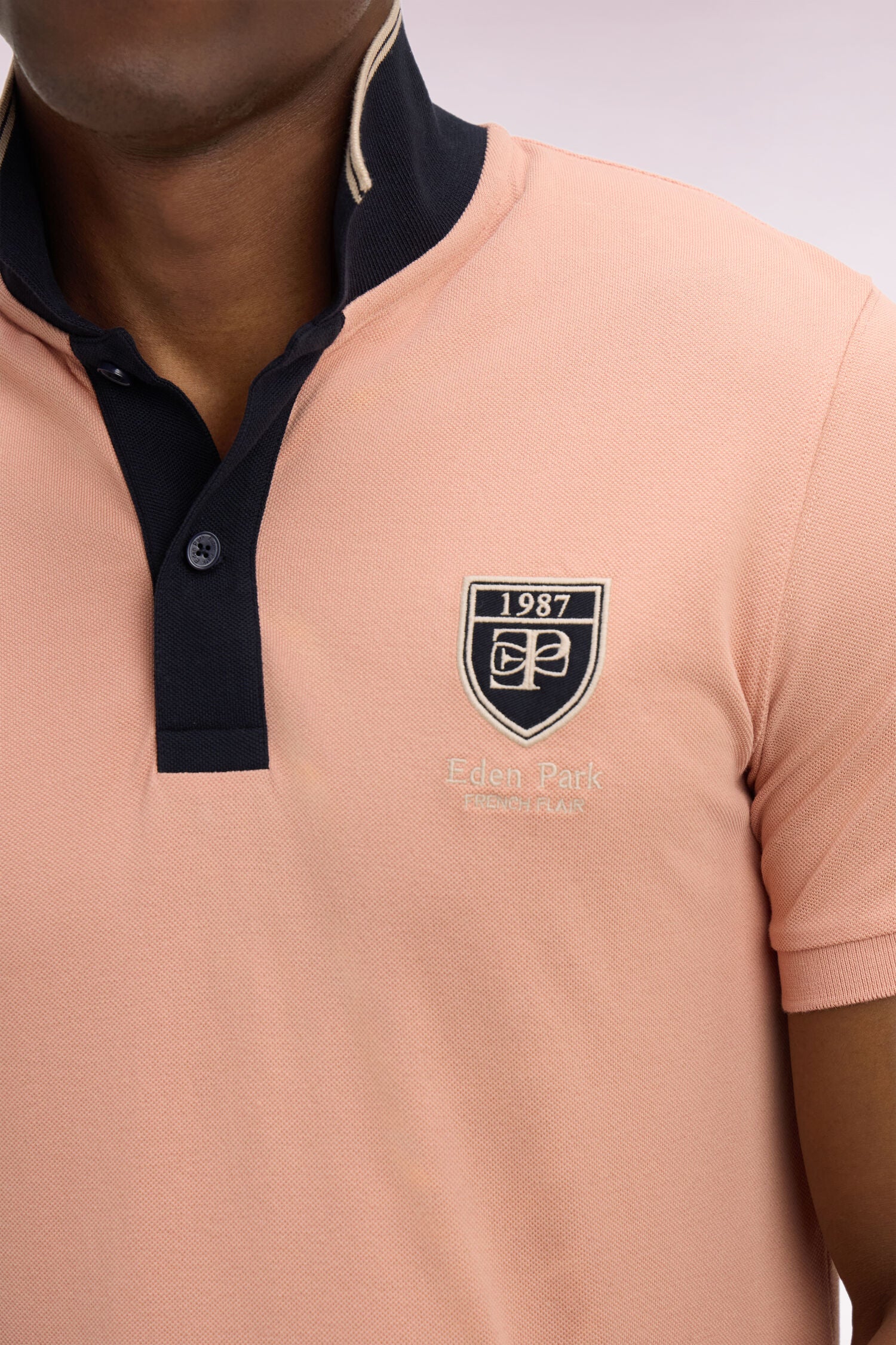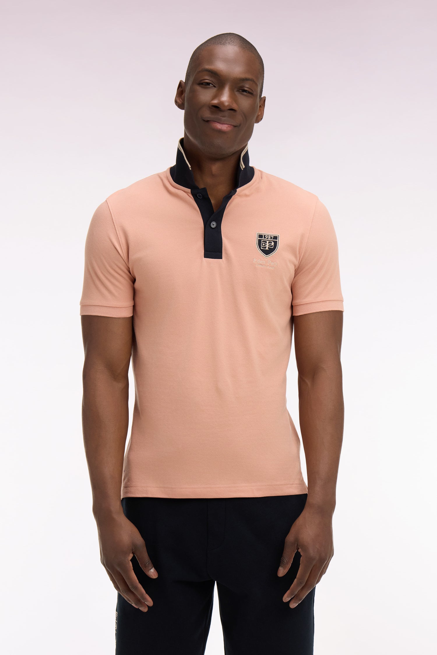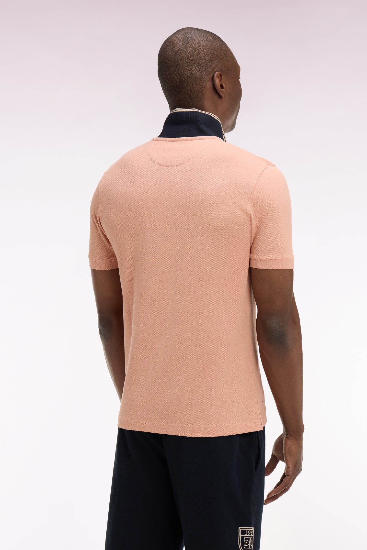 Ce polo en piqué de coton s’impose comme une pièce raffinée du vestiaire sport chic grâce à son écusson poitrine réalisé dans un esprit Ivy League, clin d’œil à une esthétique quiet luxury très actuelle. Sa coupe regular droite et son col polo marine finement rayé, prolongé par une patte de boutonnage assortie, apportent structure et élégance, tandis que les bas de manches en maille unie renforcent une allure plus habillée. Décliné dans des coloris pastel intemporels, il se porte aussi bien avec un short coordonné qu’avec un jean brut, selon l’allure recherchée.