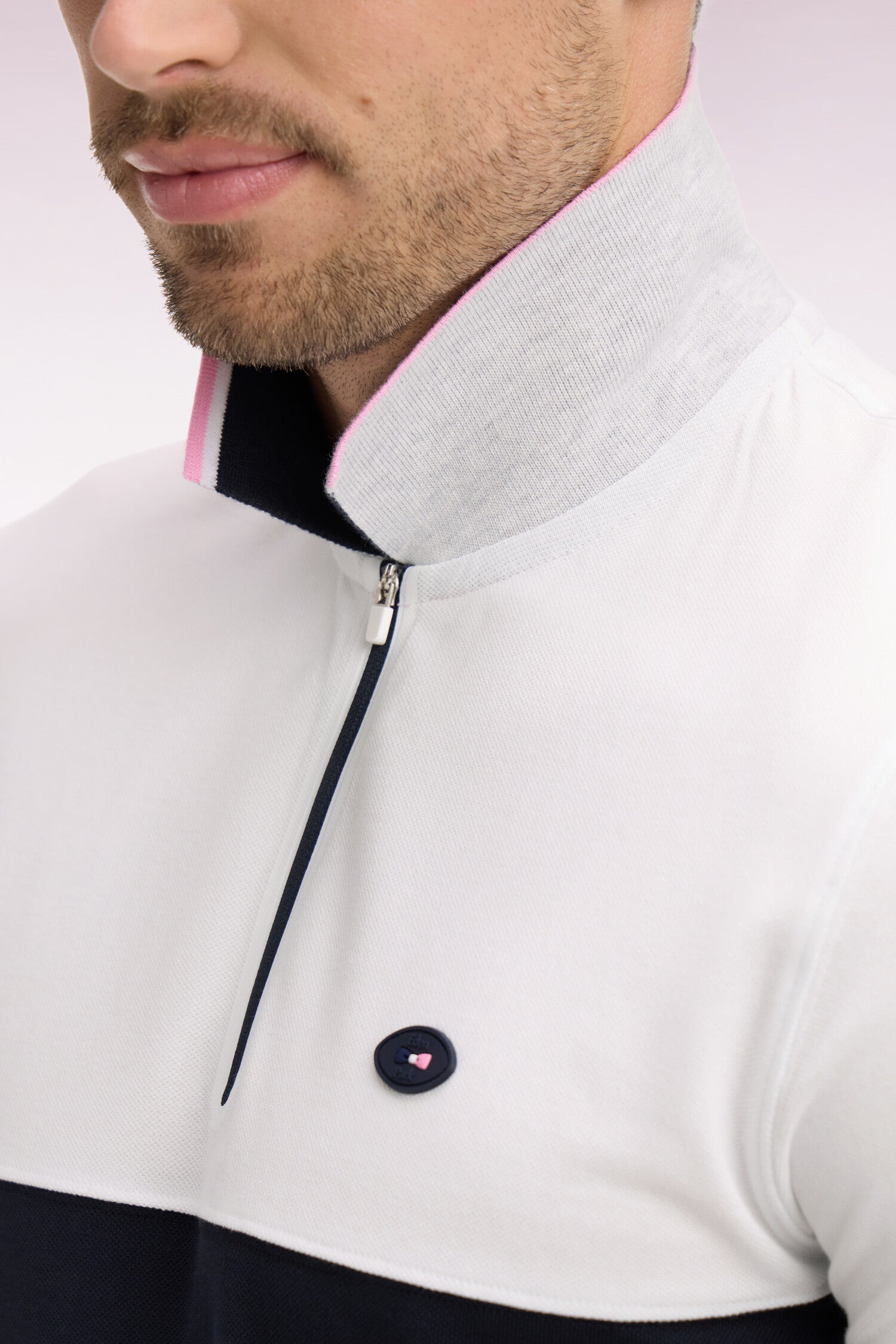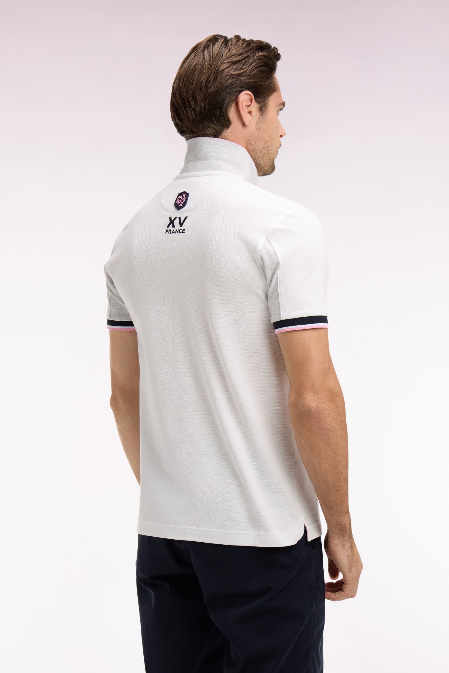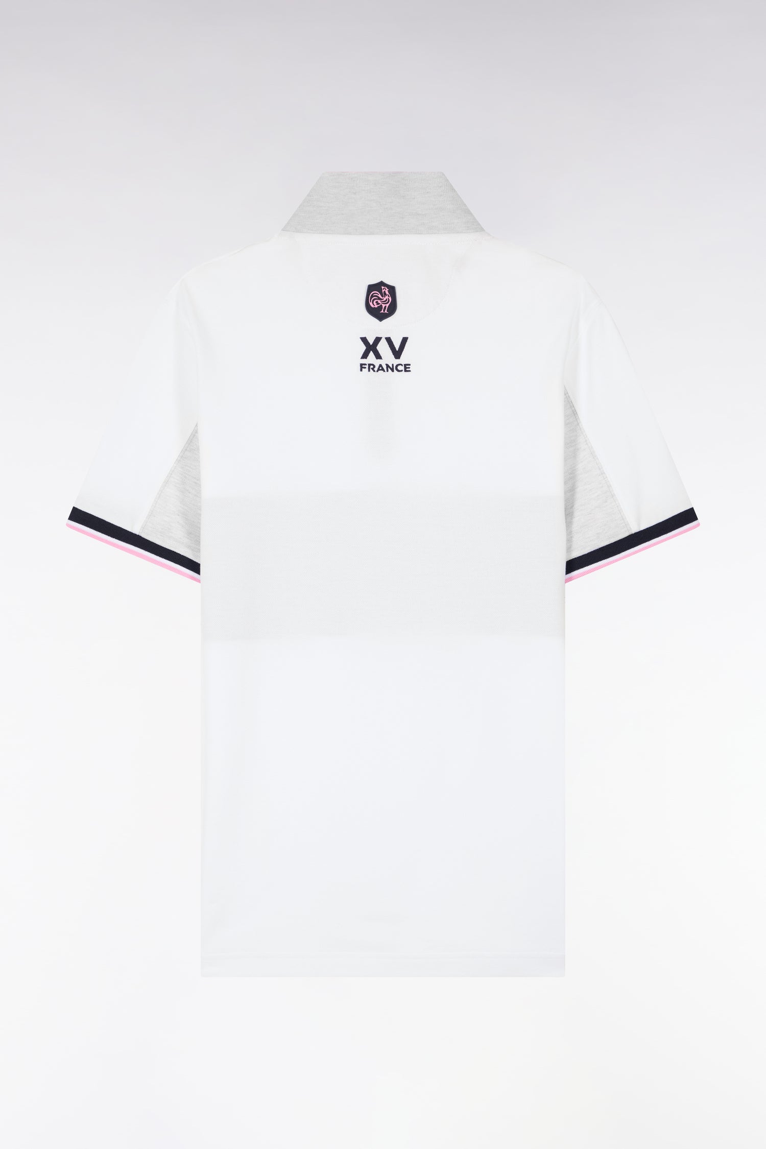 Craquez pour ce polo XV de France disponible en marine ou en blanc. Avec ses bordures de manches et de col tricolores marine, blanche et rose, son dessous de col chiné et sa large bande contrastée sur la poitrine, ce modèle allie élégance sport chic et dynamisme. Détail unique : ce polo ne s'agrémente pas d'une patte de boutonnage mais d'un zip soigné pour une allure plus urbaine.