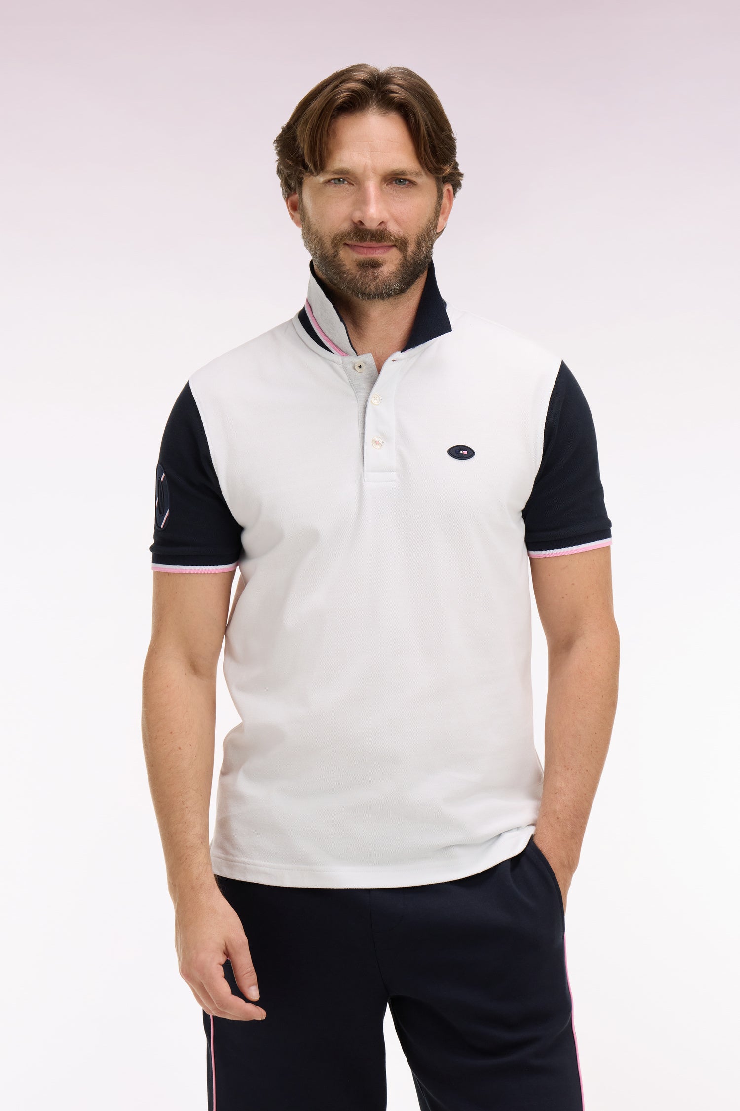 Ce polo en piqué de coton affirme un style résolument rugby grâce à son col sur lequel un tricotage jacquard affirme fièrement son attachement à la France, clin d’œil direct au XV de France. Ses manches contrastées, agrémentées d'une broderie rehaussée de notre iconique tissus cravate, et son écusson officiel FFR en font une pièce forte, pensée pour accompagner les supporters de cette équipe mythique du stade à la ville. Allure dynamique, détails identitaires et esprit sport chic se conjuguent dans ce trio de polos à manches courtes emblématiques de nos collections de mode. À associer avec un jean, un short ou pourquoi pas un chino pour une allure sport-chic.