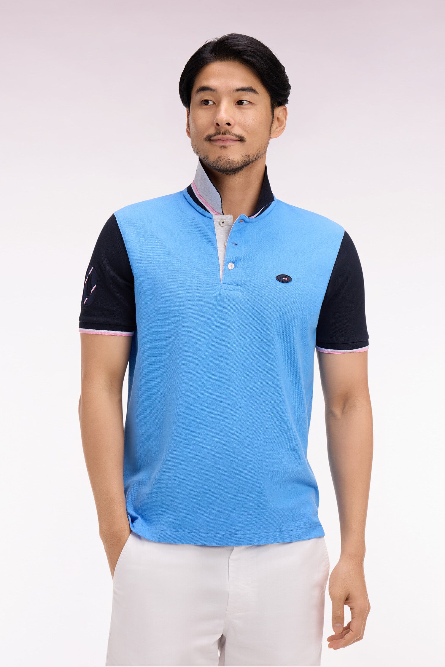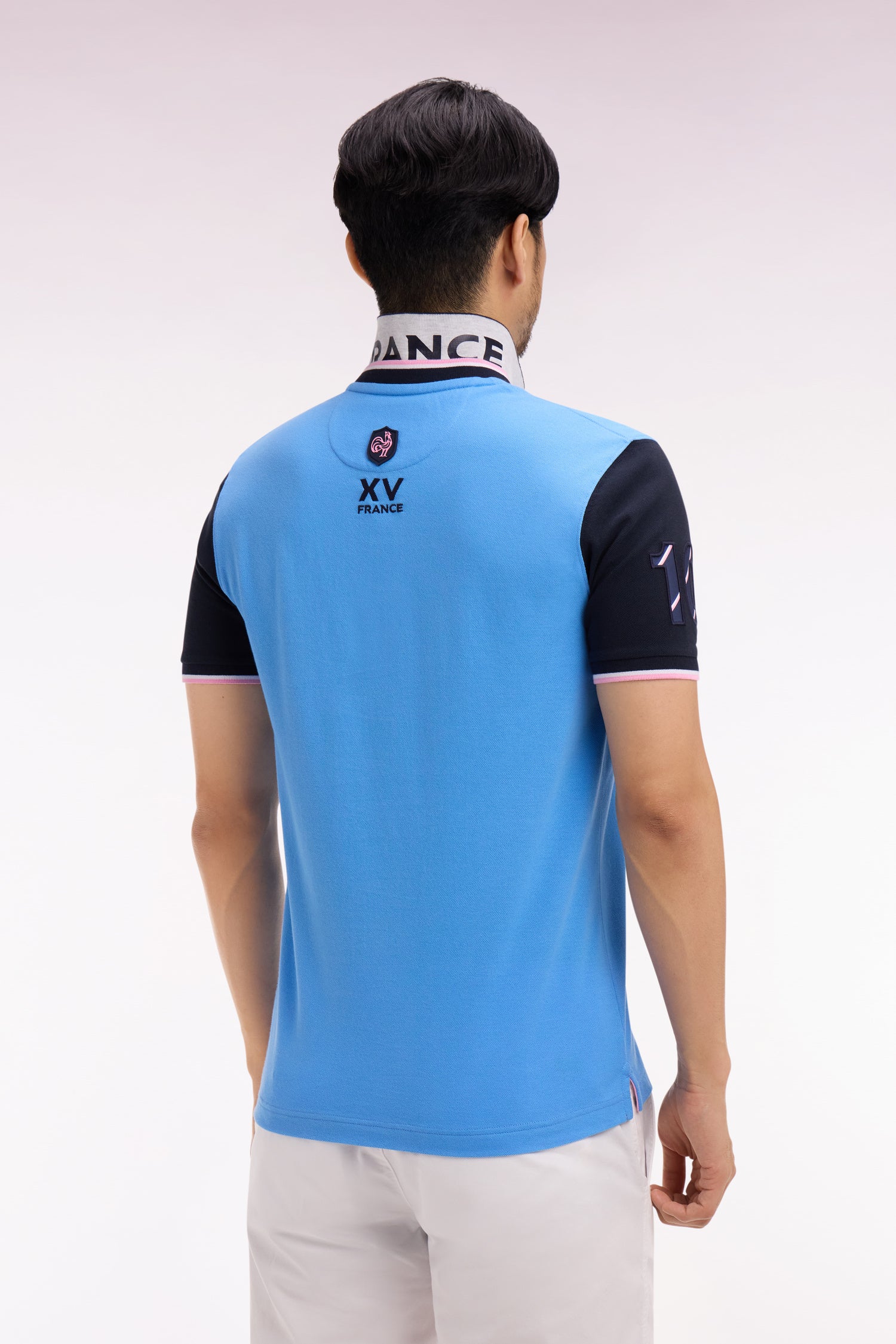 Ce polo en piqué de coton affirme un style résolument rugby grâce à son col sur lequel un tricotage jacquard affirme fièrement son attachement à la France, clin d’œil direct au XV de France. Ses manches contrastées, agrémentées d'une broderie rehaussée de notre iconique tissus cravate, et son écusson officiel FFR en font une pièce forte, pensée pour accompagner les supporters de cette équipe mythique du stade à la ville. Allure dynamique, détails identitaires et esprit sport chic se conjuguent dans ce trio de polos à manches courtes emblématiques de nos collections de mode. À associer avec un jean, un short ou pourquoi pas un chino pour une allure sport-chic.