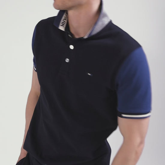 Regular navy blue short-sleeved cotton piqué polo shirt with Eden Park jacquard collar