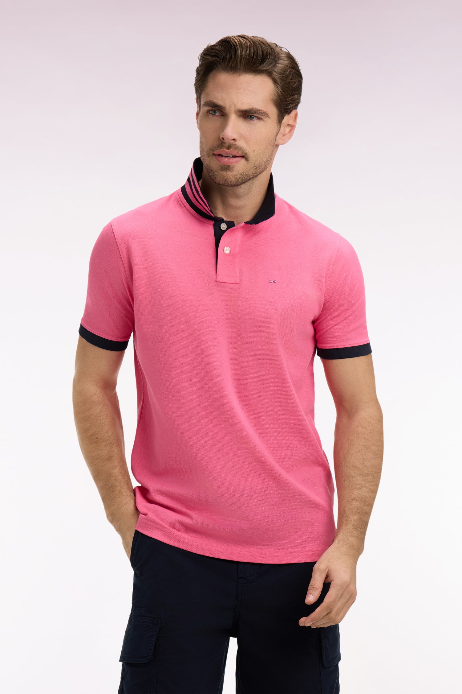 Polo manches courtes en piqué coton rose dessous de col rayé coupe slim