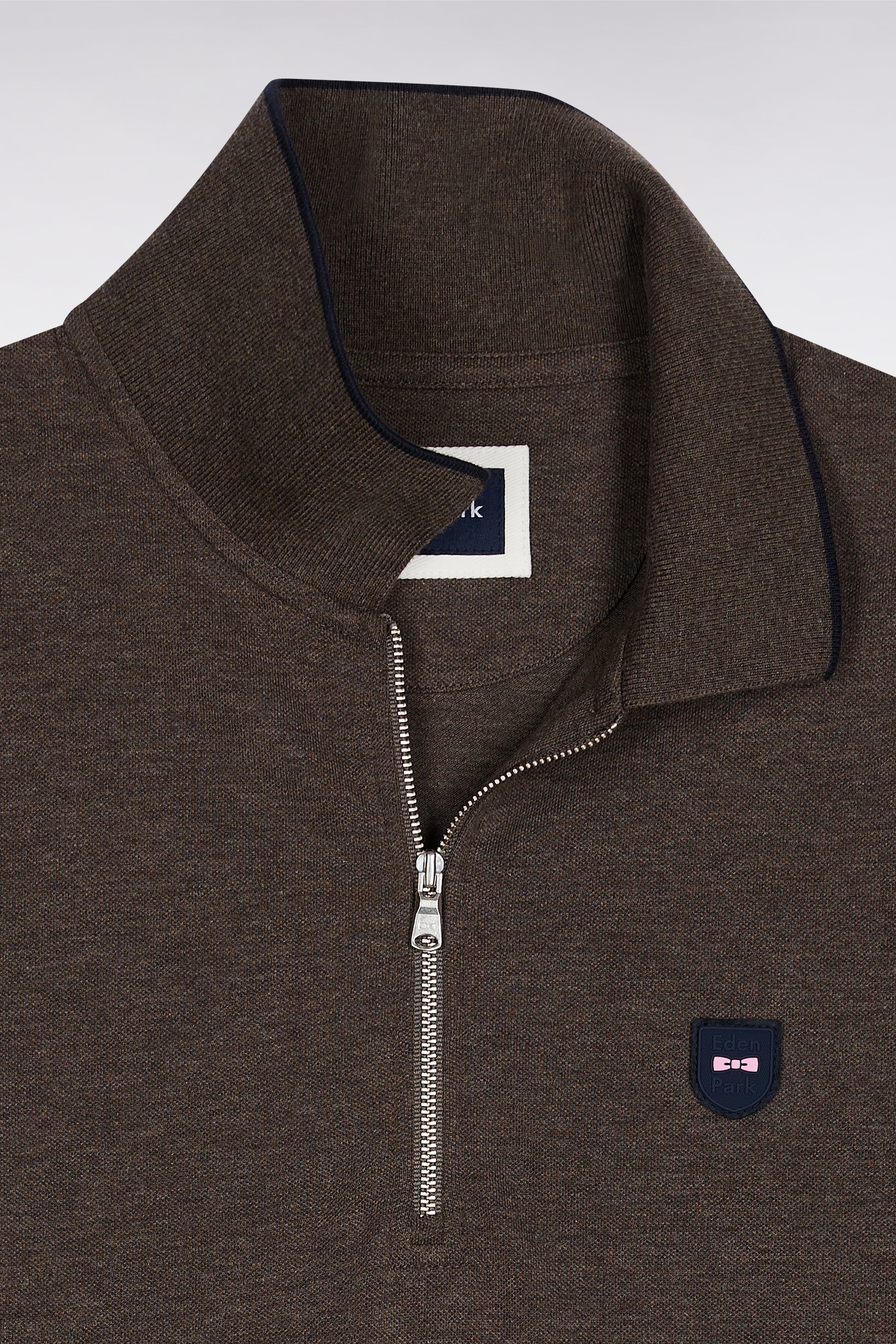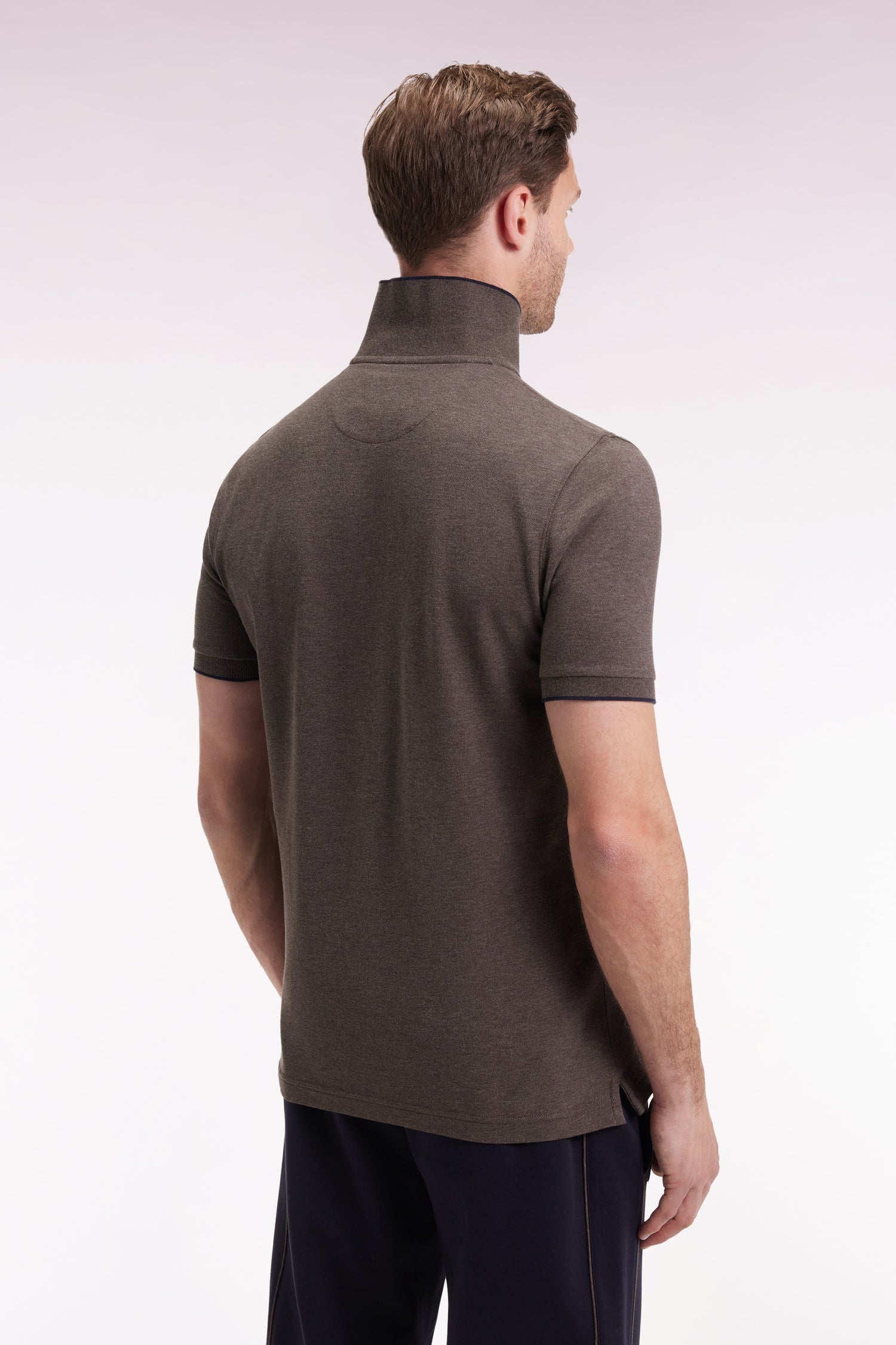 Short-sleeved polo shirt in brown stretch cotton piqué with zip and slim fit