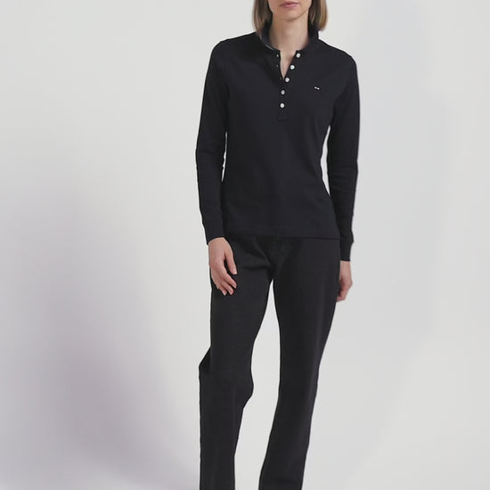 Slim black long-sleeved stretch cotton polo shirt with striped collar