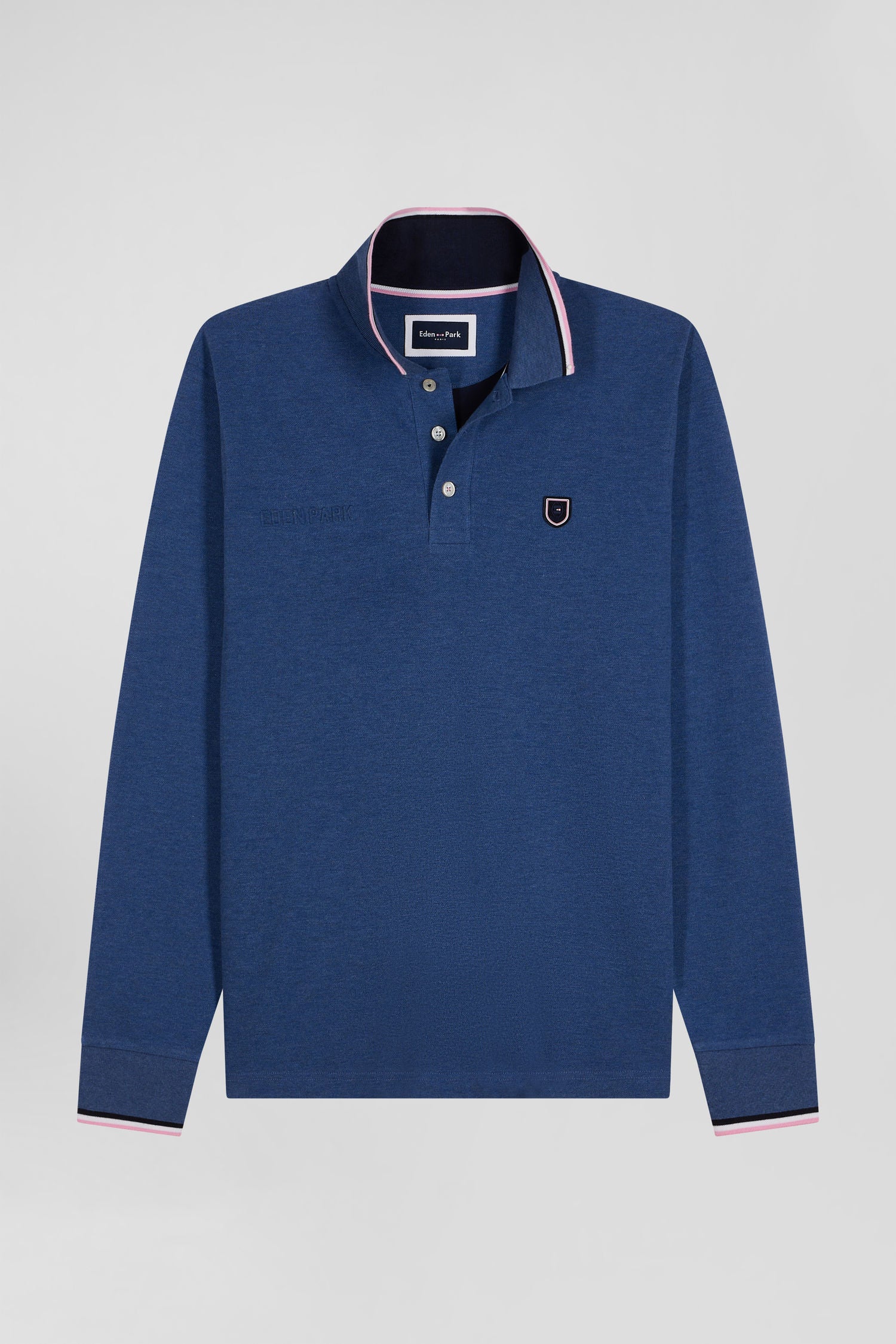 Complete your collection of iconic Eden Park spirit pieces with this men's long-sleeved cotton piqué polo, perfect for every moment. Its modern look is enhanced by a distinctive silicone patch and elegant collar with tricolor trim, embodying the essence of sporty chic.