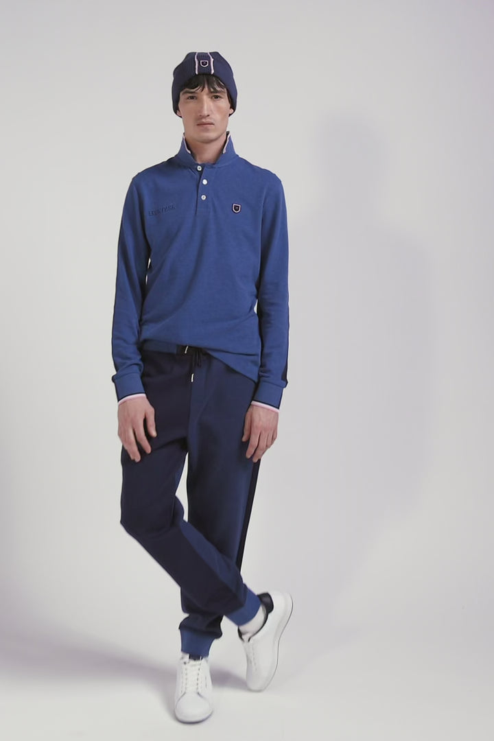 Regular dark blue long-sleeved cotton piqué polo shirt with tricolor details