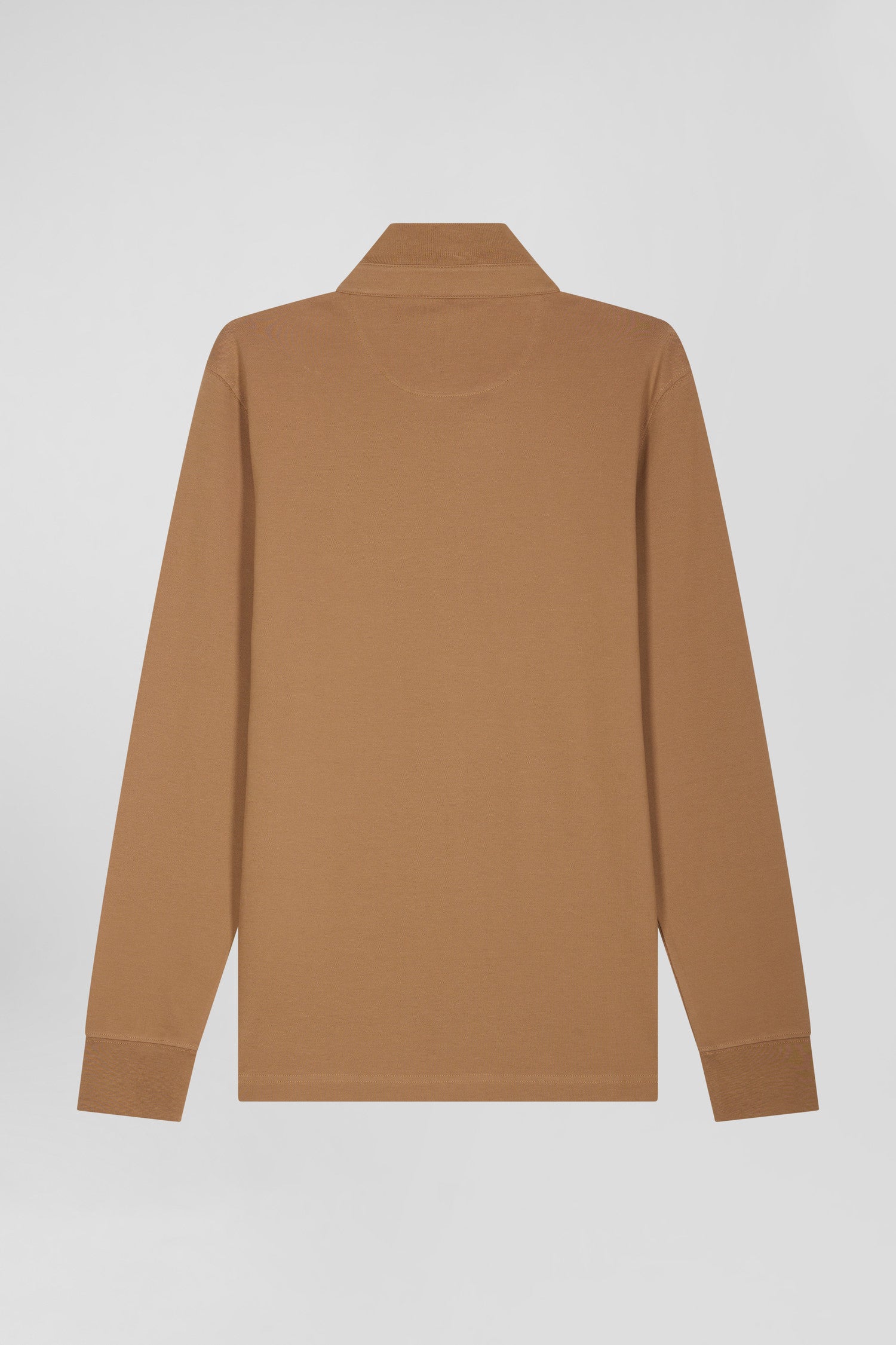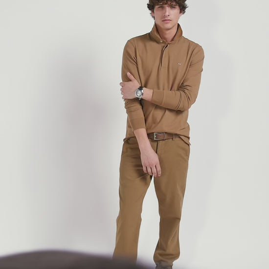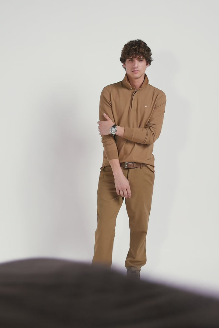 Long-sleeved polo shirt in hazelnut cotton piqué, slim fit