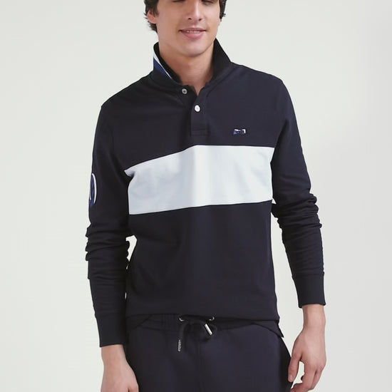 Add a sophisticated touch to your casual wardrobe with this men's long-sleeved polo shirt. Its embroidered finish with fabric tie application on the sleeve lends it a certain elegance. The number 10 shirt is no coincidence: it's the jersey worn by rugby player and Eden Park founder Franck Mesnel. The rugby-inspired oval buttons, bearing the name of our House, add to the meticulous details of this men's polo shirt, such as the knitted collar with tricolored stripes.