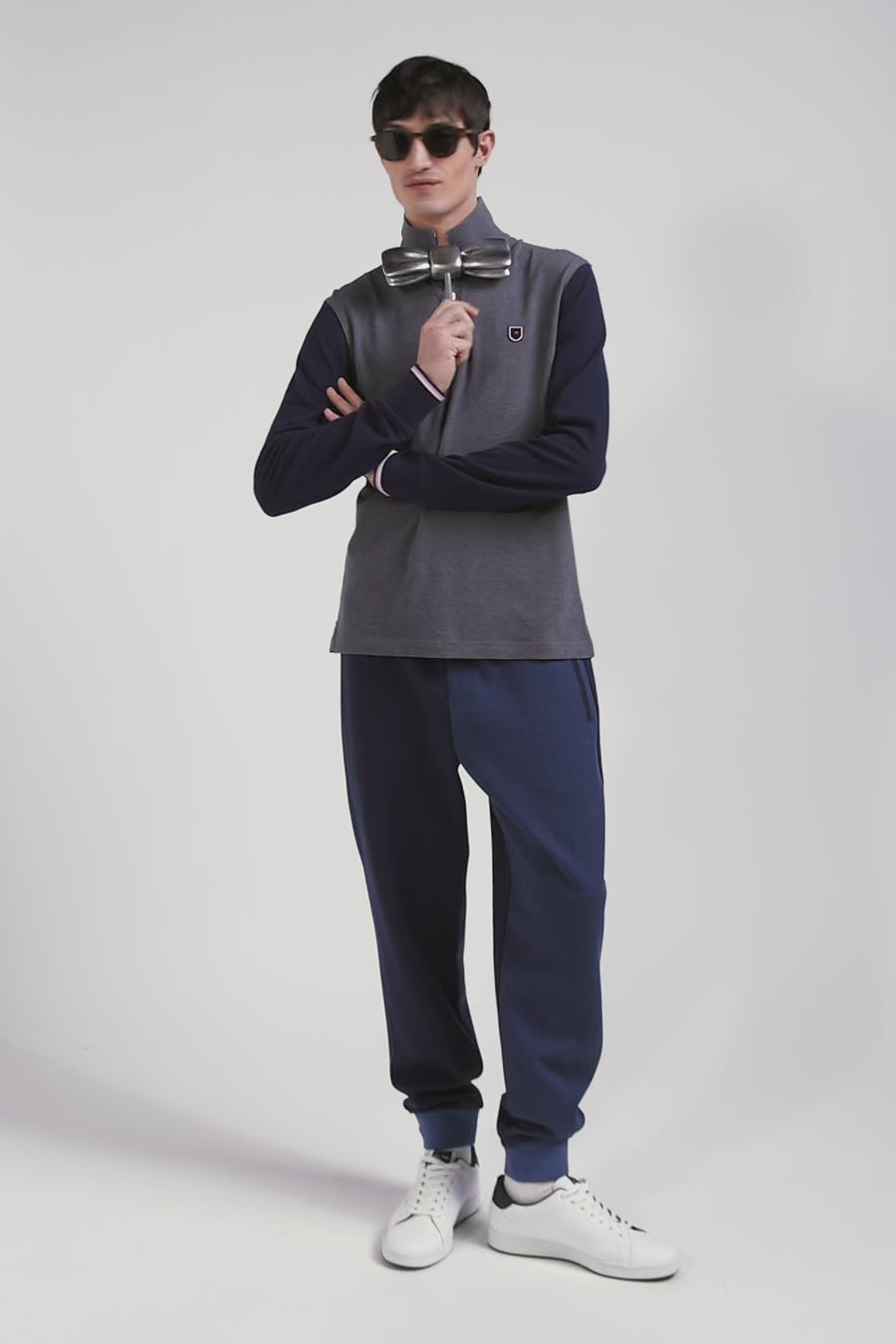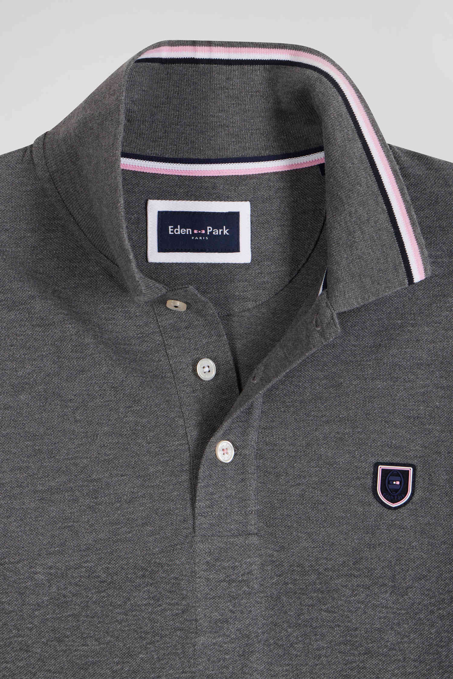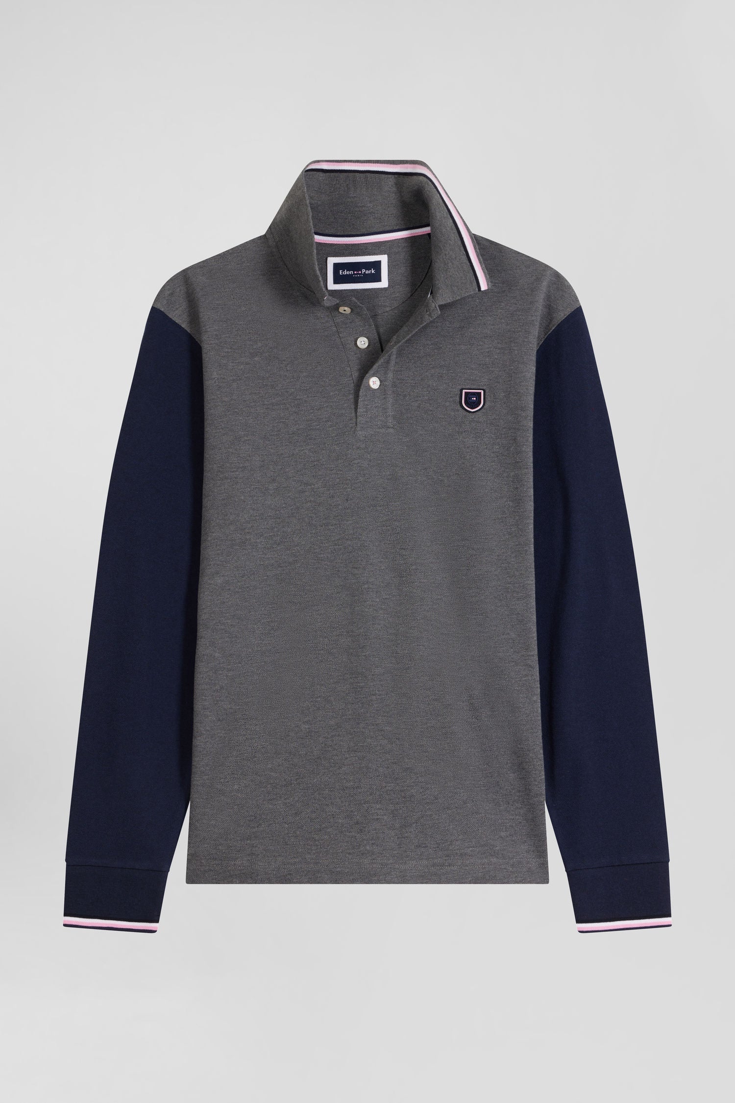 Regular grey long-sleeved cotton piqué polo shirt with jacquard collar and rubber badge