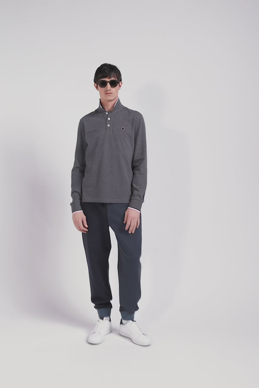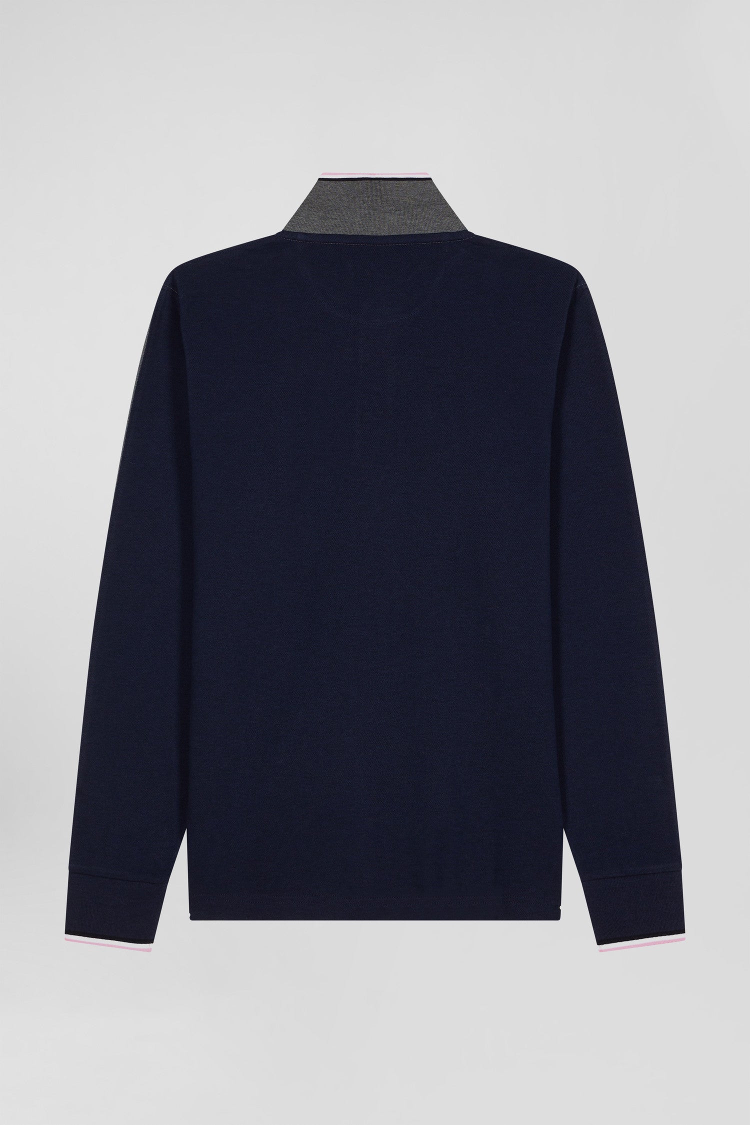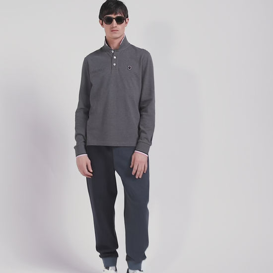 Regular grey long-sleeved cotton piqué polo shirt with tricolor details