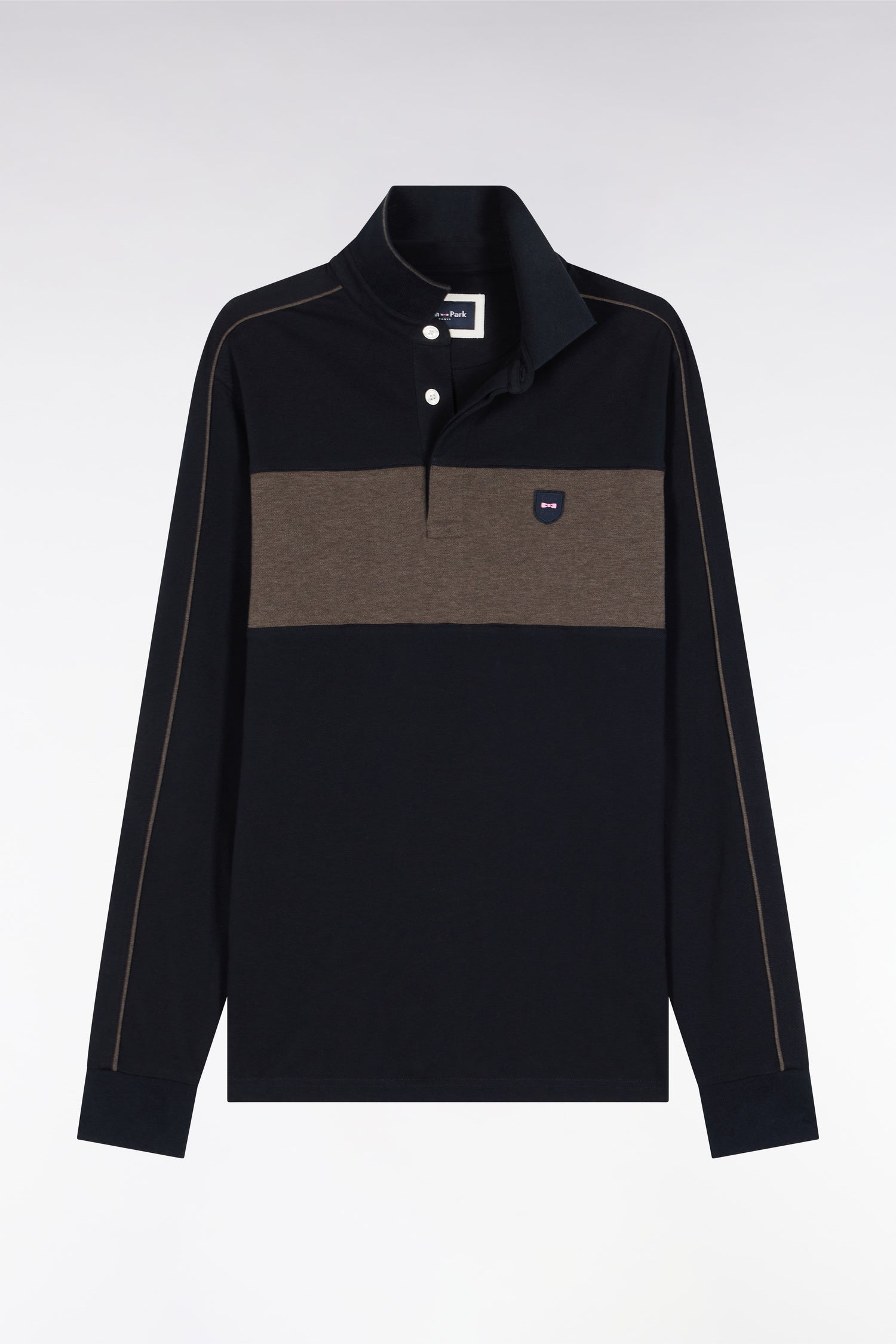Three-tone long-sleeved polo shirt in navy stretch cotton, slim fit