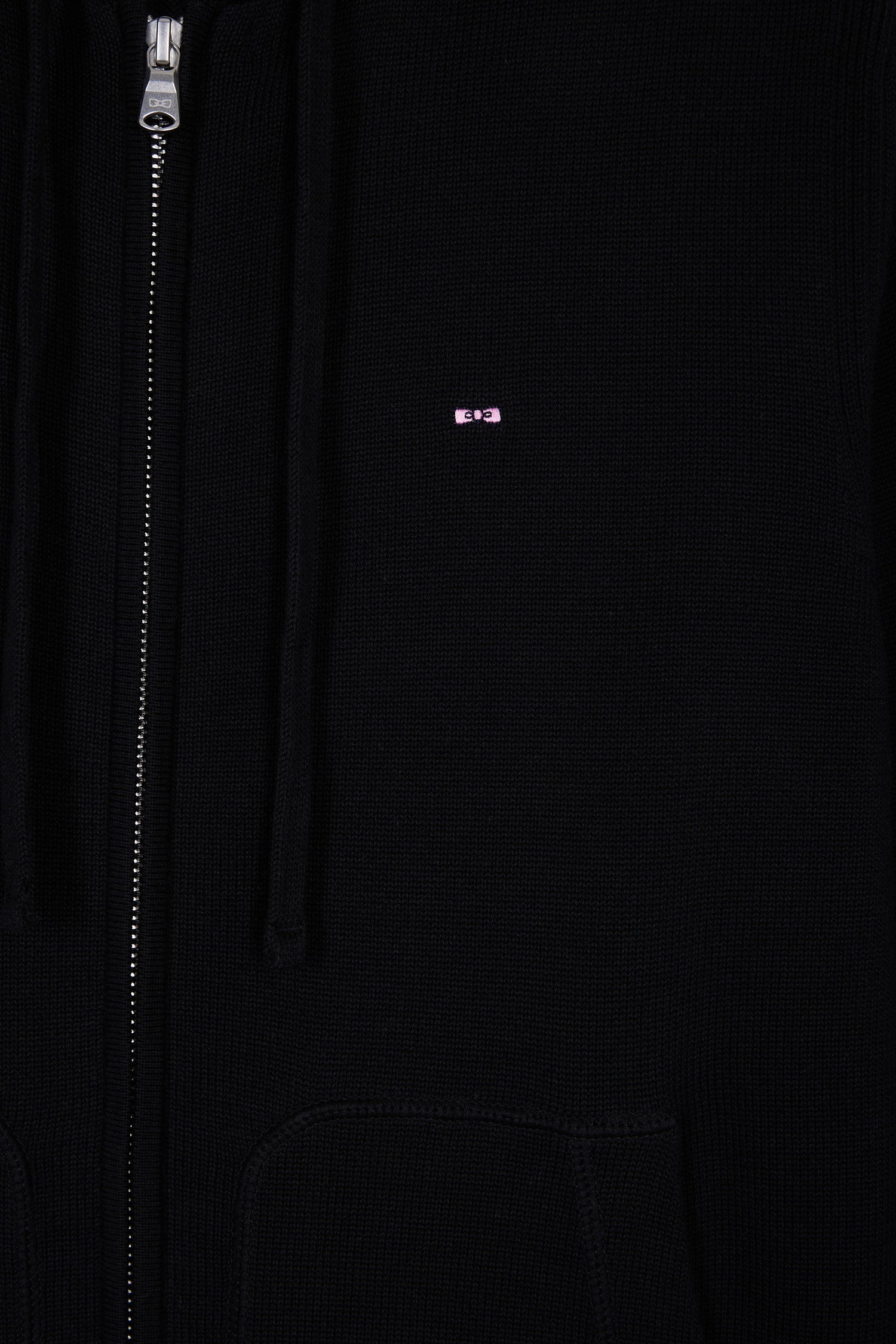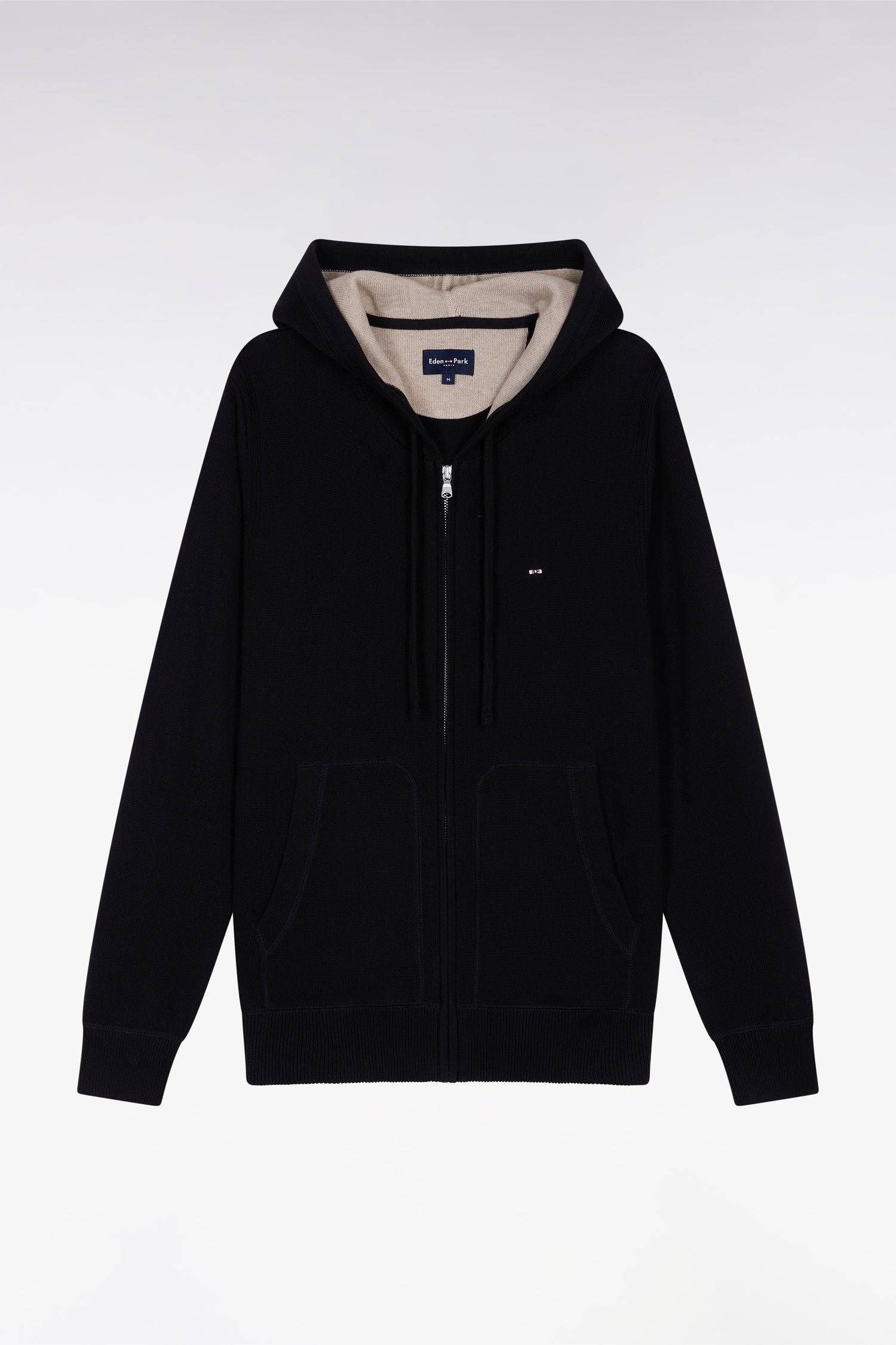 Conceived as a chic alternative to the sweatshirt, this knitted cotton hooded sweater plays the card of comfort and sport-chic style. The jersey body is complemented by a contrasting brown or beige lining on the inside of the hood, while the tapered armholes and ribbed trims add structure and hold to this trendy, timeless men's model. Kangaroo pockets and knitted drawstrings complete this piece, perfect for a casual, controlled everyday look. The perfect combination of soft knitwear and the cool attitude of a sweatshirt.