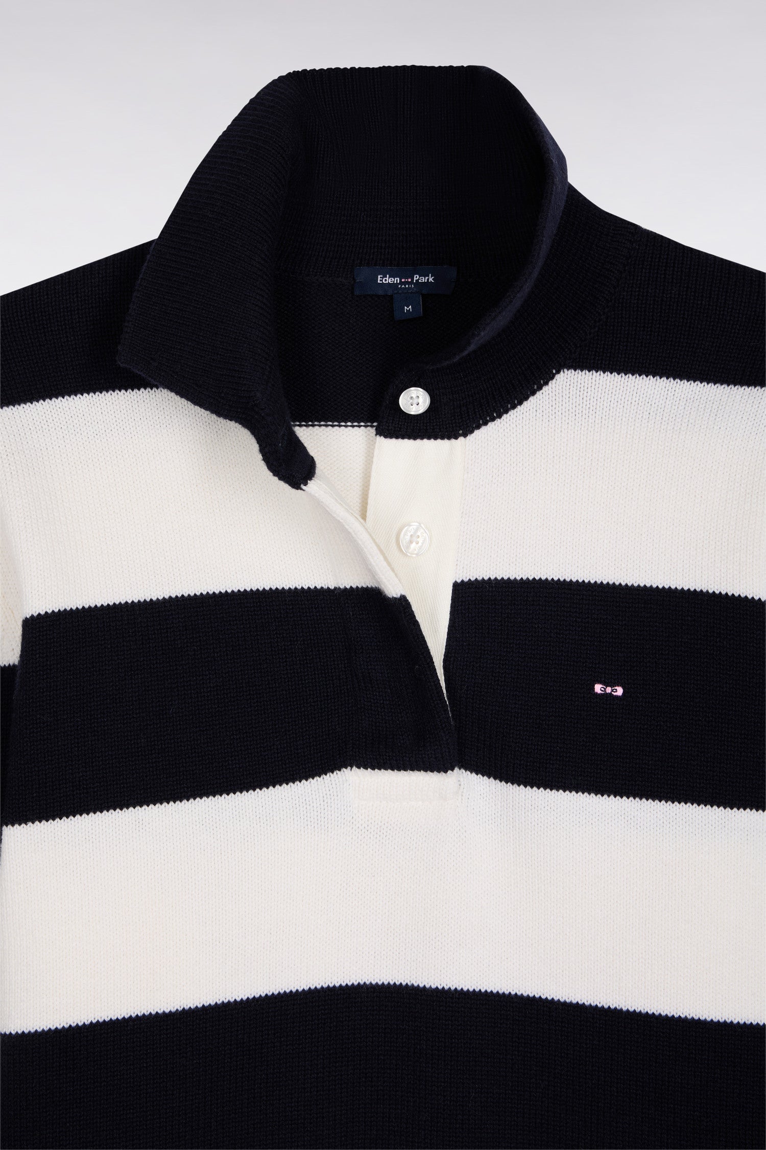 This women's jersey-neck sweater in navy and white rugby stripes revisits an Eden Park wardrobe classic in a wool and cotton version with a slightly looser, relaxed fit. Comfortable and graphic, it has a sporty-chic look ideal for a casual style that's meticulous down to the smallest detail.