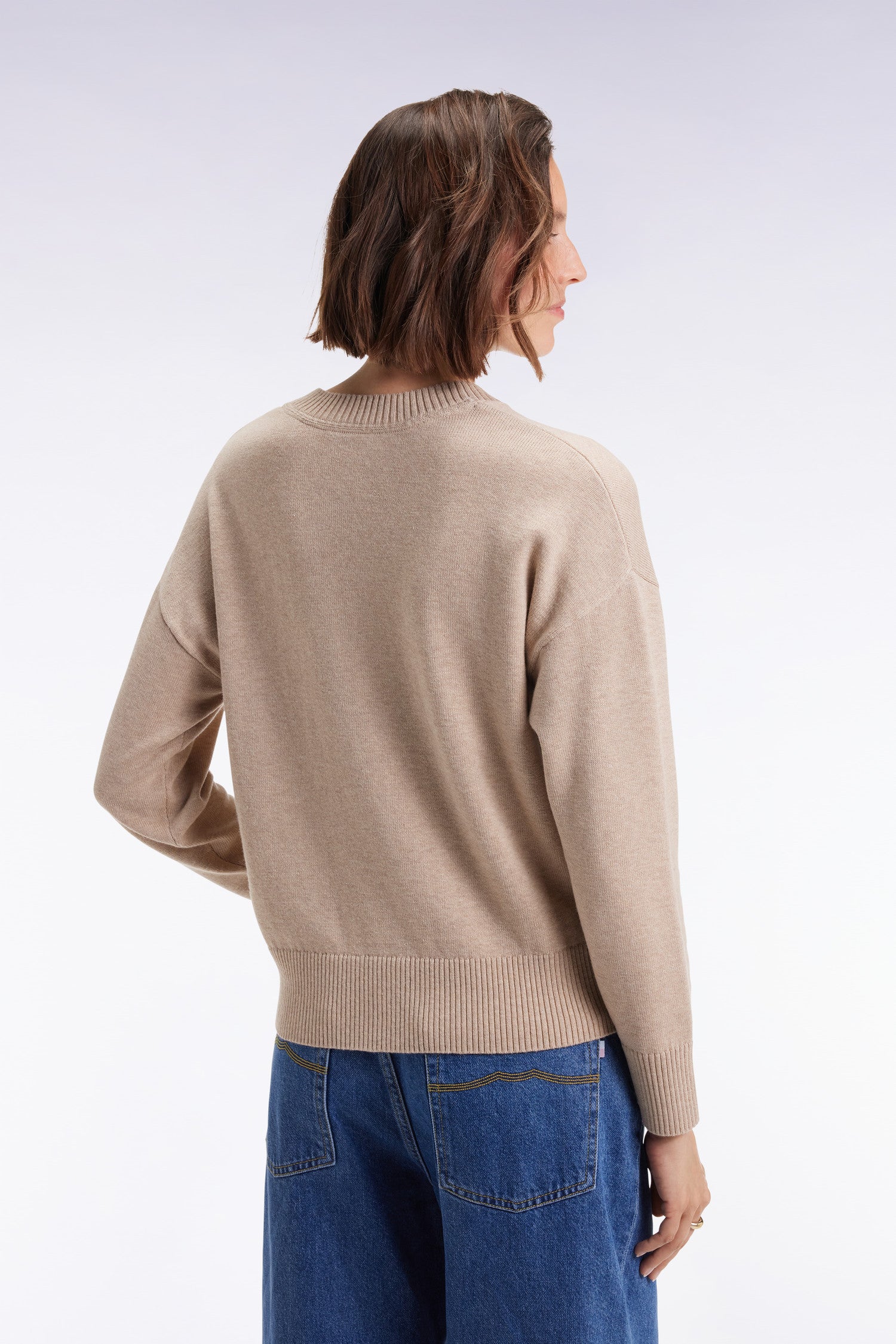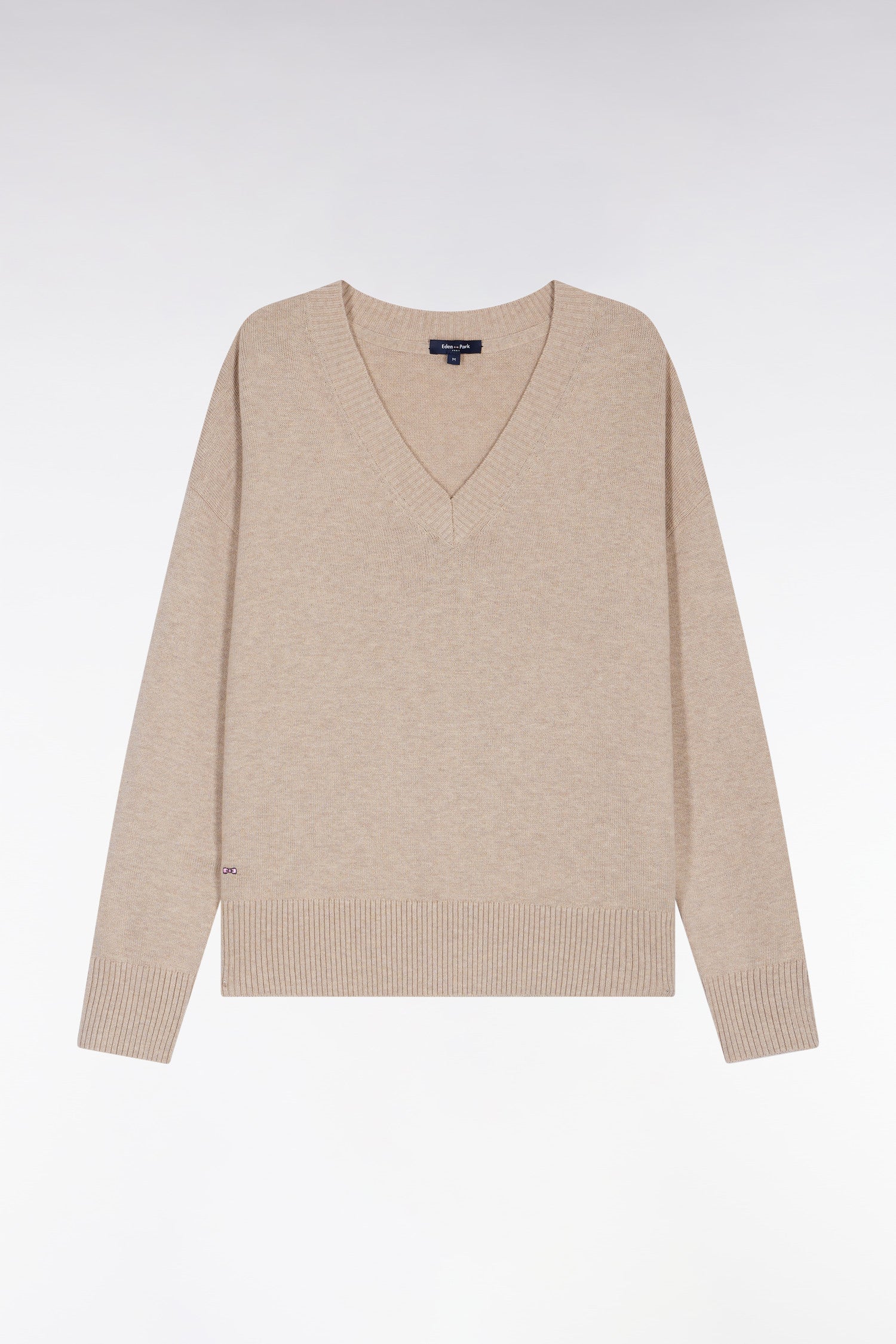 This women's V-neck sweater, knitted in a soft wool/cotton blend, has the casual elegance typical of our French sport-chic wardrobe. Its soft knit and rib-knit finishing give it a streamlined style. An essential model to wear alone or layered over a shirt. Available in 3 timeless colors