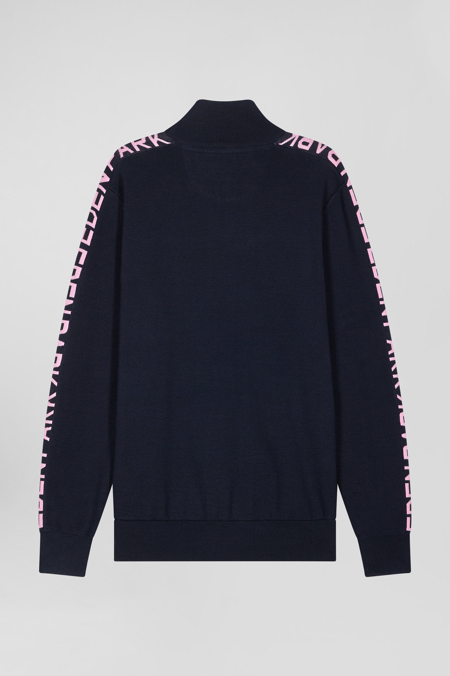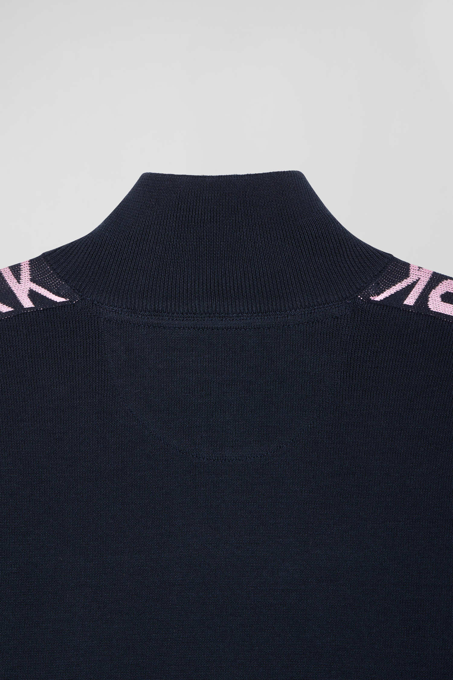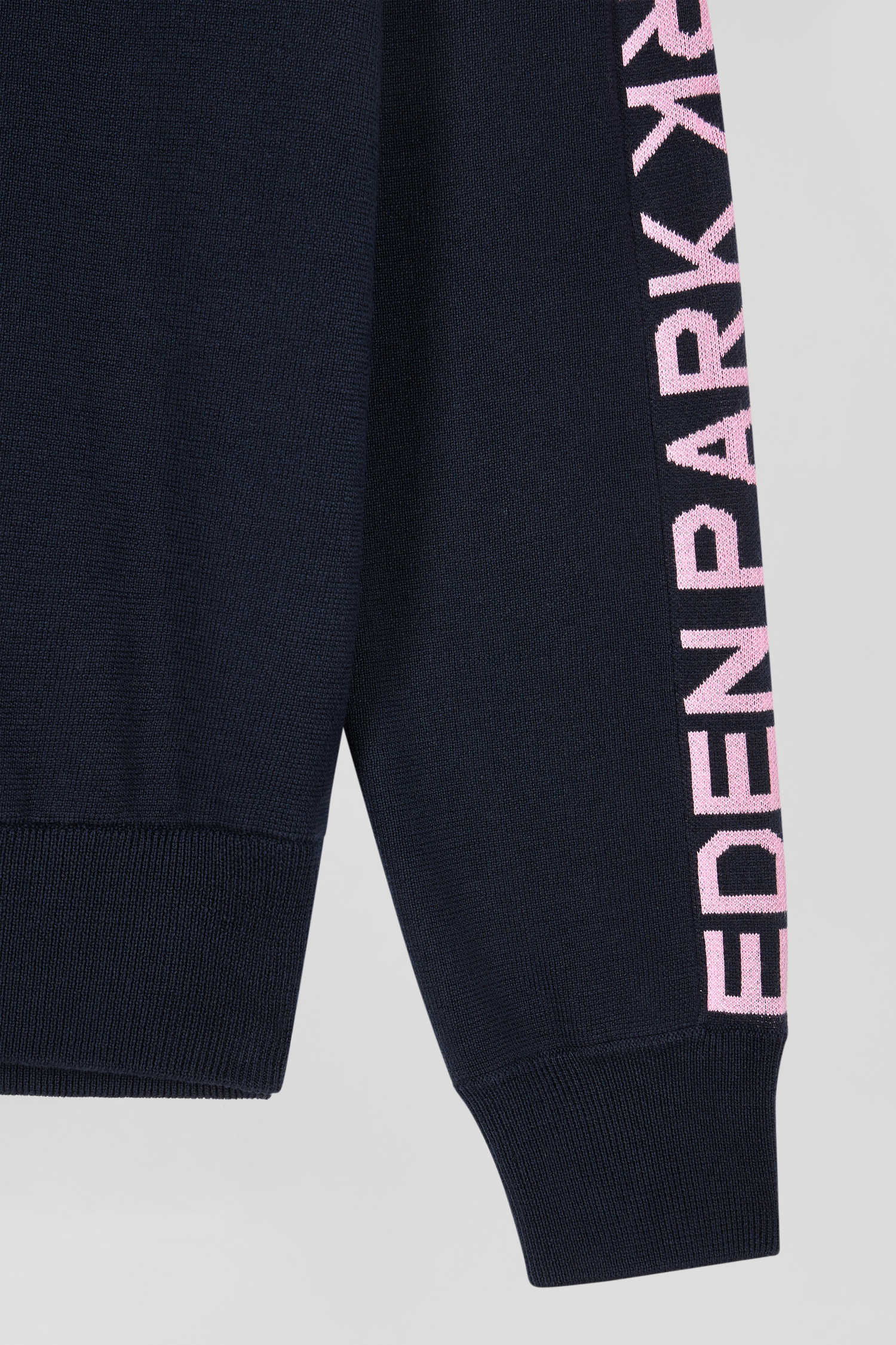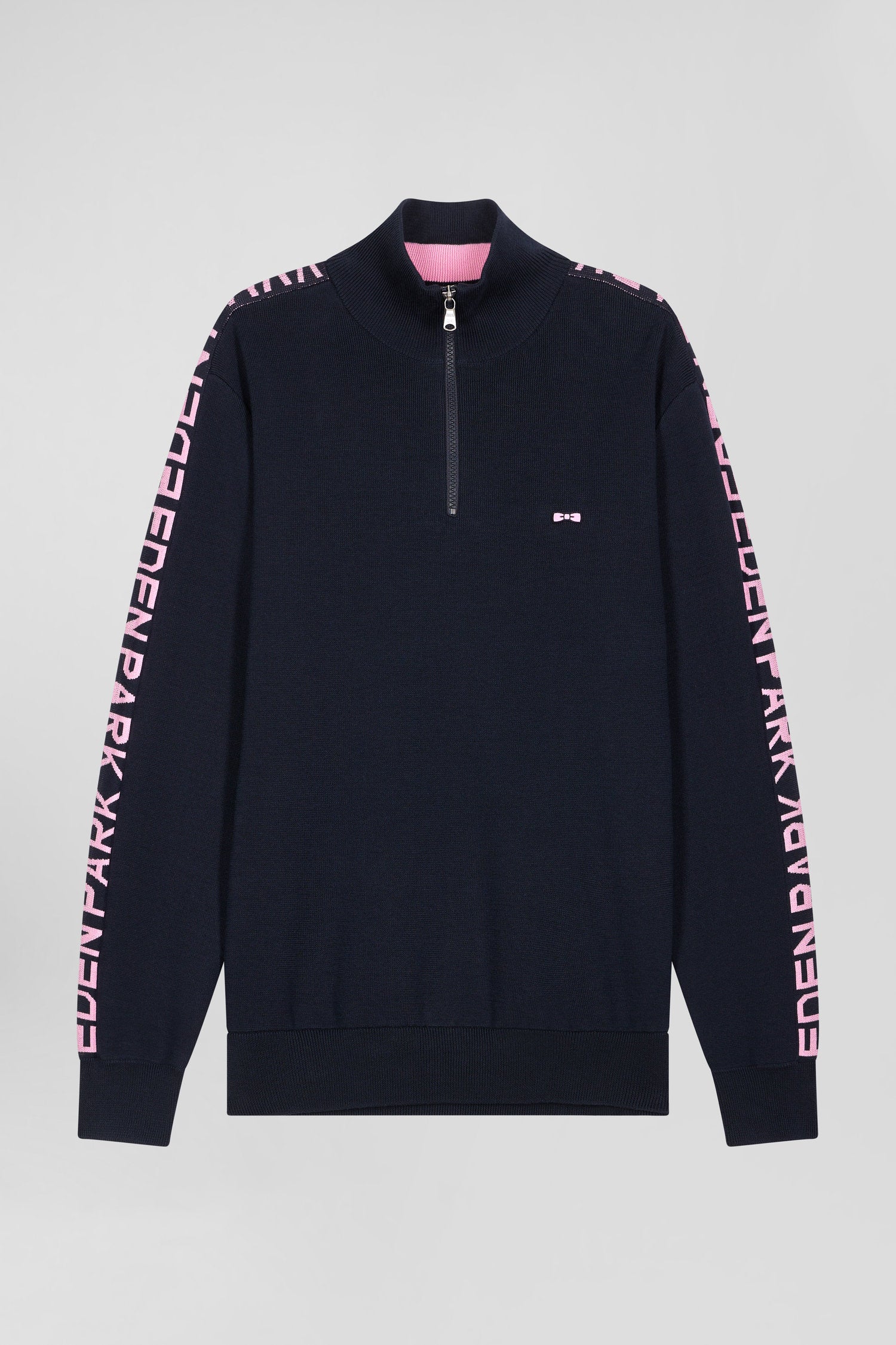 Featuring a zipped trucker collar with a striped interior and a jacquard band with the Eden Park name along the sleeves, this men's sweater promises a chic, athletic winter silhouette. Its knitted ribbed edges ensure that this navy blue cotton sweater stays in place.