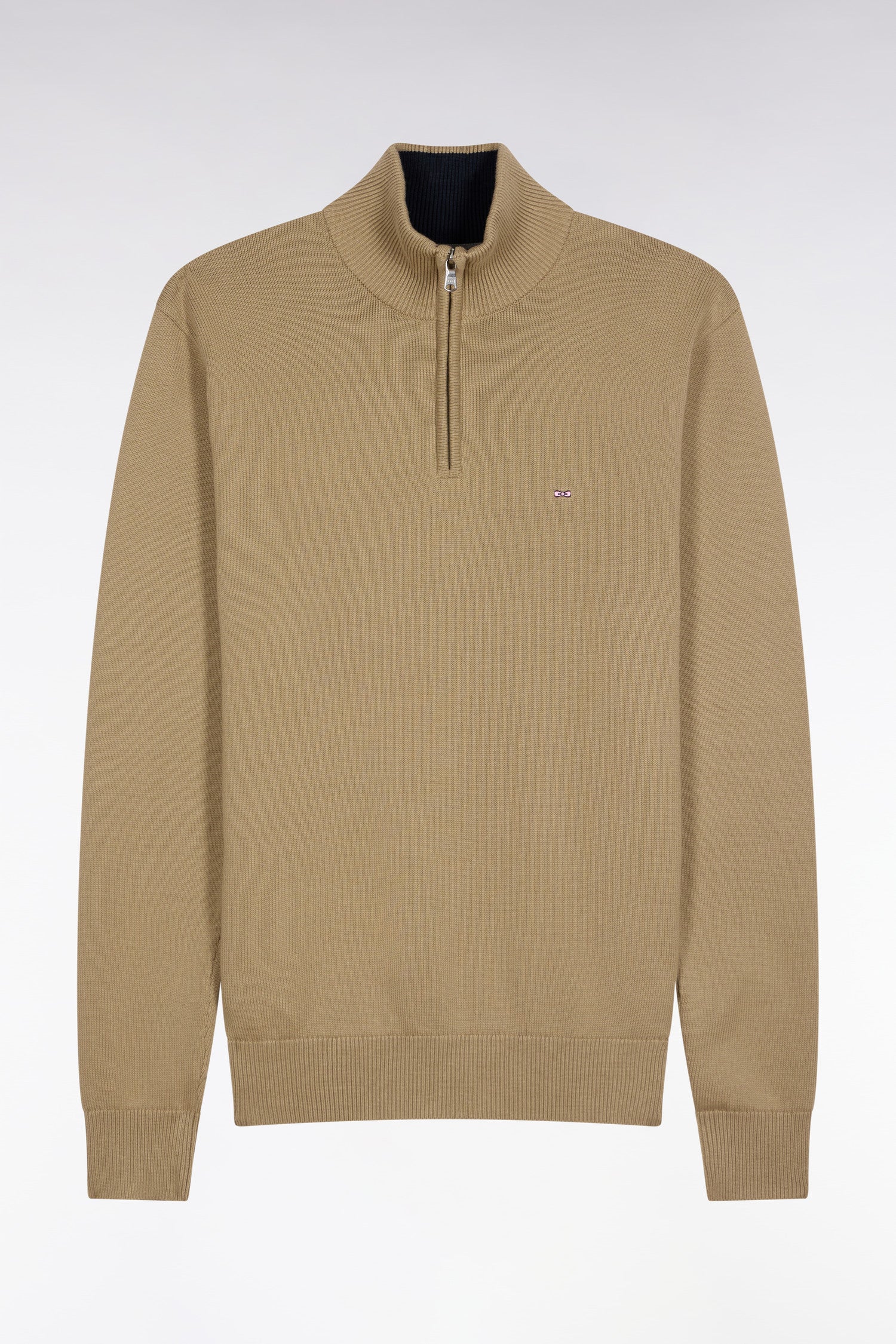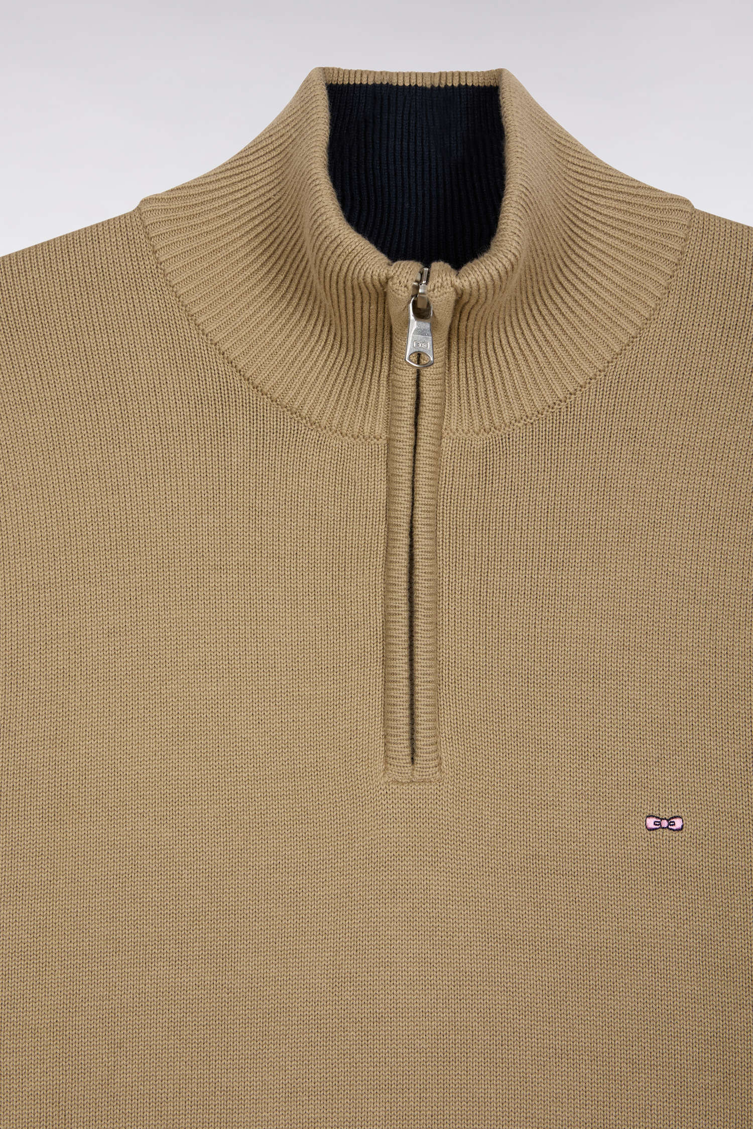 Designed for the first cold days, this men's zip-up trucker-neck sweater revisits our timeless model in a denser knit version. Made from 100% cotton, this semi-zipped sweater offers controlled warmth without sacrificing softness or breathability. Its high-zip collar allows you to modulate the look, closed for a structured silhouette or open for a more casual wear. Faithful to the DNA of our house, we feature the meticulous finishing touches that are the hallmark of Eden Park wardrobe essentials: bow-tie embroidery on the chest, knitted ribbing and rugby-striped half-moon inside.