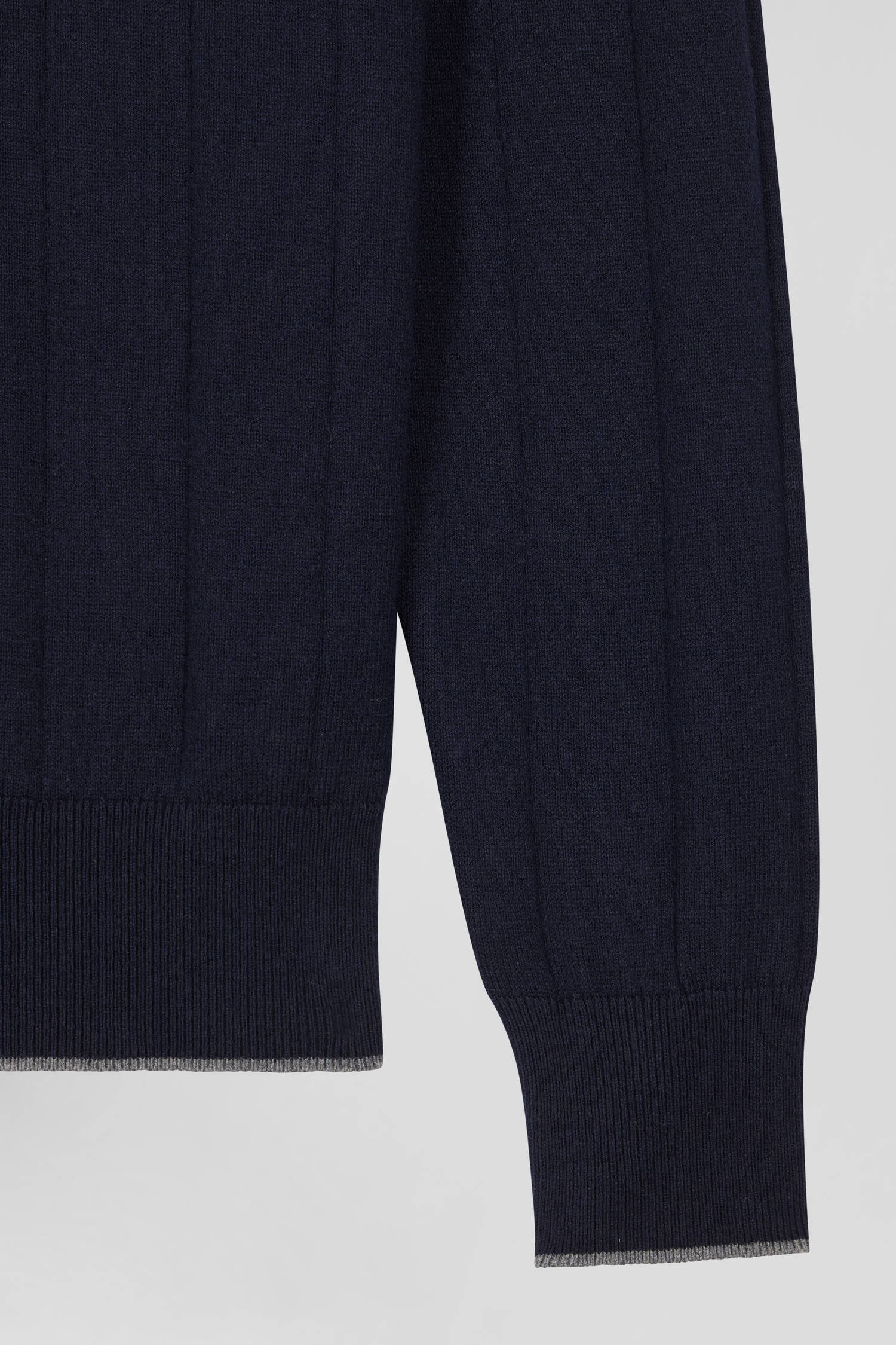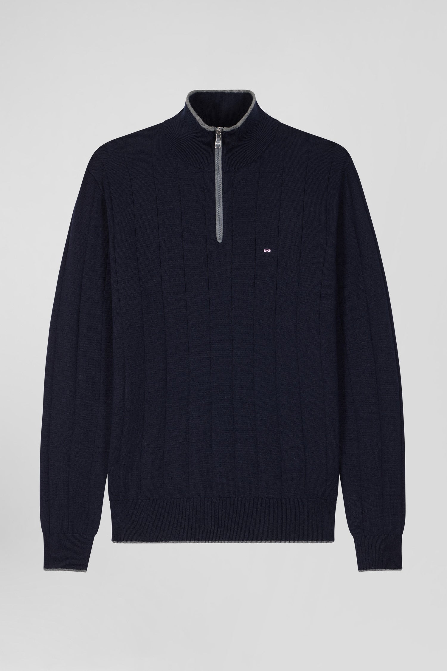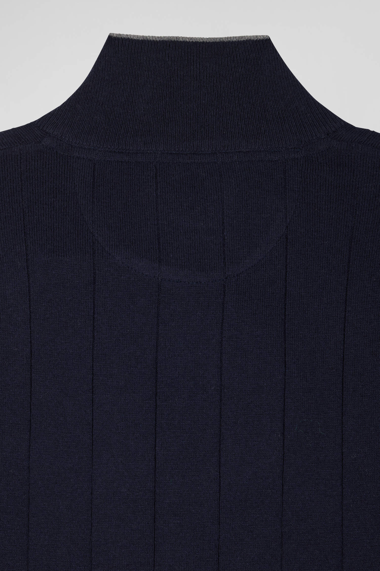Our men's sweater in cotton-cashmere jersey features a zipped trucker neck accented with fine contrasting piping. Knitted in flat ribbing, this masculine sweater pays homage to rugby's emblematic hooped stripe, skilfully reworked vertically for a modern touch. Careful finishing touches, such as the knitted ribbon inside the collar, make this sweater, available in navy or gray, the perfect piece to add a touch of casual sophistication to your wardrobe.