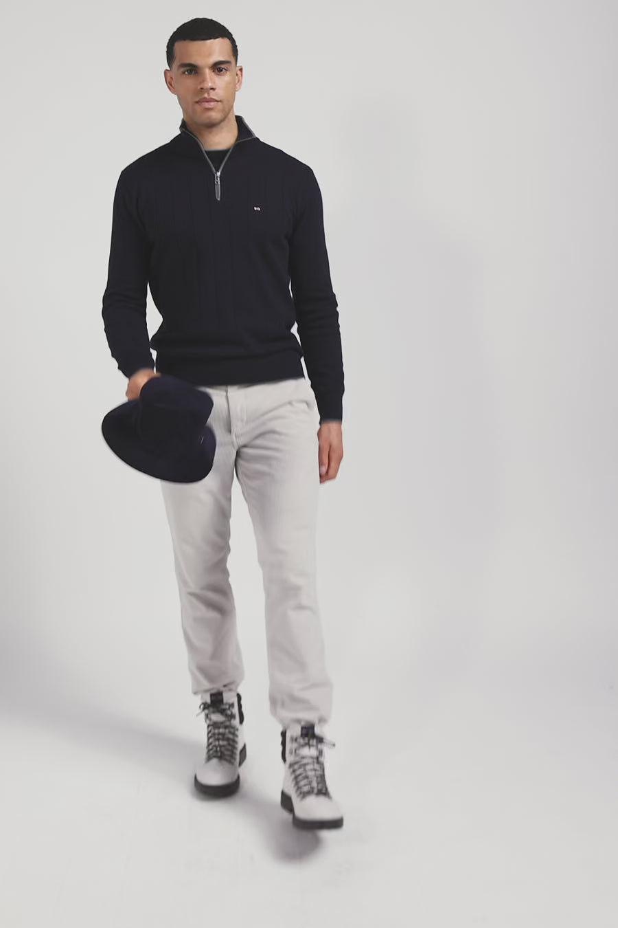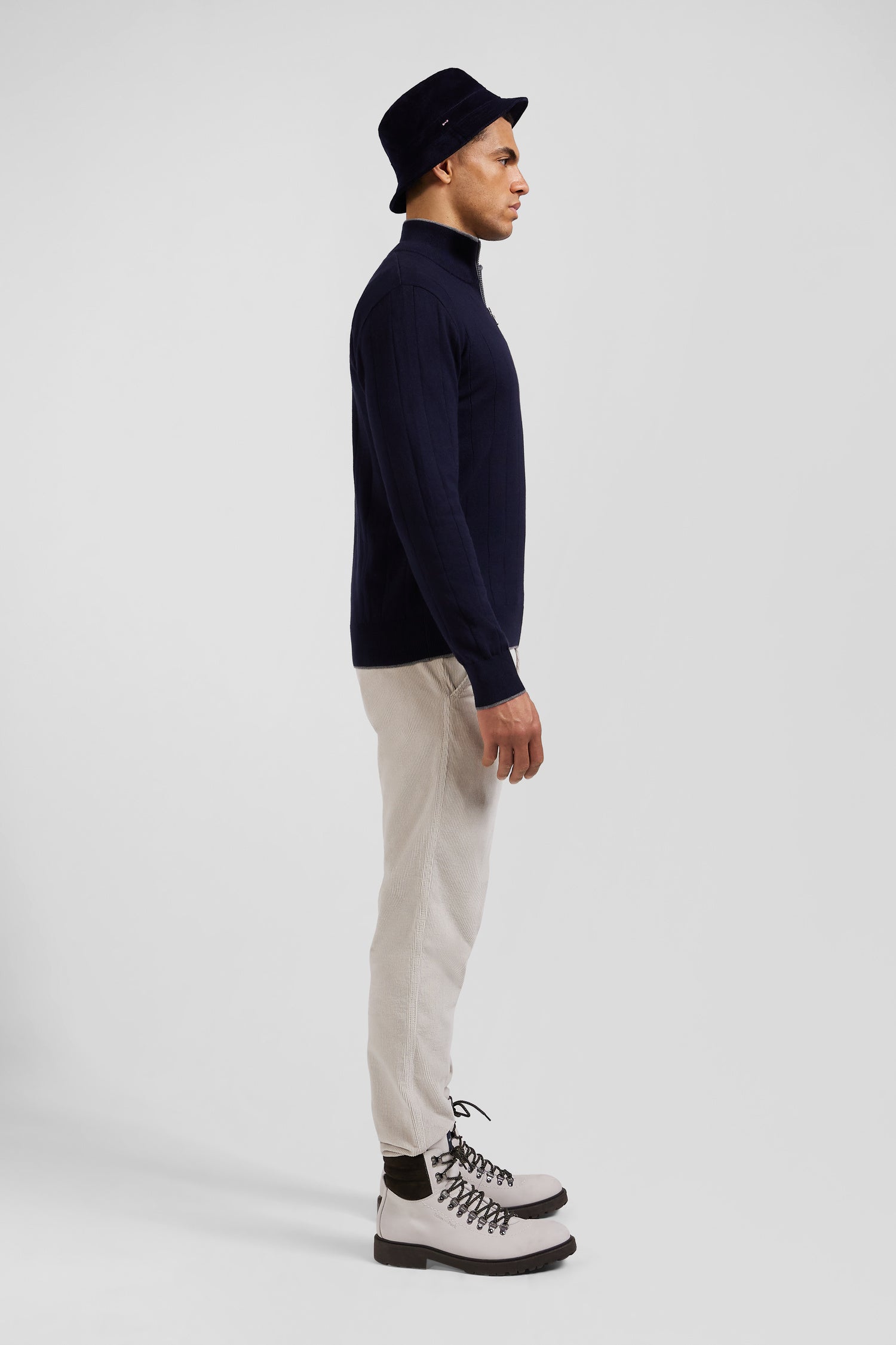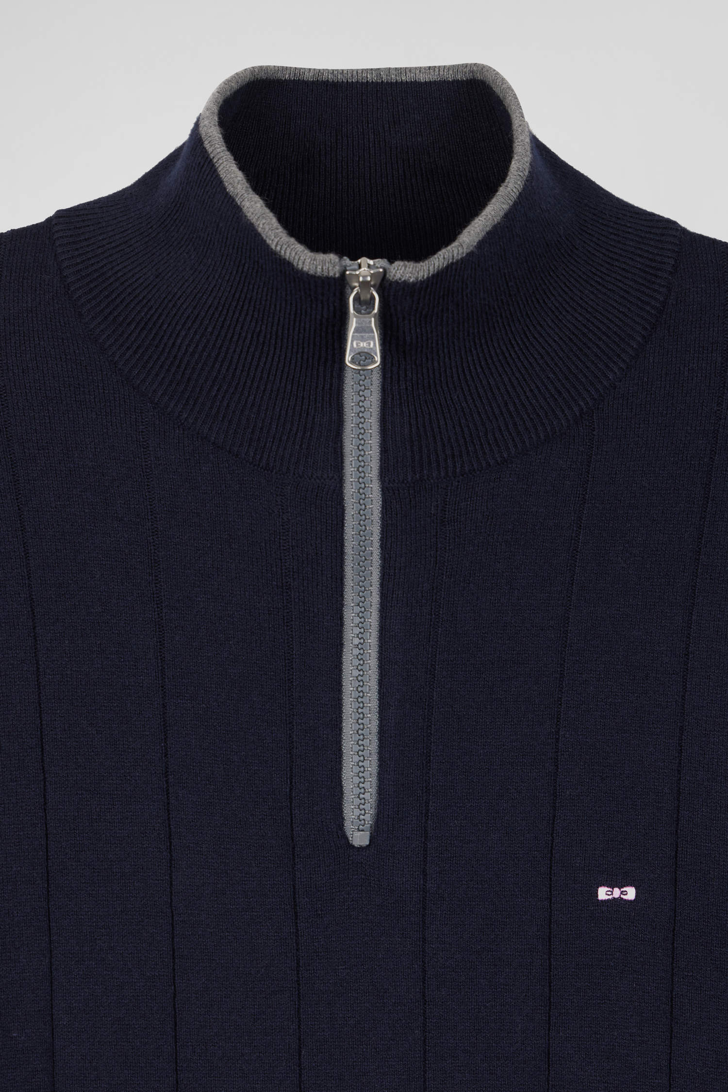 Our men's sweater in cotton-cashmere jersey features a zipped trucker neck accented with fine contrasting piping. Knitted in flat ribbing, this masculine sweater pays homage to rugby's emblematic hooped stripe, skilfully reworked vertically for a modern touch. Careful finishing touches, such as the knitted ribbon inside the collar, make this sweater, available in navy or gray, the perfect piece to add a touch of casual sophistication to your wardrobe.