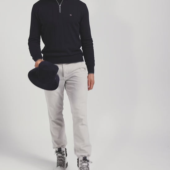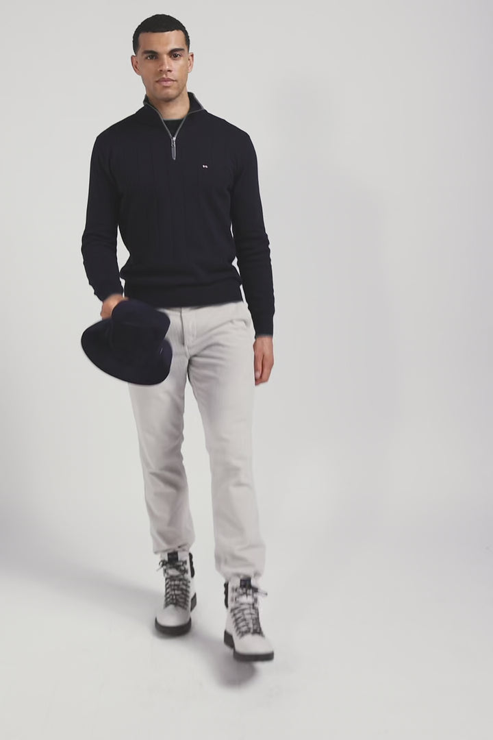 Regular navy blue semi-zipped cotton and cashmere jumper