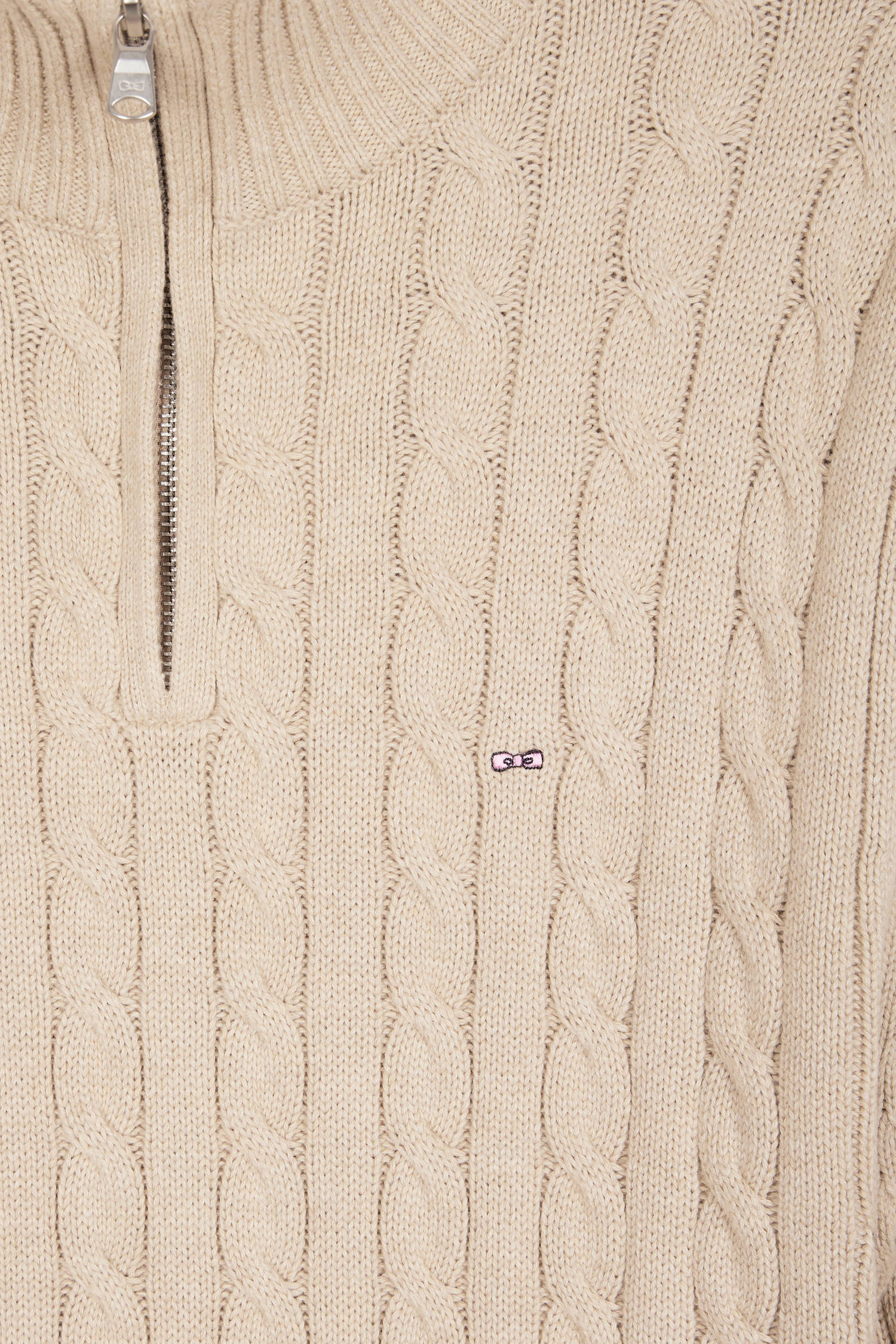 With its zipped stand-up collar and twisted knit, this pure cotton sweater has a trendy, preppy look. Its meticulous finishing and knitwork give depth to this piece, designed to combine comfort and elegance all day long. Available in 4 timeless colors: beige, navy, gray or brown, this cable-knit sweater is a must-have for men's wardrobes, whether worn alone or layered over a shirt.