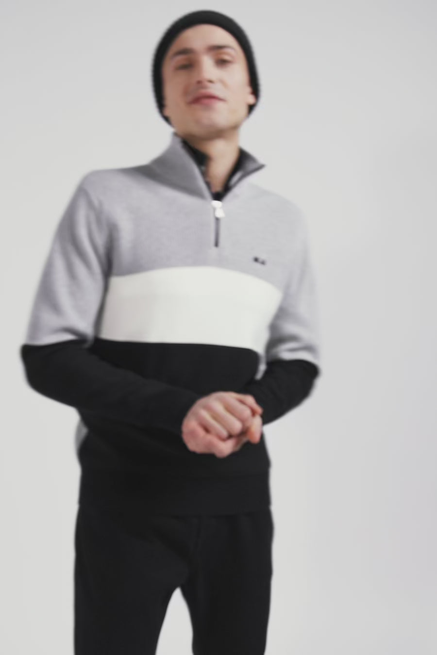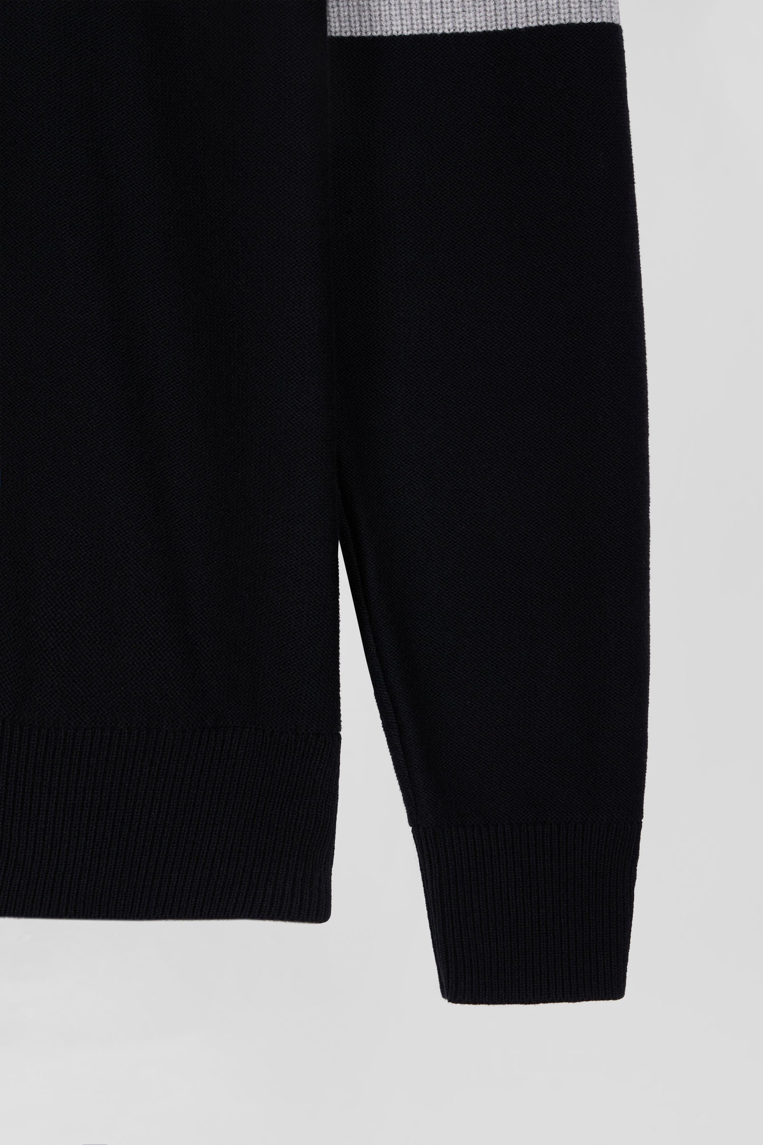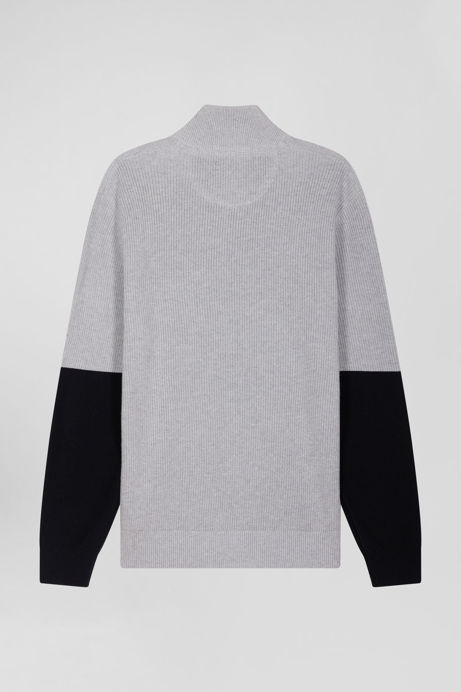 This zip-up stand-up collar sweater reveals meticulous finishes like its elegant vertical stripes on the inside, its jersey half-moon and the tricolored knit detail that enrich its interior with distinction. Alternating pearl ribbing, reverse jersey and Ottoman stitch create a subtle contrast, offering a versatile piece in three timeless shades for everyday style.
